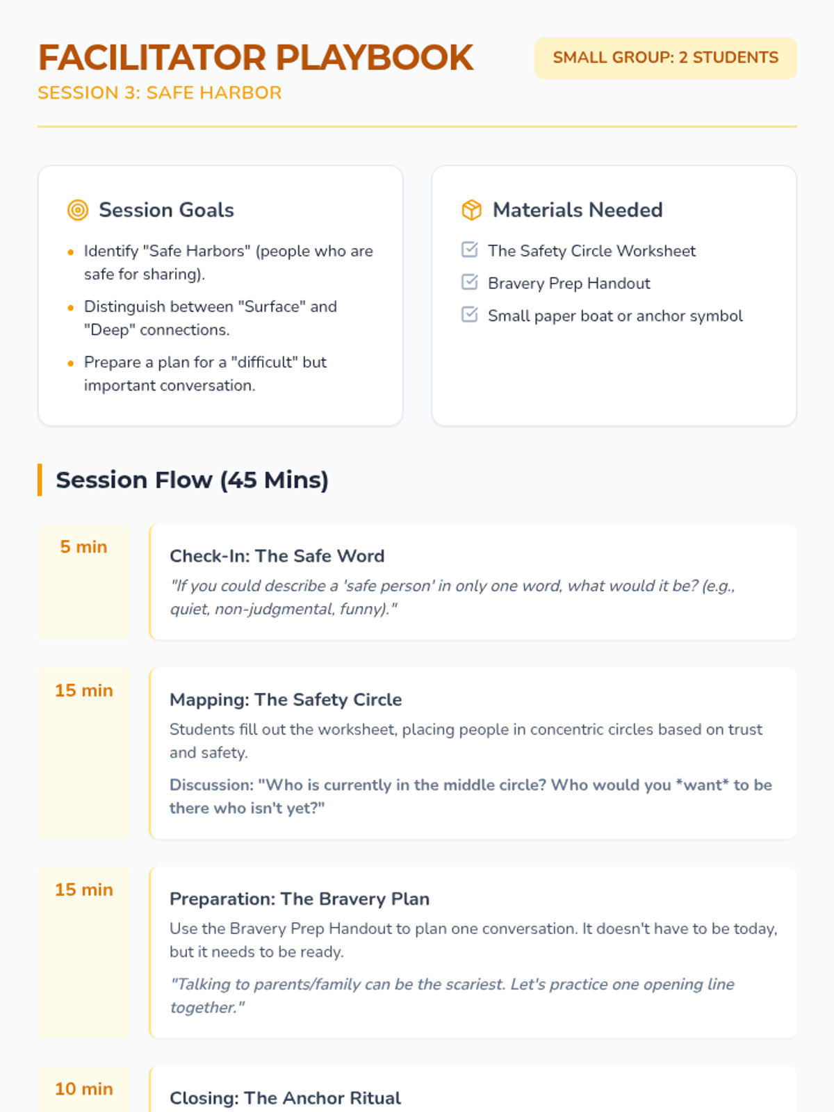 A 6-session counseling group designed to help students identify triggers, understand physical symptoms of anxiety, and build a personalized toolkit of coping strategies through a 'Calm Explorer' theme.