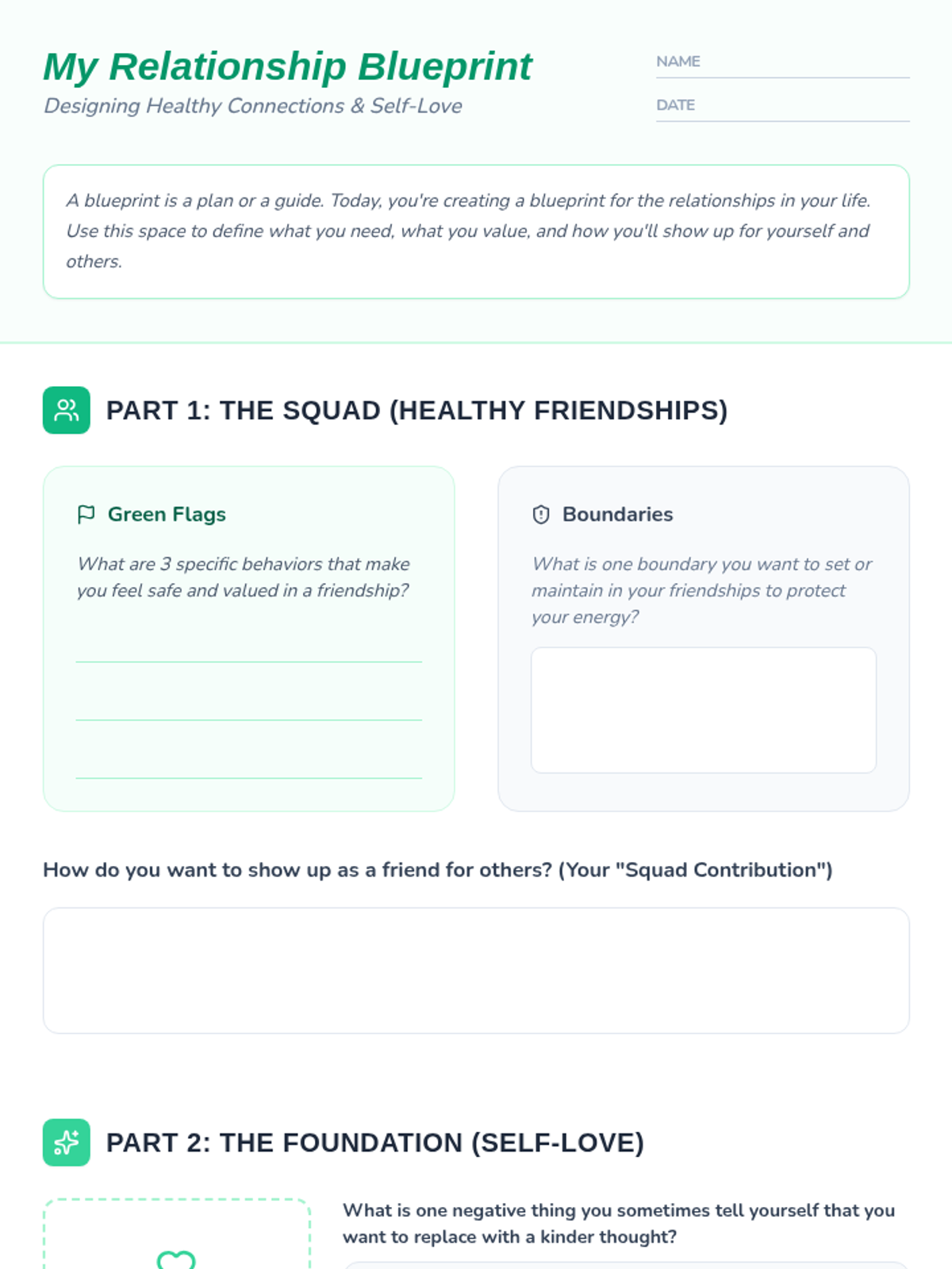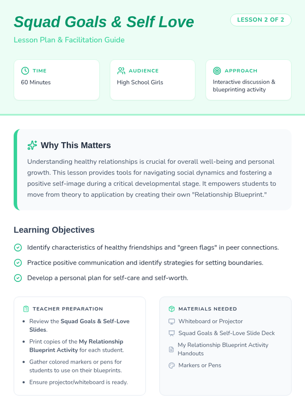 A two-part sequence for high school girls exploring the foundations of healthy relationships, encompassing friendships, romantic connections, and self-love. It provides tools for identifying green flags, setting boundaries, and cultivating self-respect.