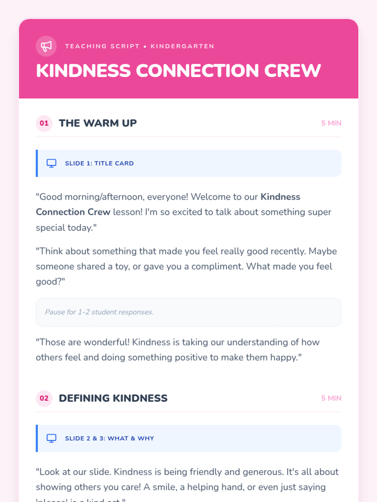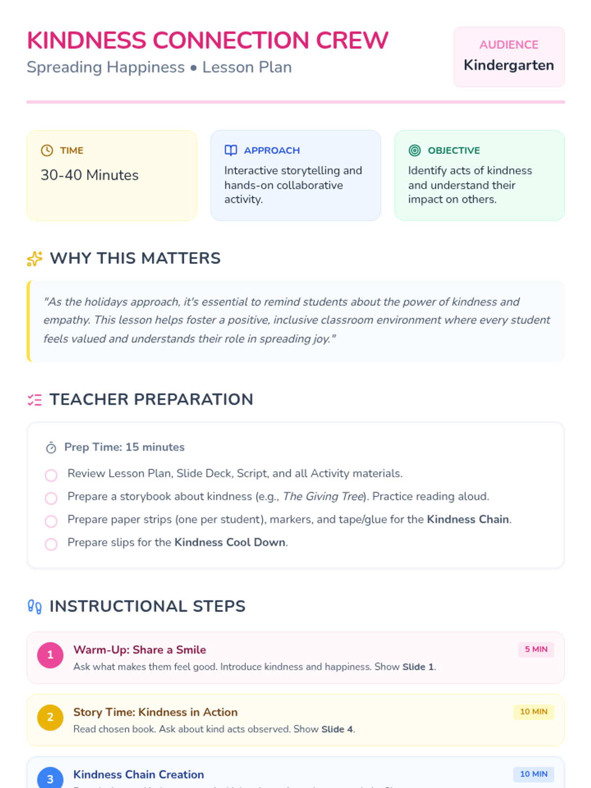 A classroom sequence designed to build empathy and kindness through interactive scenarios and collaborative activities, tailored for 4th-grade and Kindergarten students.