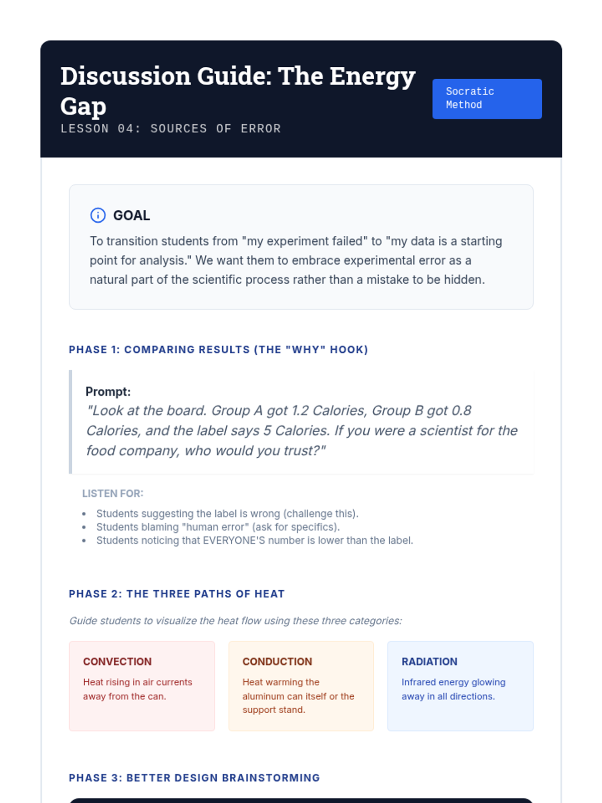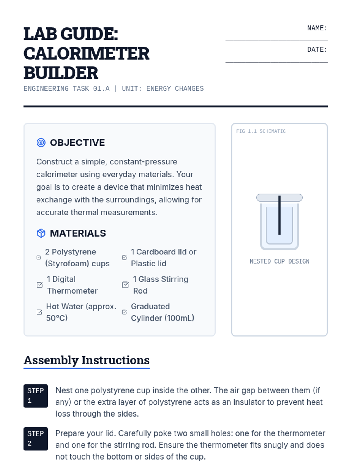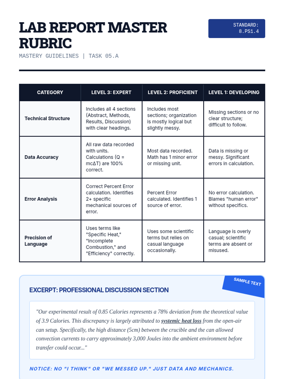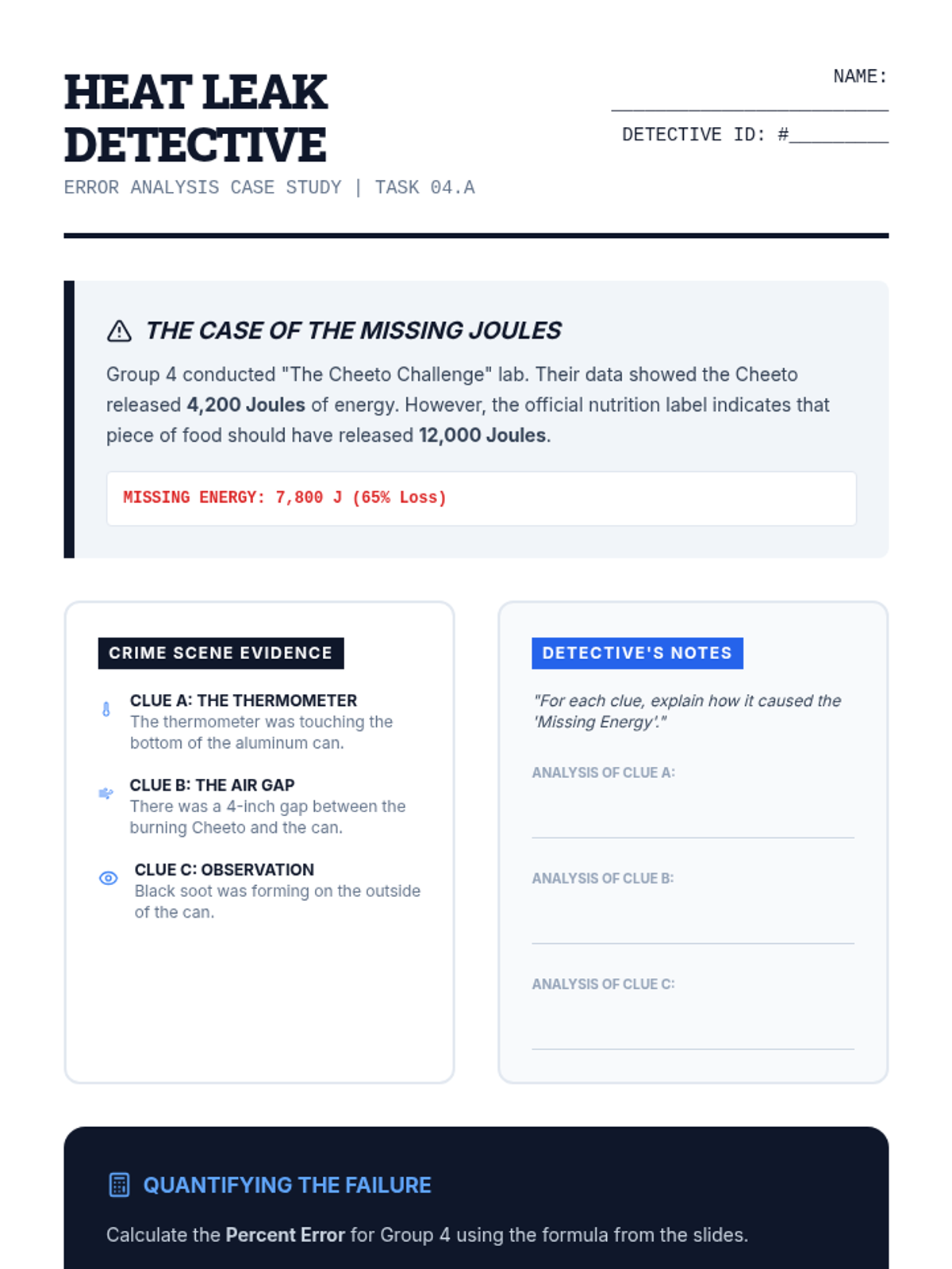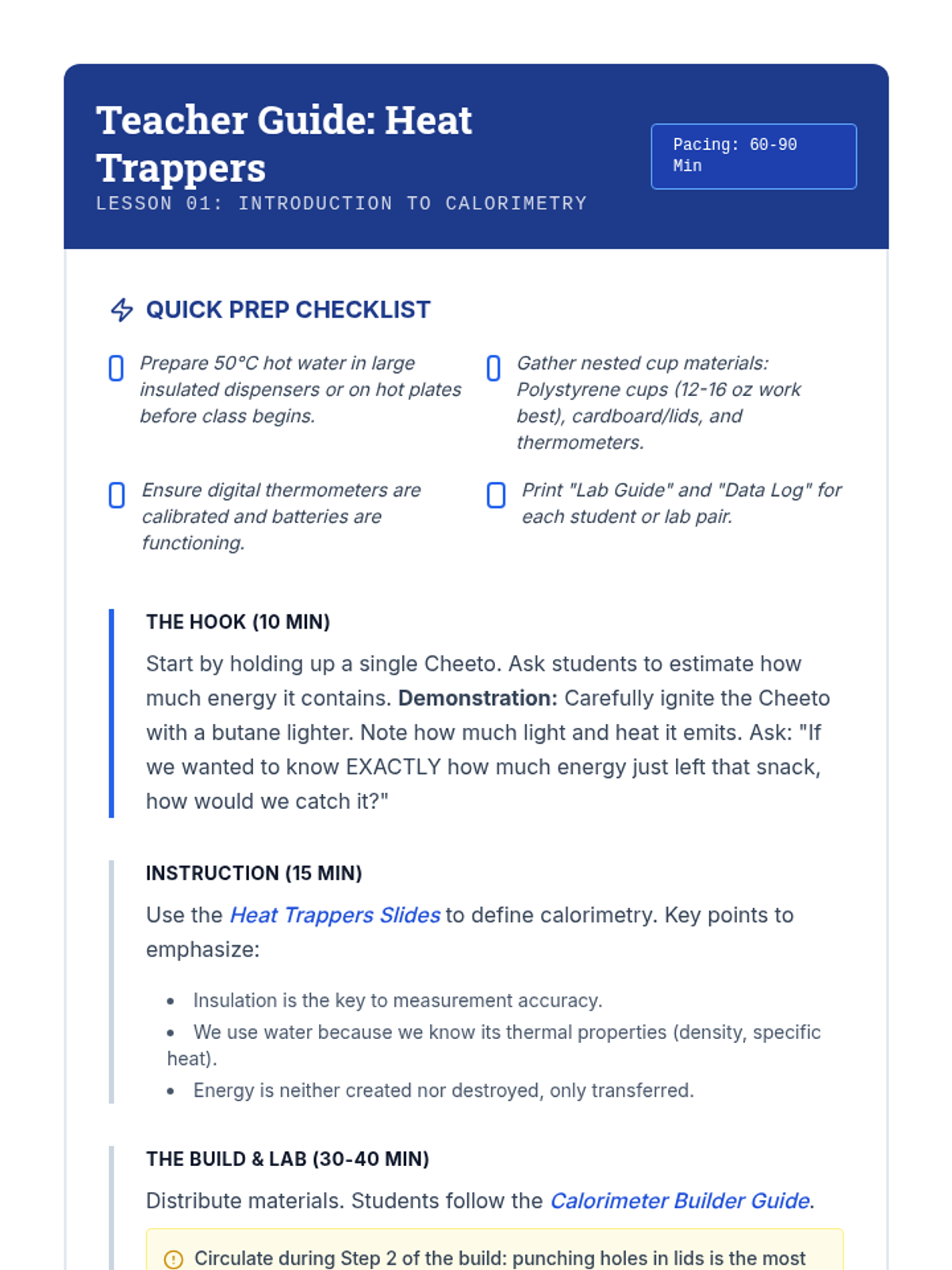 A lab-focused sequence for 8th-grade students on the science of calorimetry. Students develop technical skills in measuring thermal energy transfer, understand specific heat capacity, and perform energy analysis on food while identifying sources of experimental error.