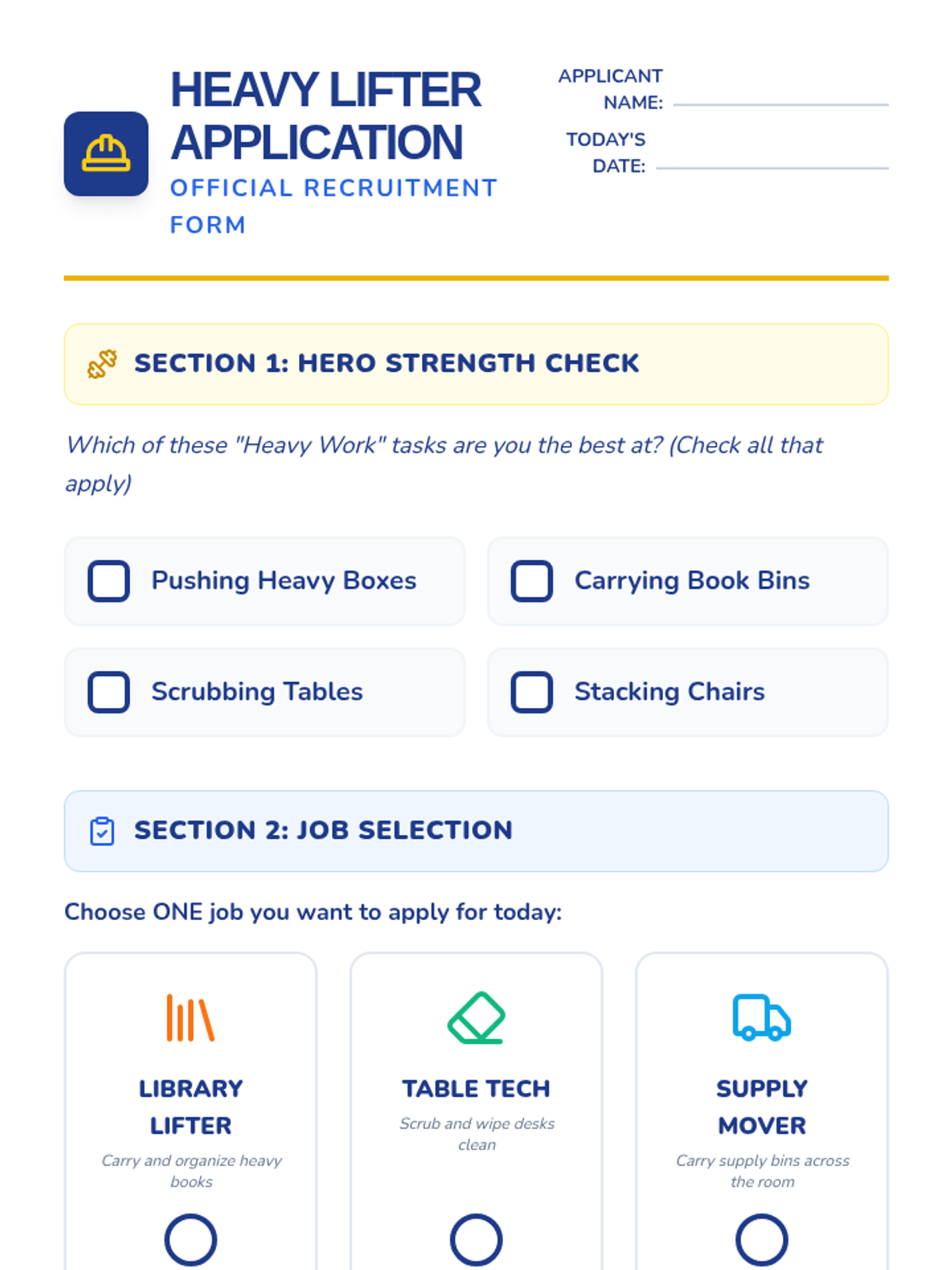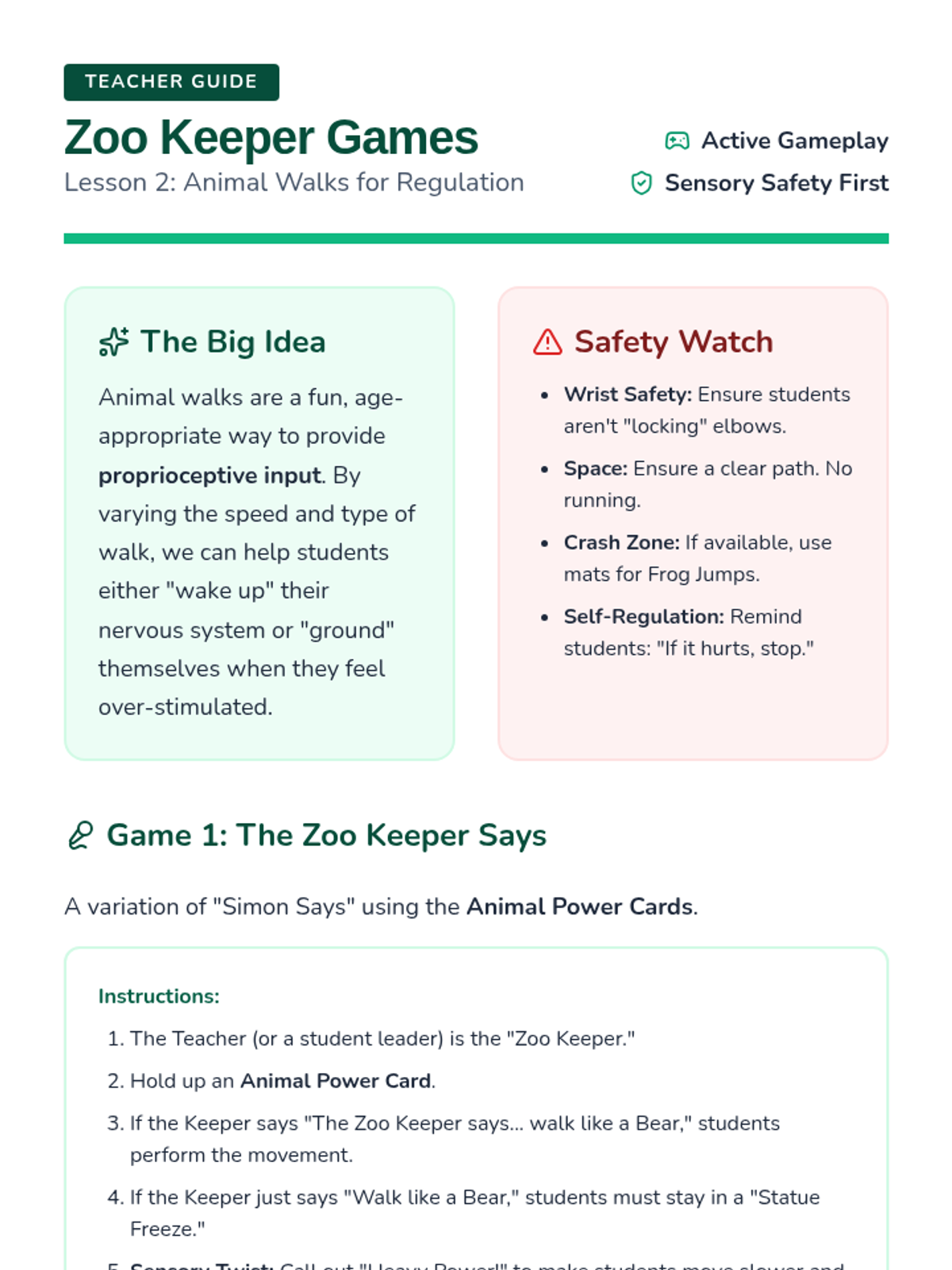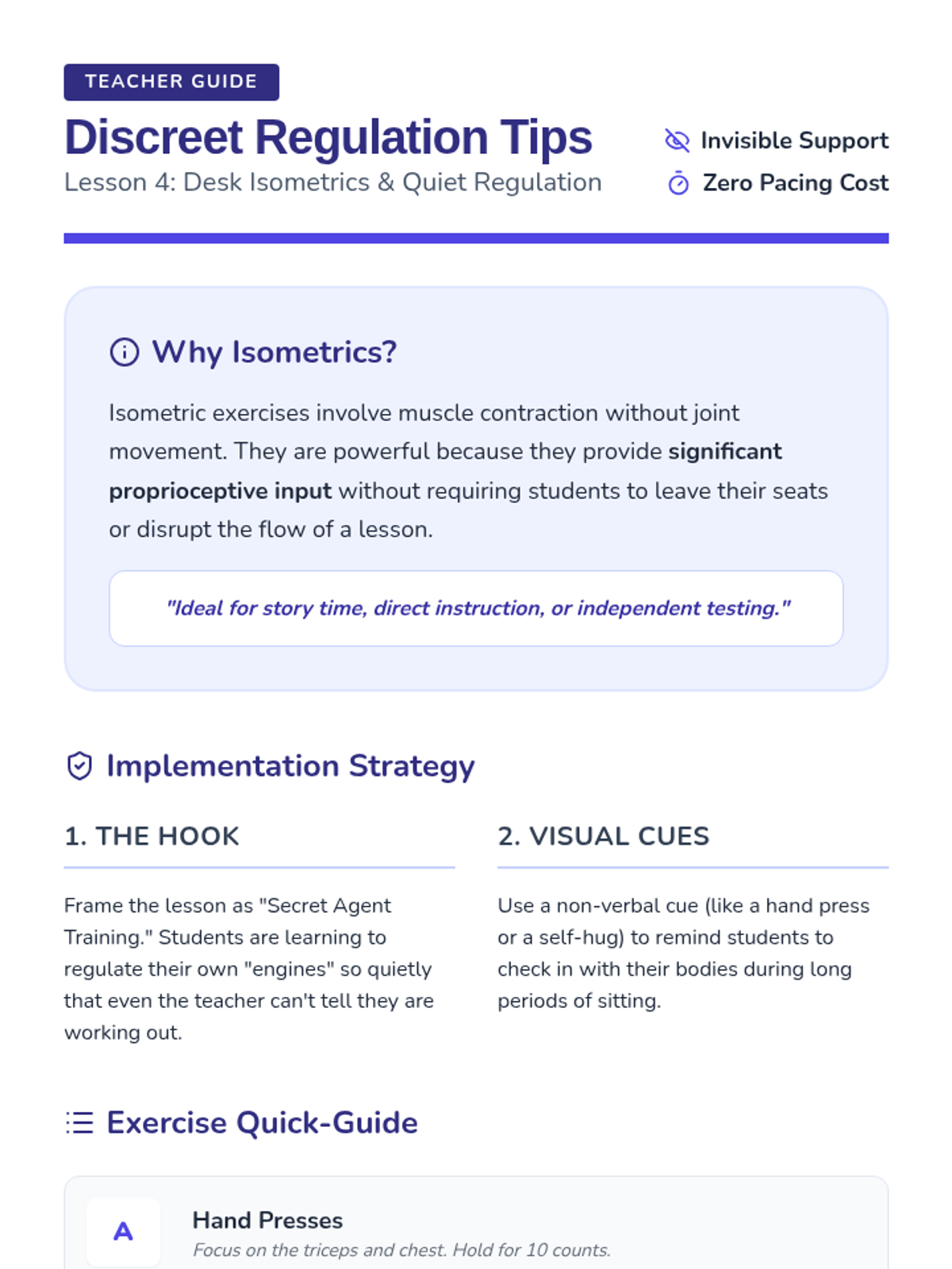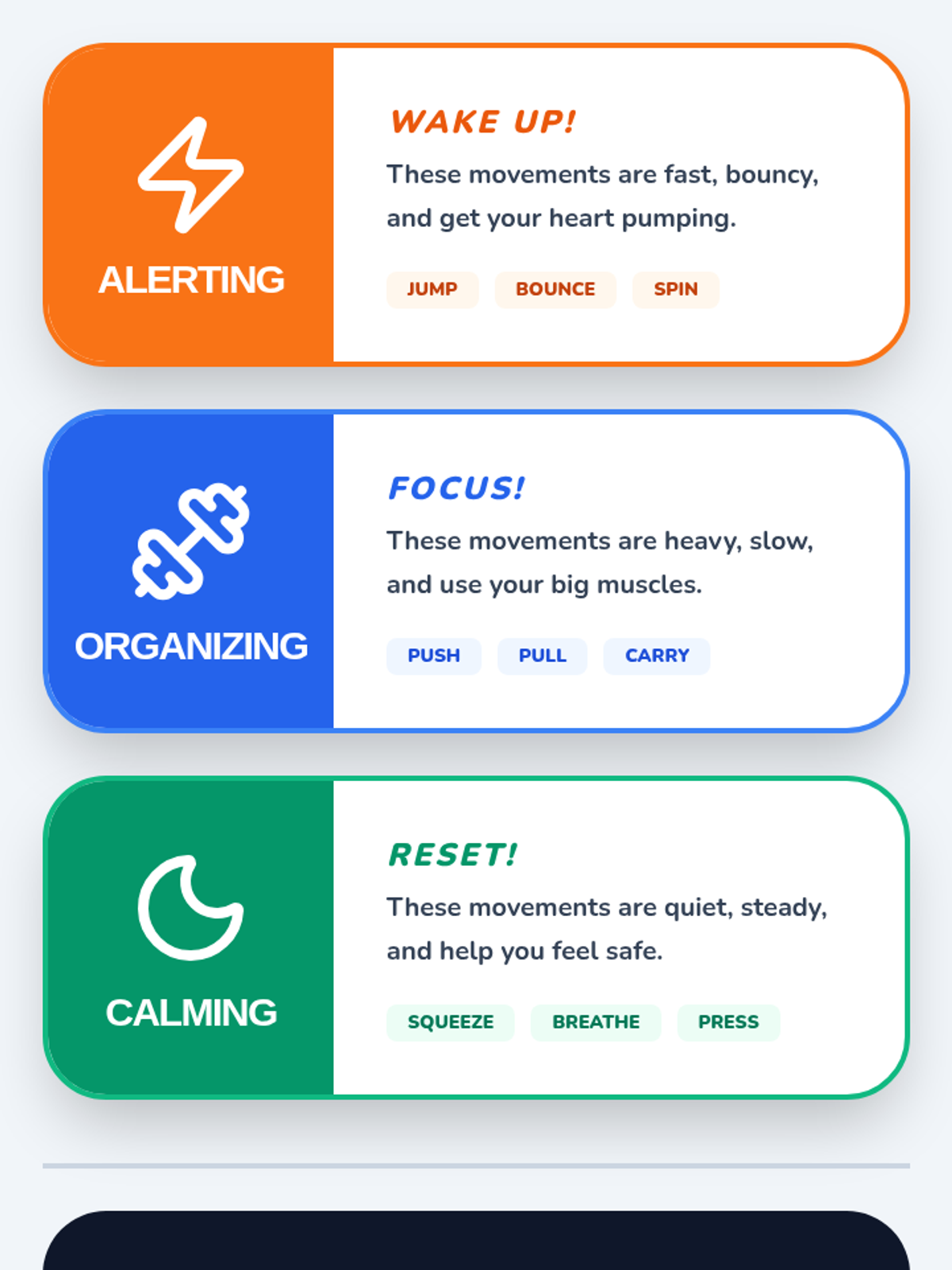 A sequence for 2nd Grade students focused on using proprioceptive input (heavy work) to regulate the nervous system and improve focus. Students learn to identify how muscle work affects their brain and transition from teacher-led activities to functional classroom routines.