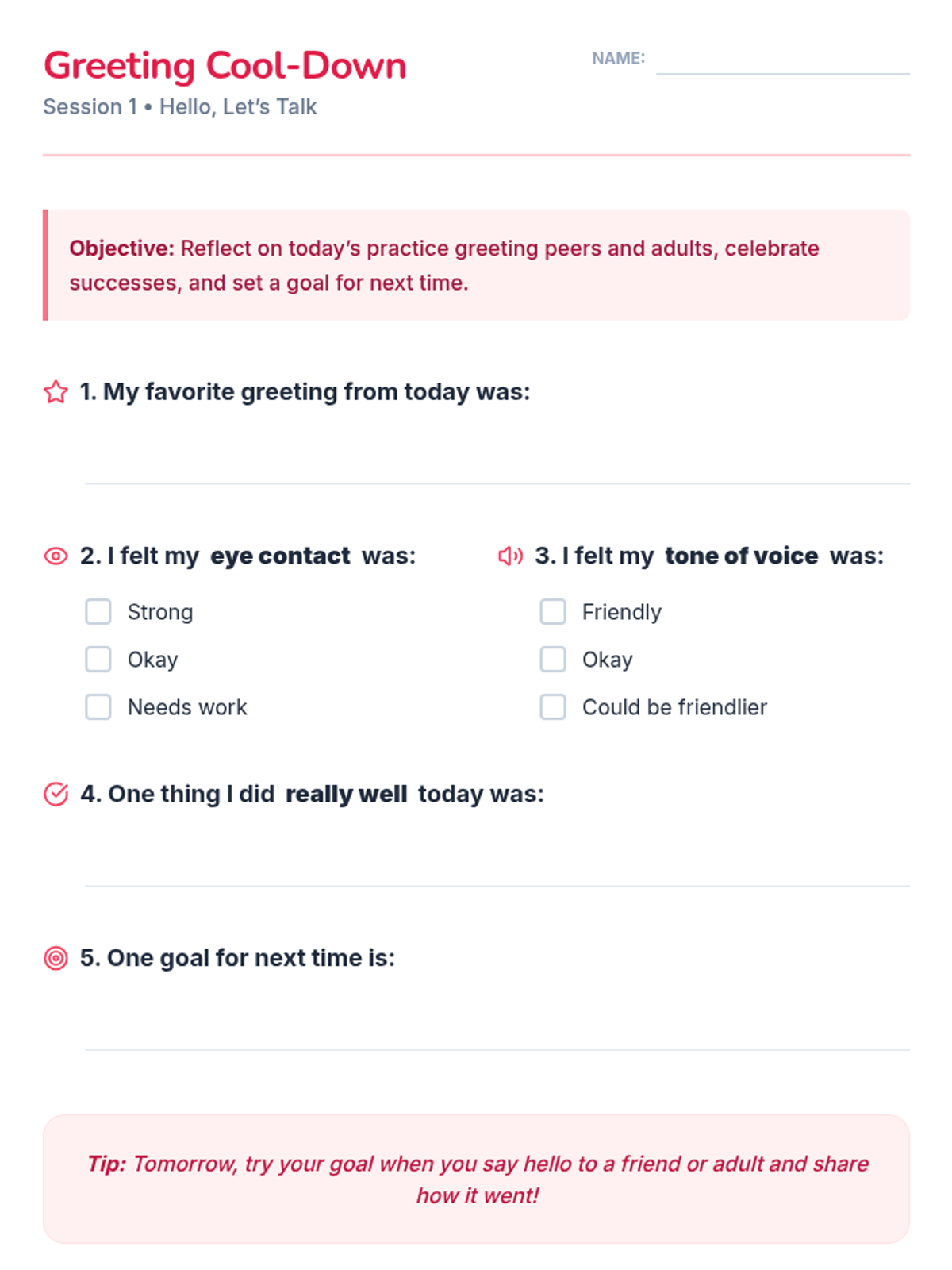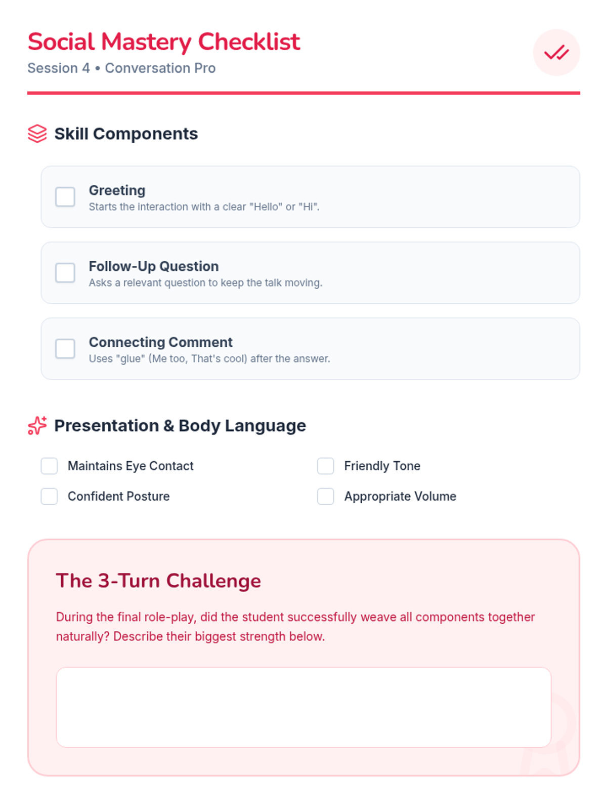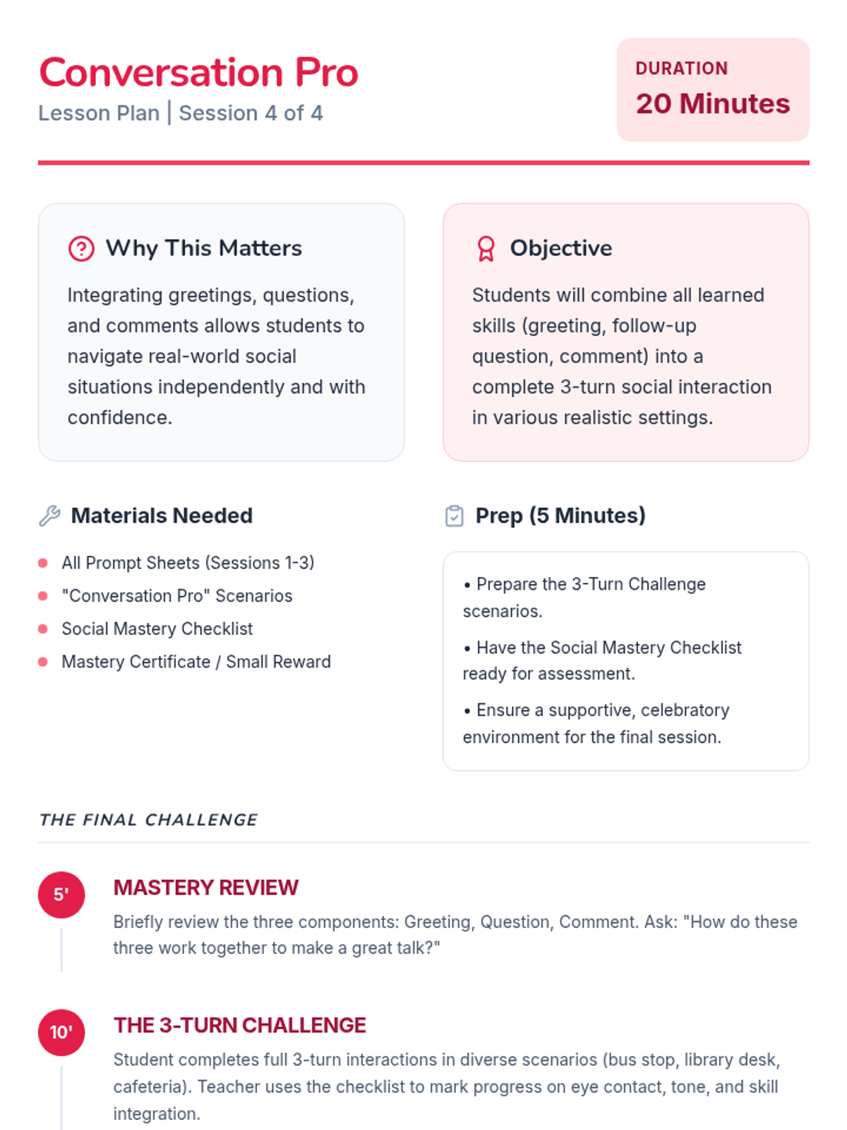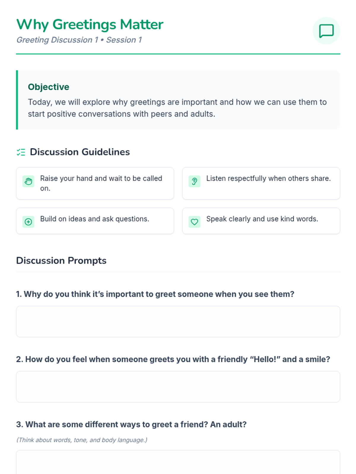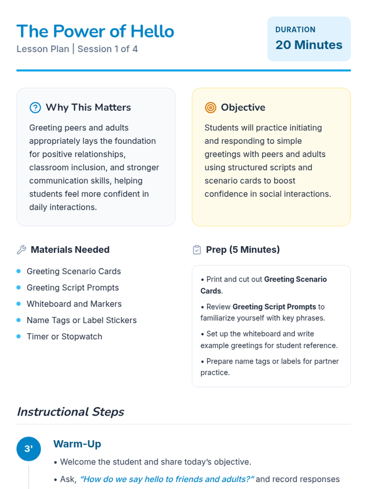 A 4-session, individualized program to help 4th-grade students confidently initiate greetings and conversations with peers and adults through modeling, role-play, and guided practice.