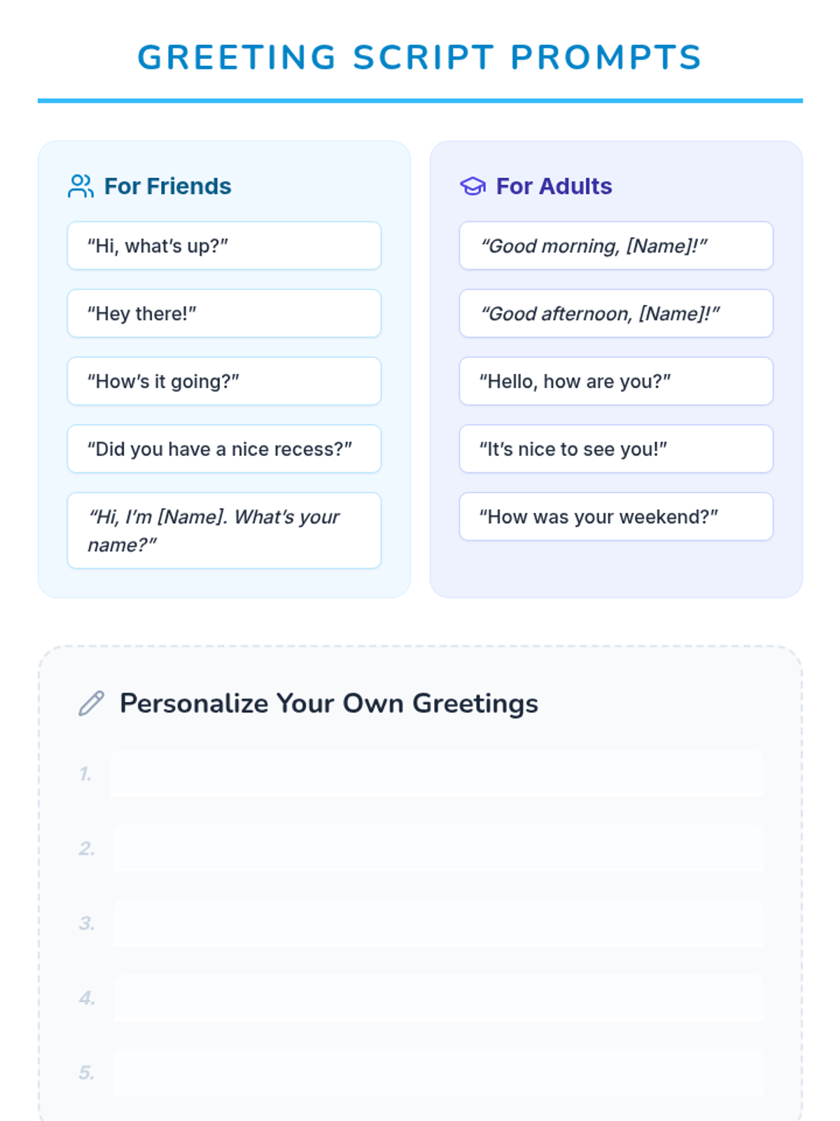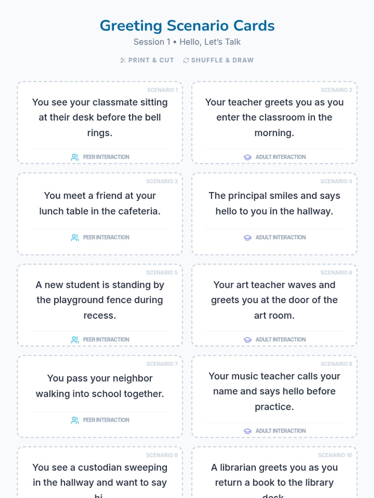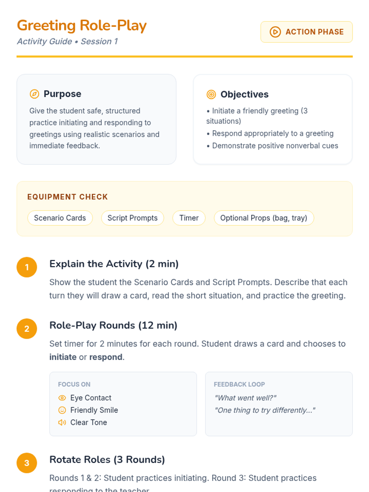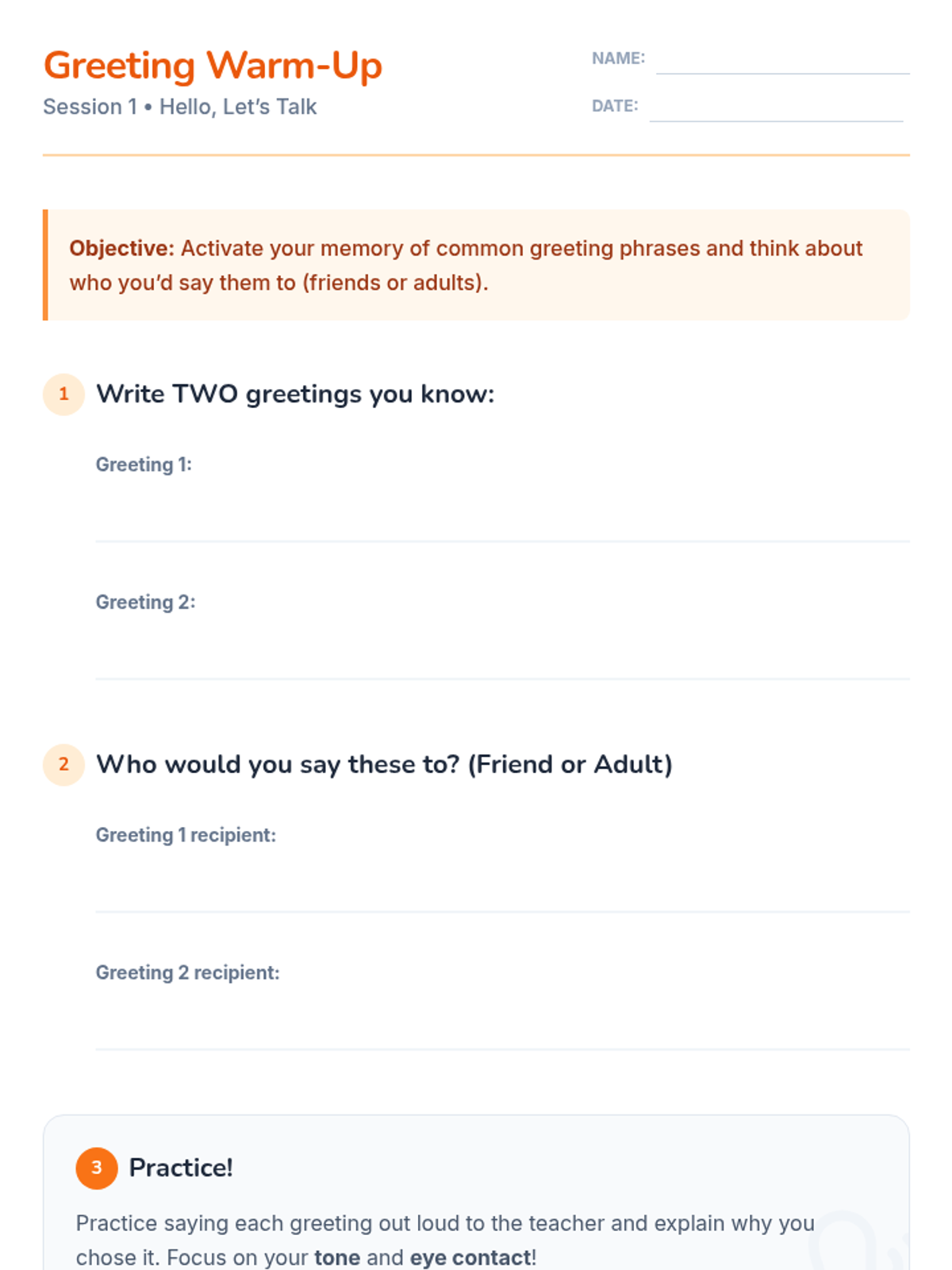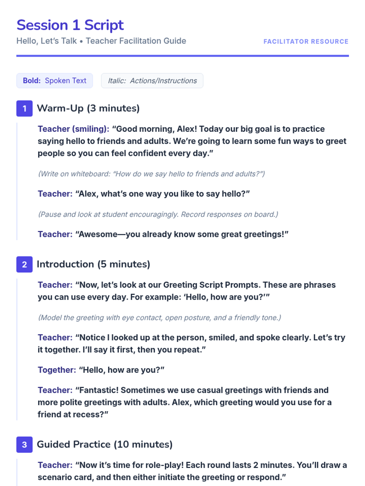 A 4-session, individualized program to help 4th-grade students confidently initiate greetings and conversations with peers and adults through modeling, role-play, and guided practice.