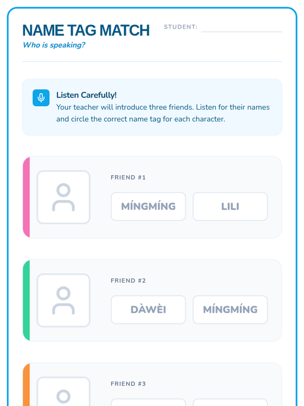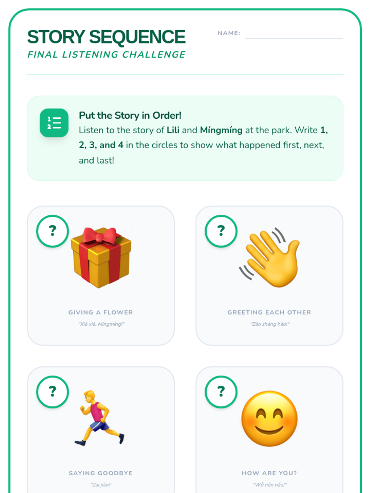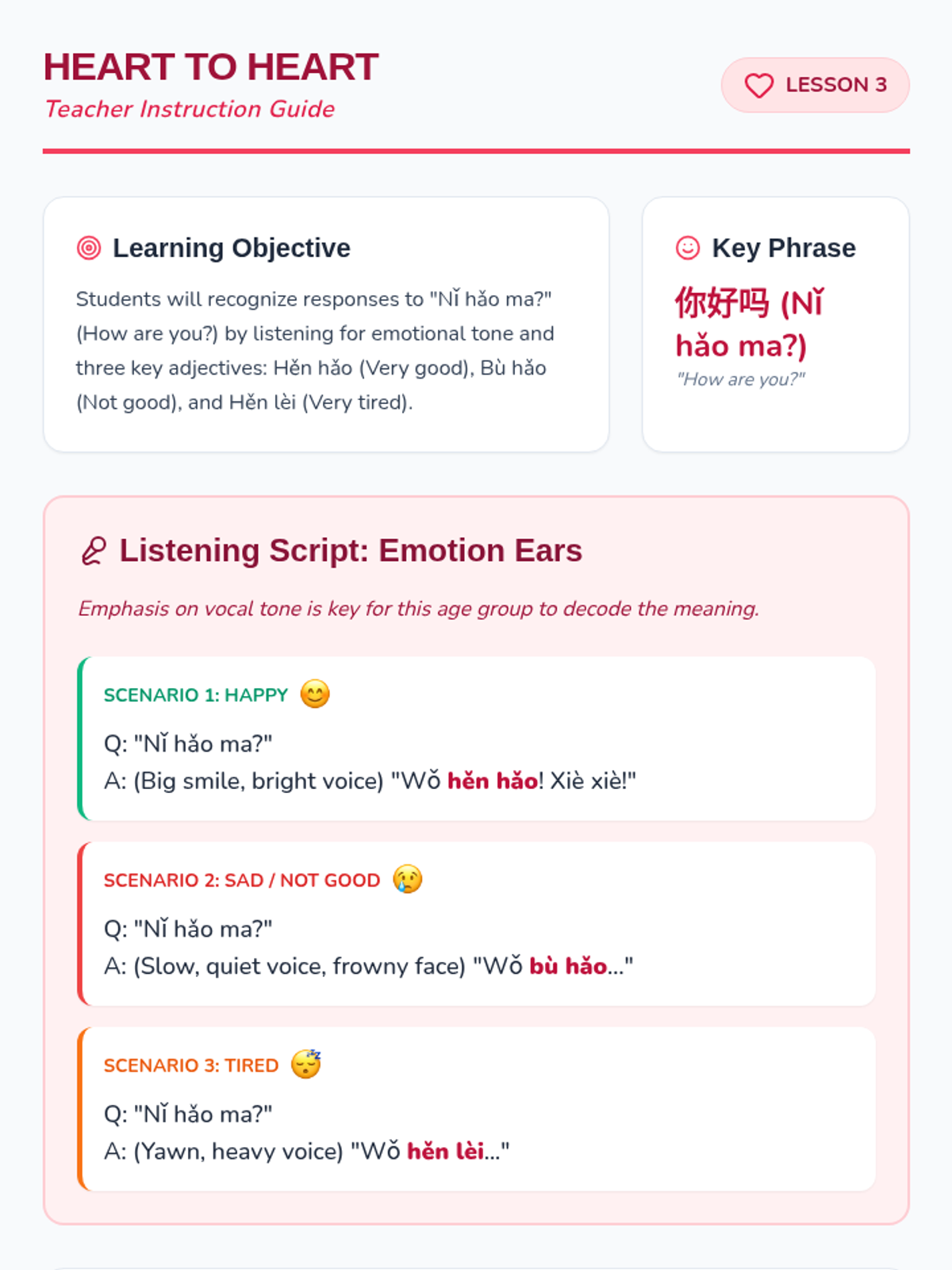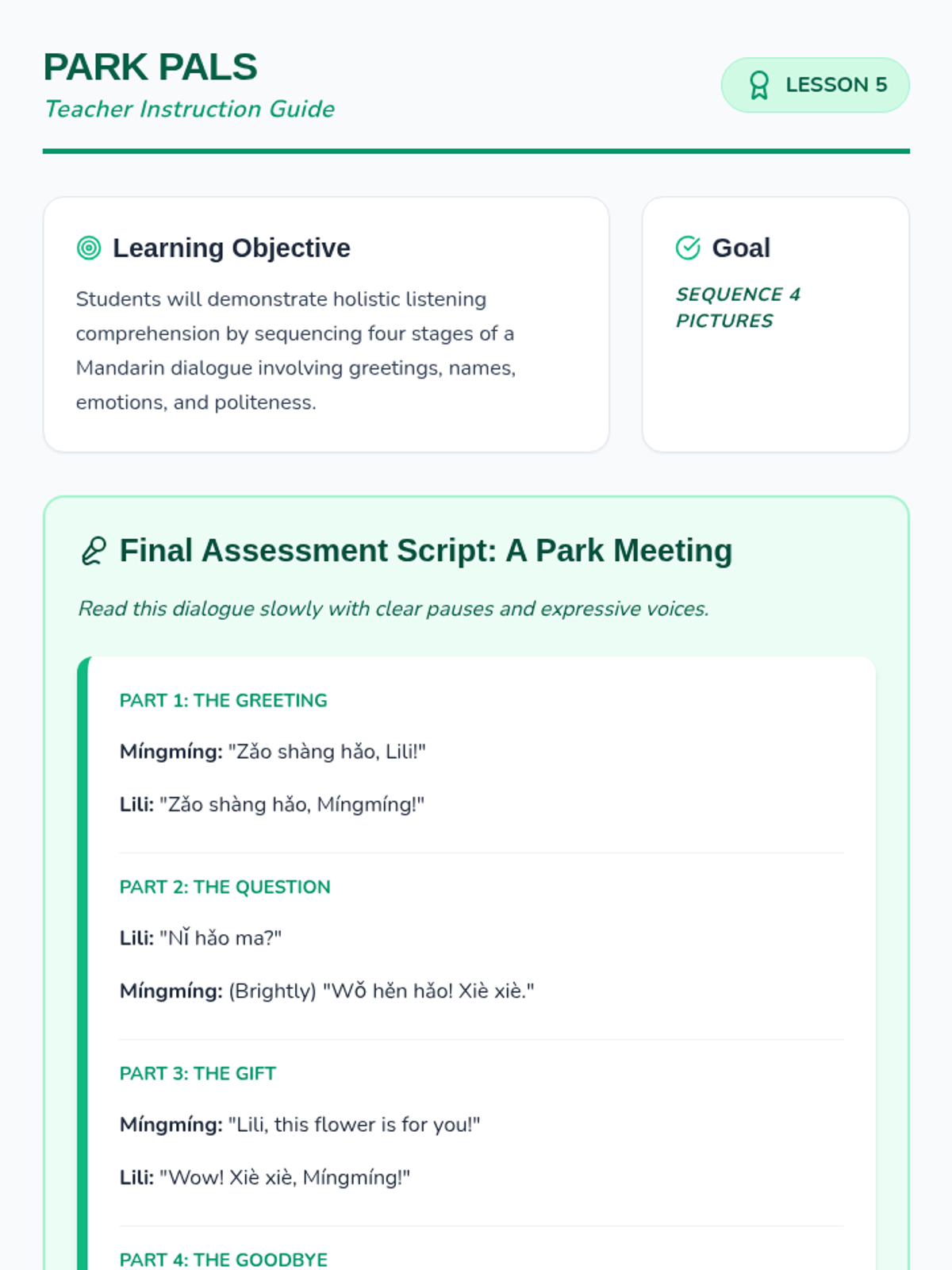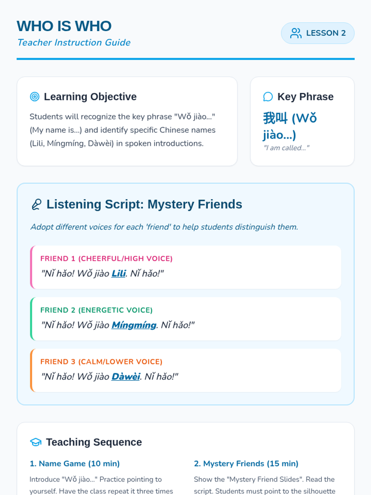A foundational Mandarin Chinese sequence for 2nd graders focusing on greetings, introductions, and emotional expression through listening. Students develop auditory recognition of temporal greetings, names, and social cues within simple dialogues.
