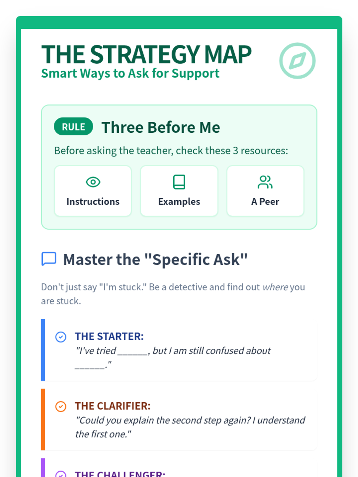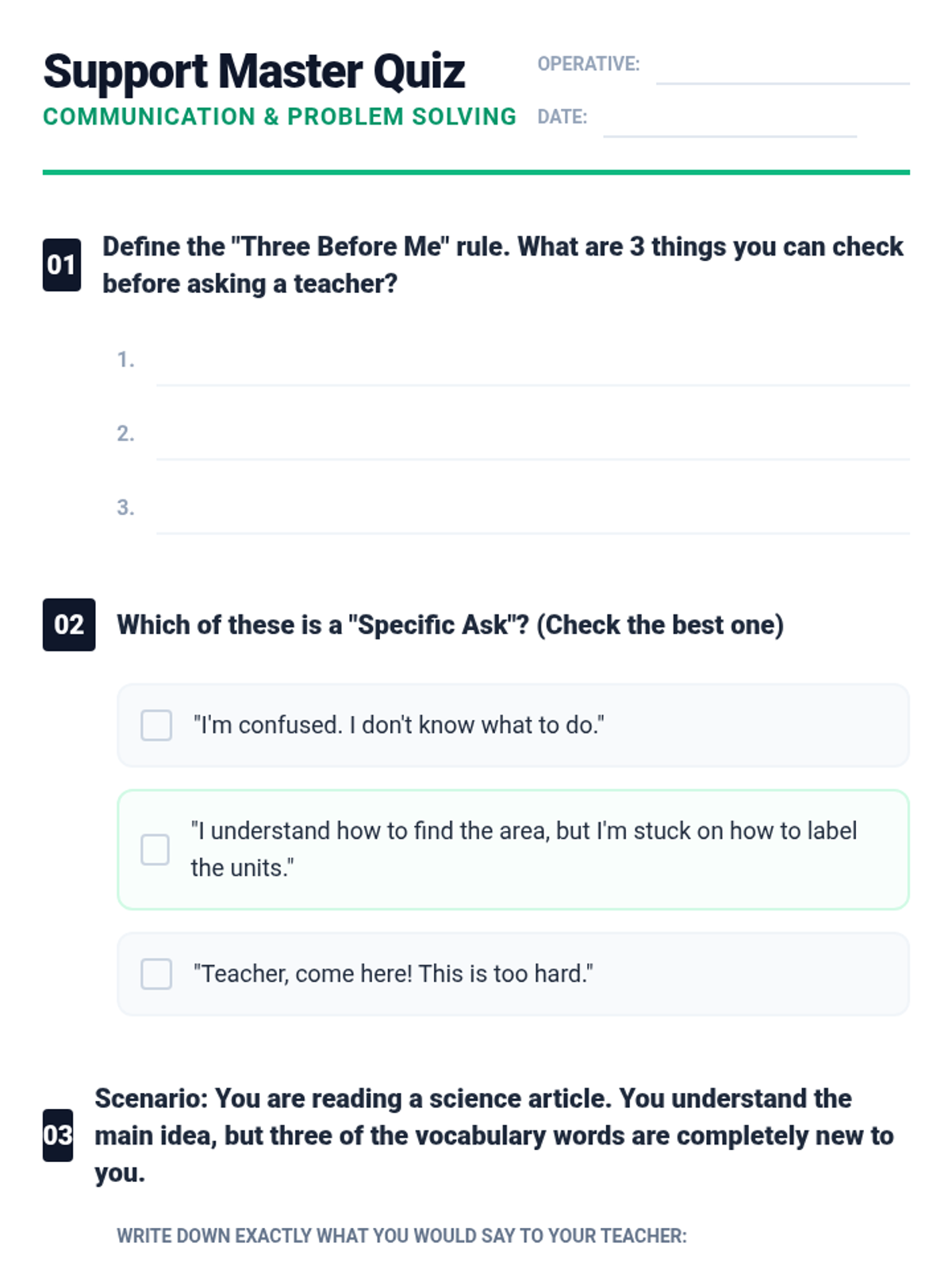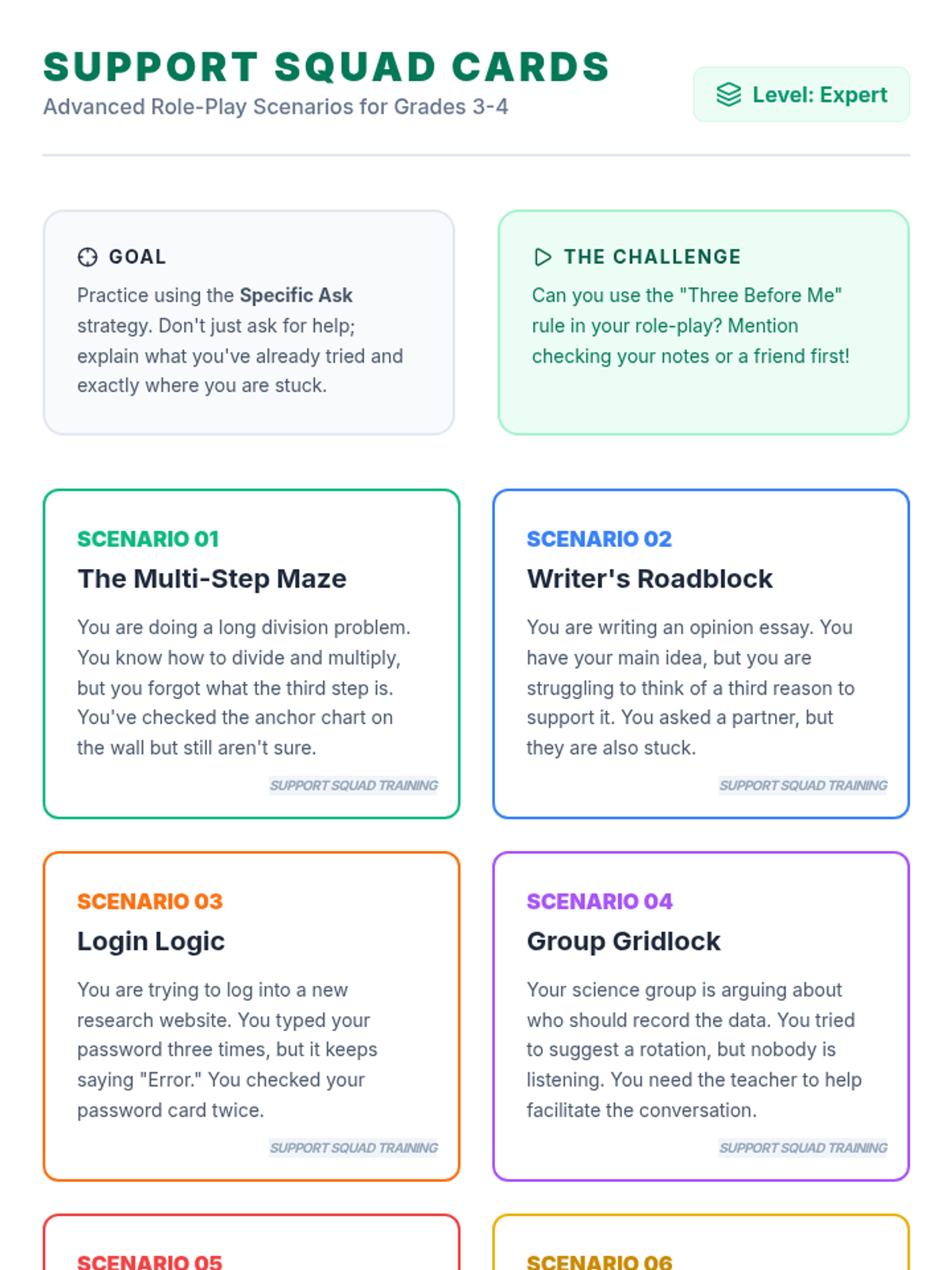 A comprehensive sequence designed to teach elementary students how to effectively and appropriately ask their teachers for help. It differentiates between younger and older elementary students, focusing on basic hand-raising and simple requests for 1st-2nd graders, and more specific, strategy-based communication for 3rd-4th graders.