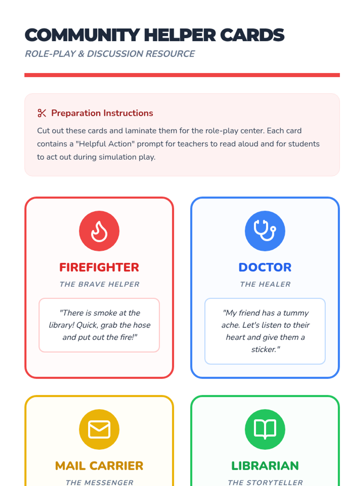 A Pre-K civics sequence focused on community awareness, identifying helpers, taking on classroom responsibilities, and resolving conflicts with kind words. Students explore their role within a group and how diverse individuals contribute to a unified community.