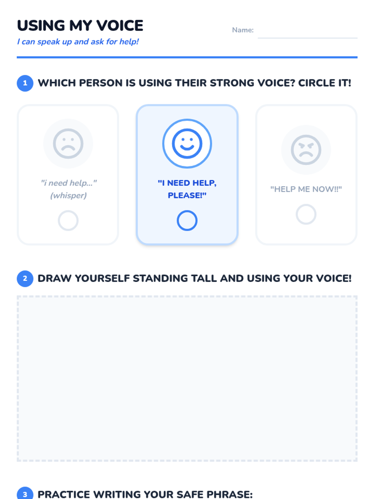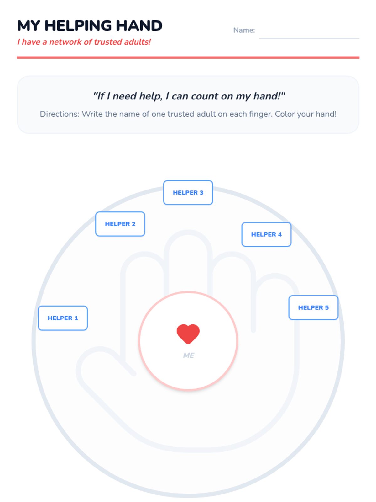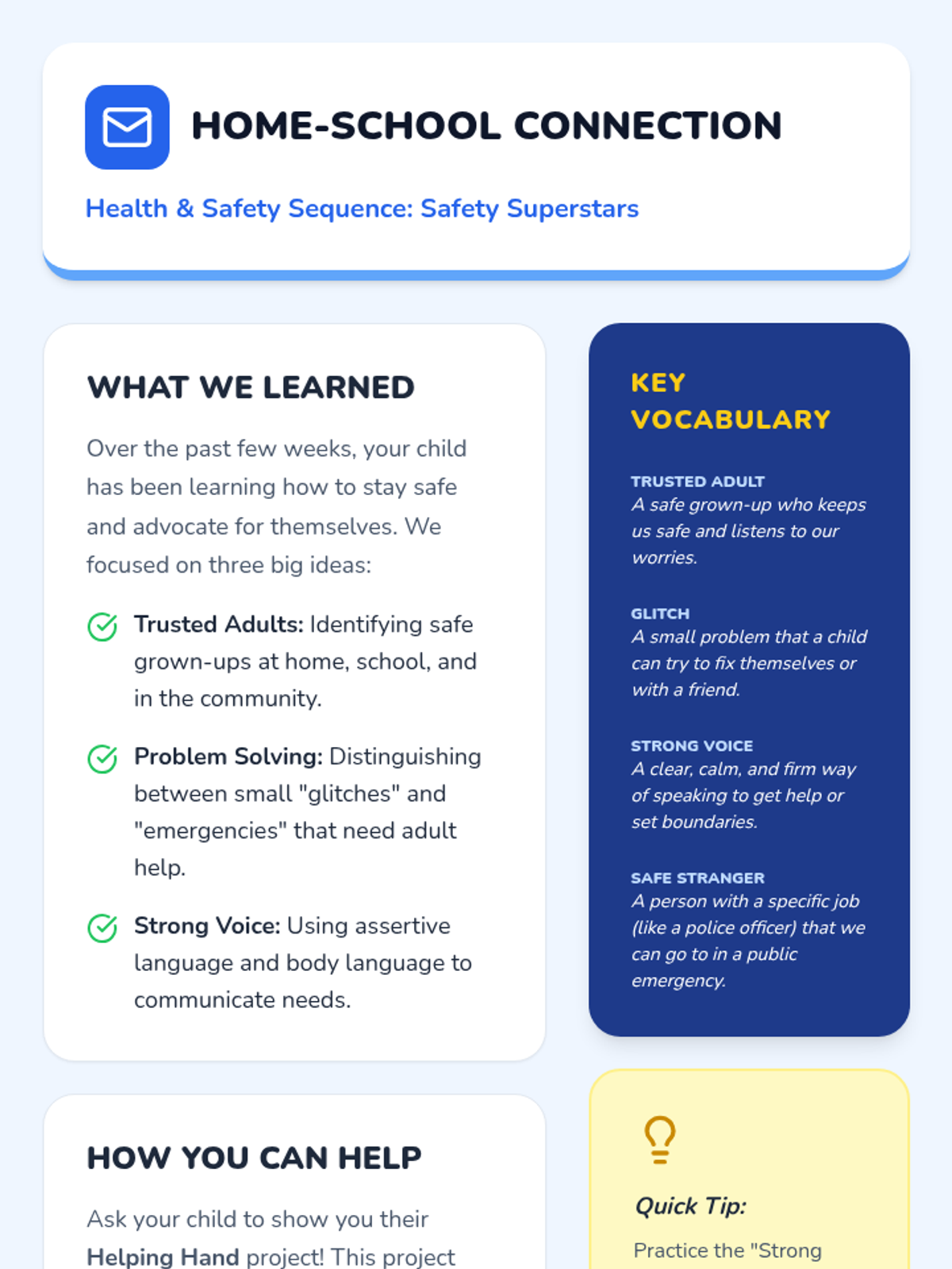 A comprehensive Kindergarten health sequence teaching students how to identify trusted adults, distinguish between minor and major problems, and use their voices to advocate for themselves and their safety.