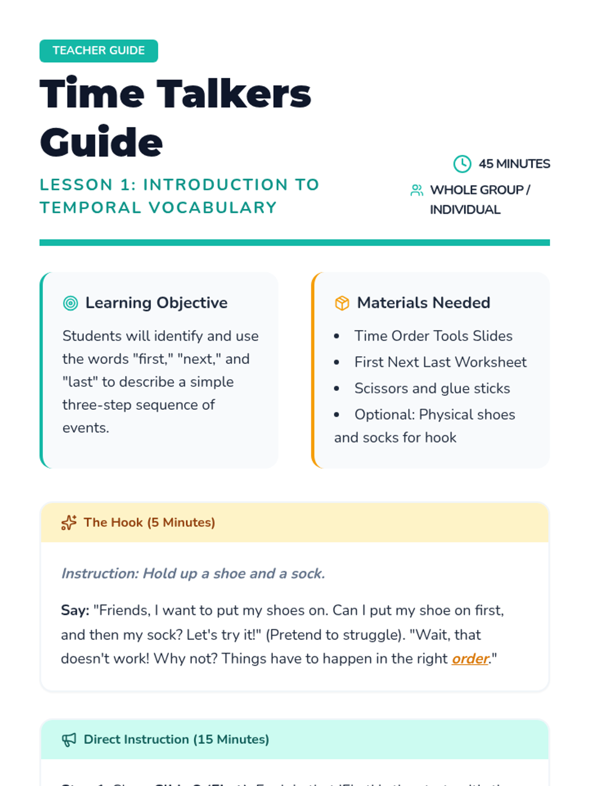Students explore chronological order and temporal vocabulary through daily routines, school schedules, and stories. The unit focuses on terms like 'first,' 'next,' and 'last' to build foundational historical thinking skills.
