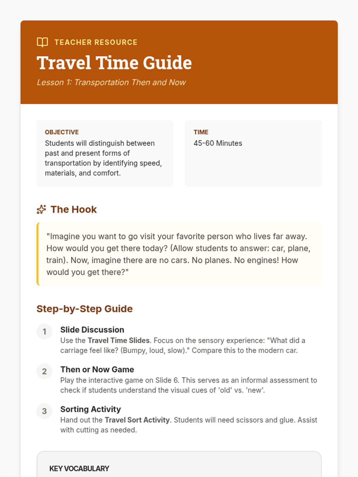 A Kindergarten sequence focused on distinguishing past from present through transportation, technology, school life, and fashion. Students develop chronological thinking skills by comparing artifacts and simulating historical experiences.