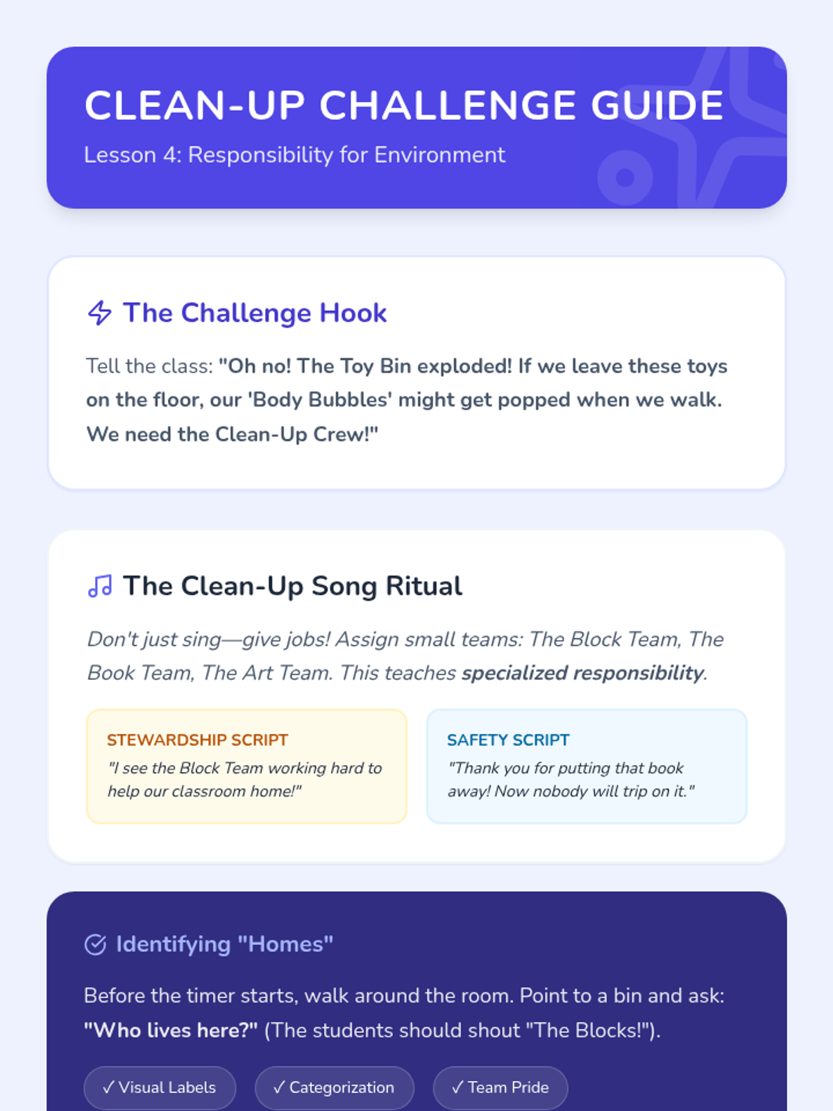 This Pre-K sequence introduces foundational civics through the lens of classroom rules, safety, sharing, and collective responsibility. Students move from experiencing the chaos of lawlessness to collaboratively drafting a 'Classroom Promise.'