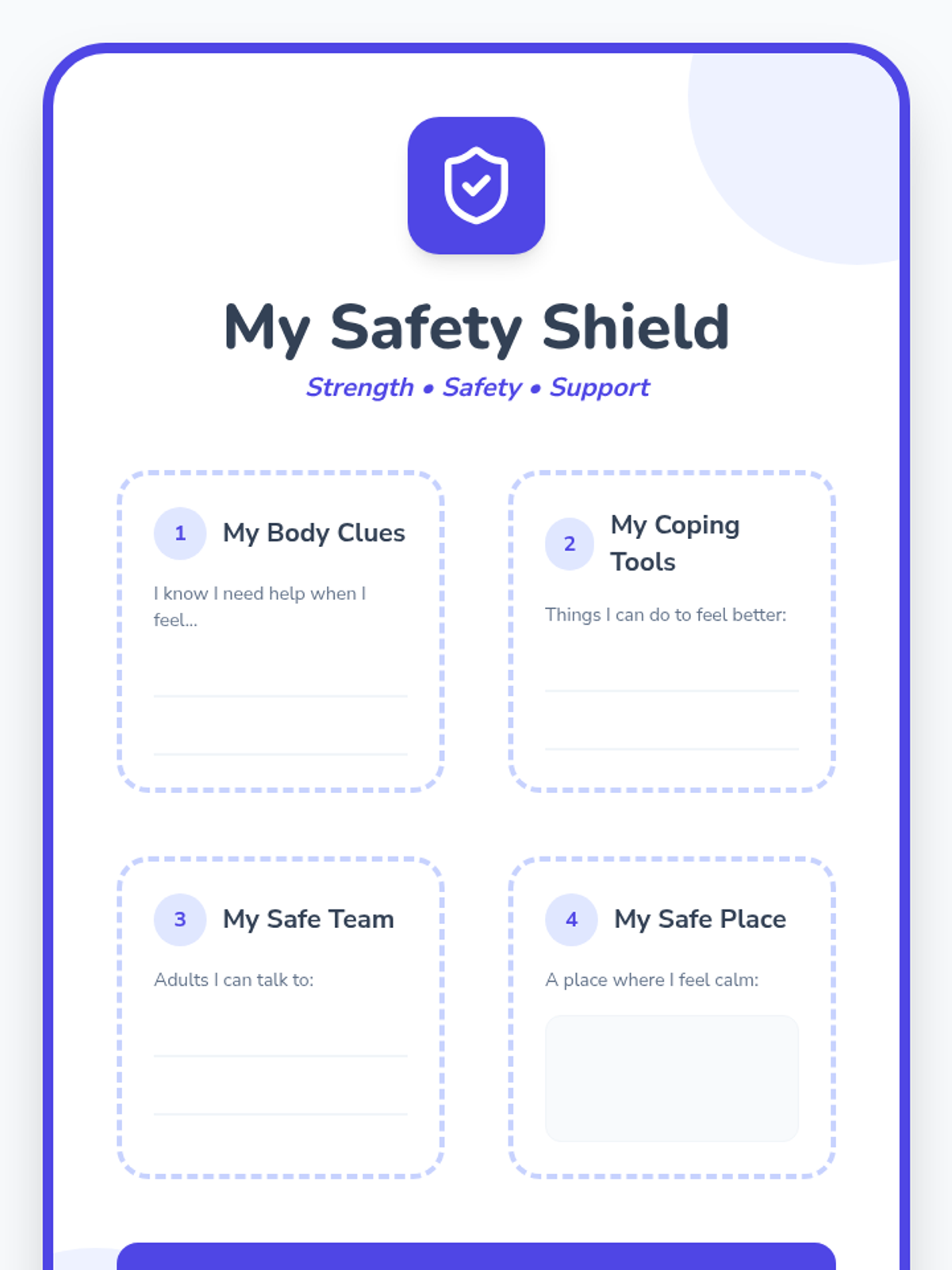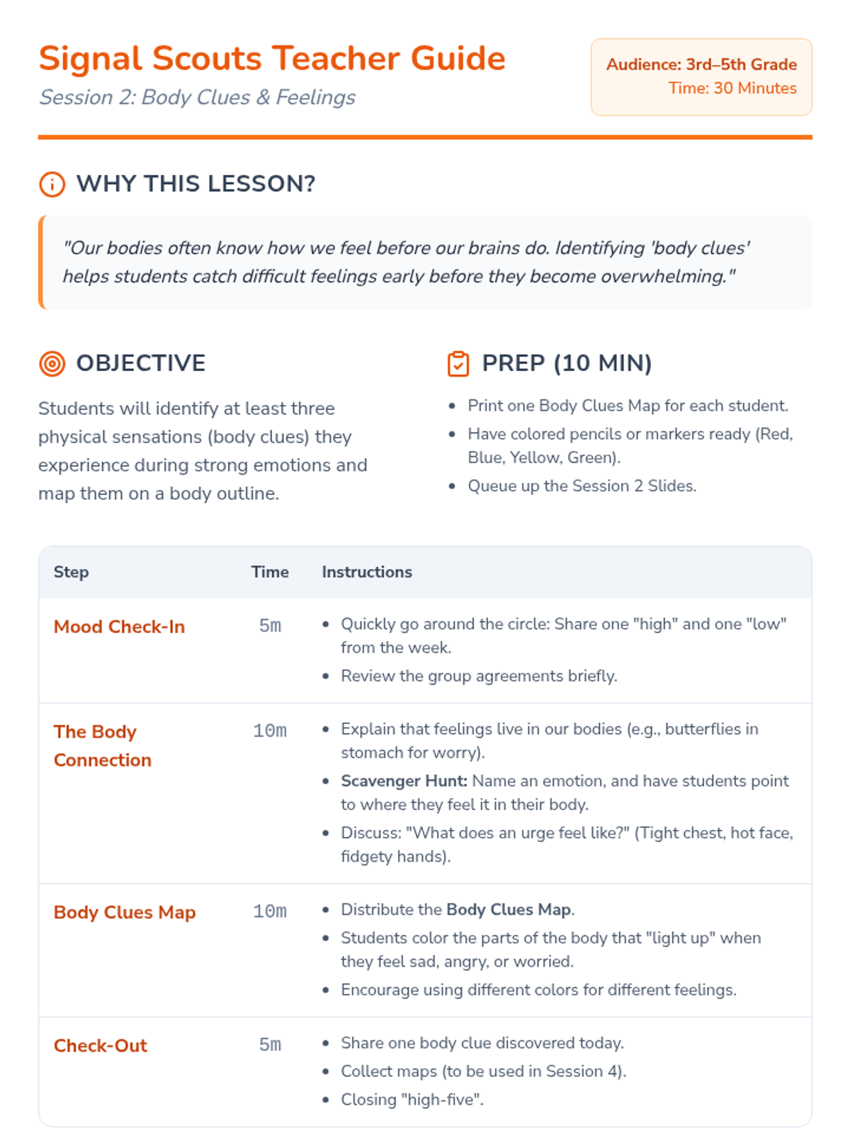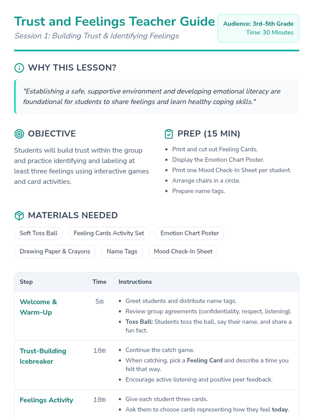 A 6-session small group intervention for students in grades 3-5, focusing on identifying emotions, understanding urges, developing coping strategies, and creating a safety plan for managing difficult feelings.