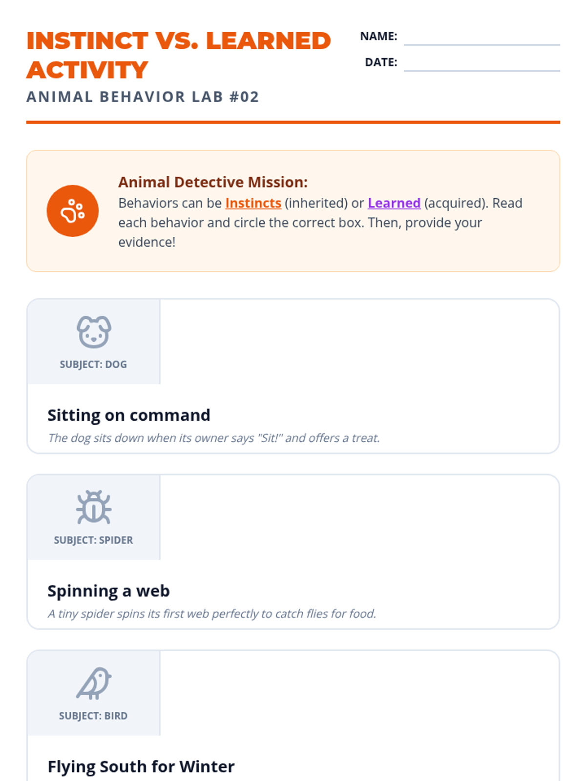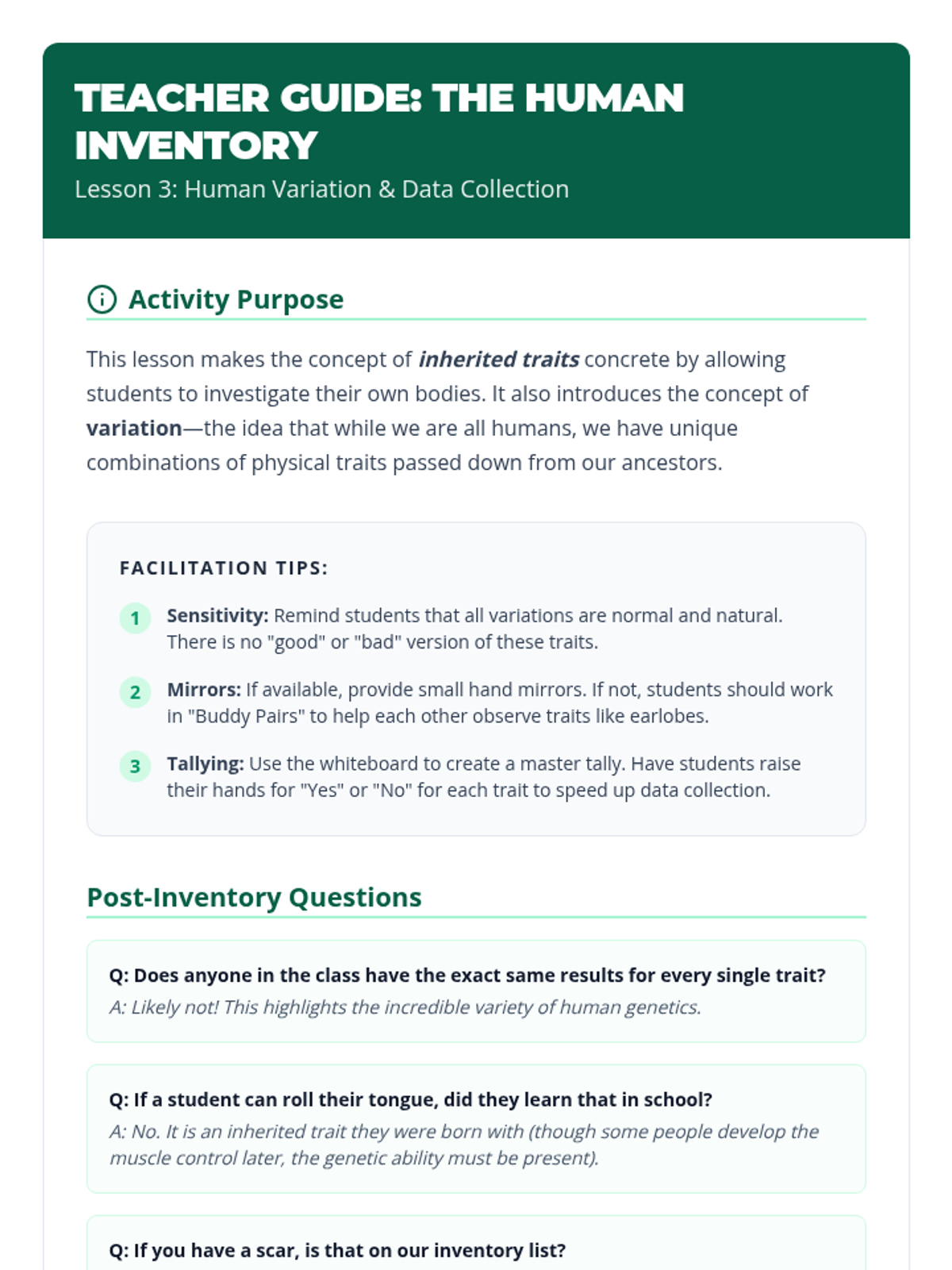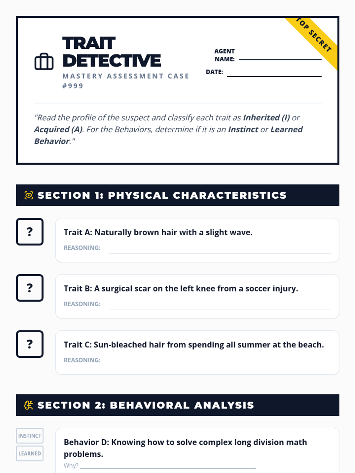 This sequence helps 3rd-grade students differentiate between inherited traits (genetics) and acquired traits (learned/environmental). Through interactive workshops, data collection, and behavioral analysis, students learn how physical characteristics and behaviors are passed down or developed throughout life.