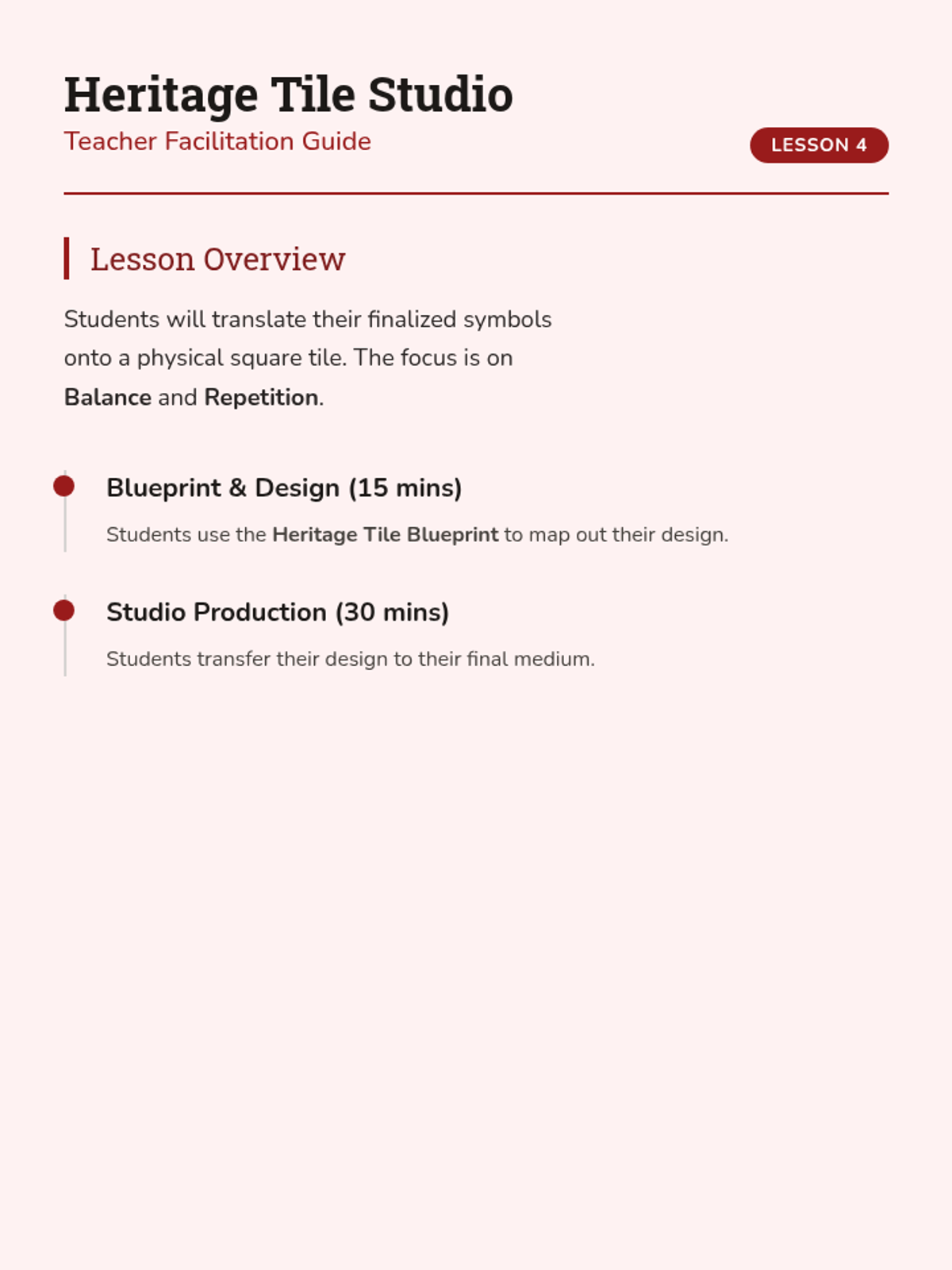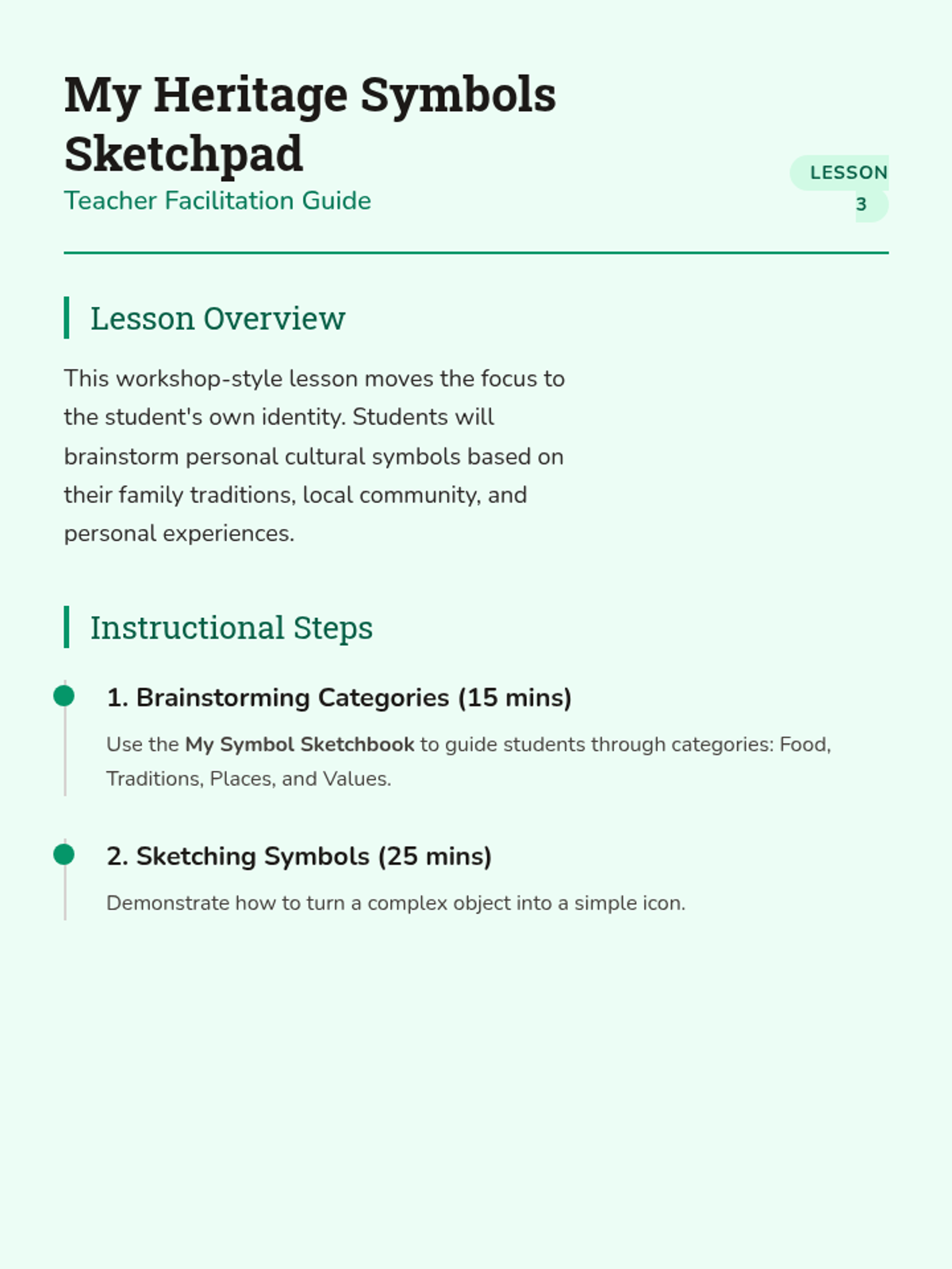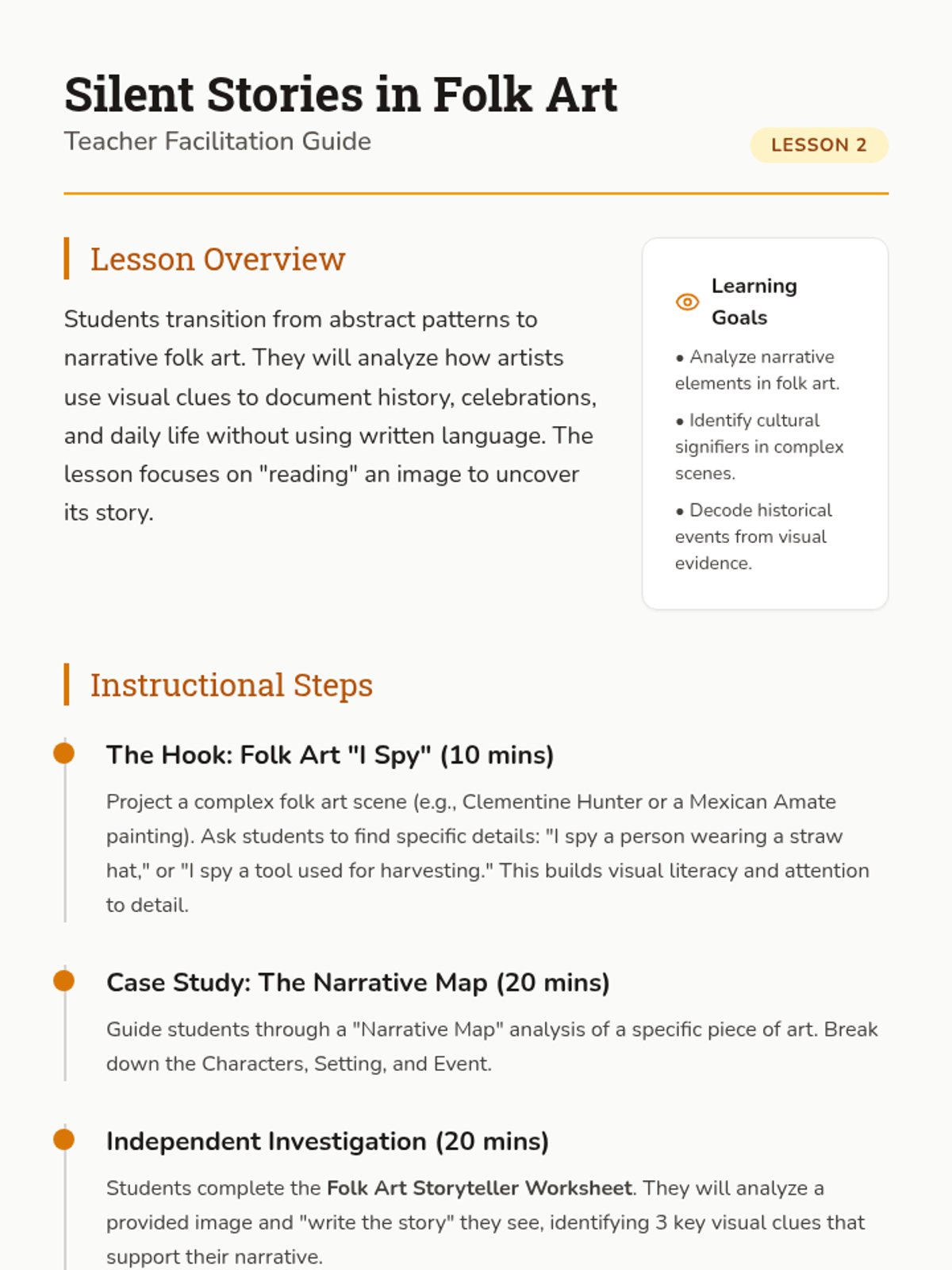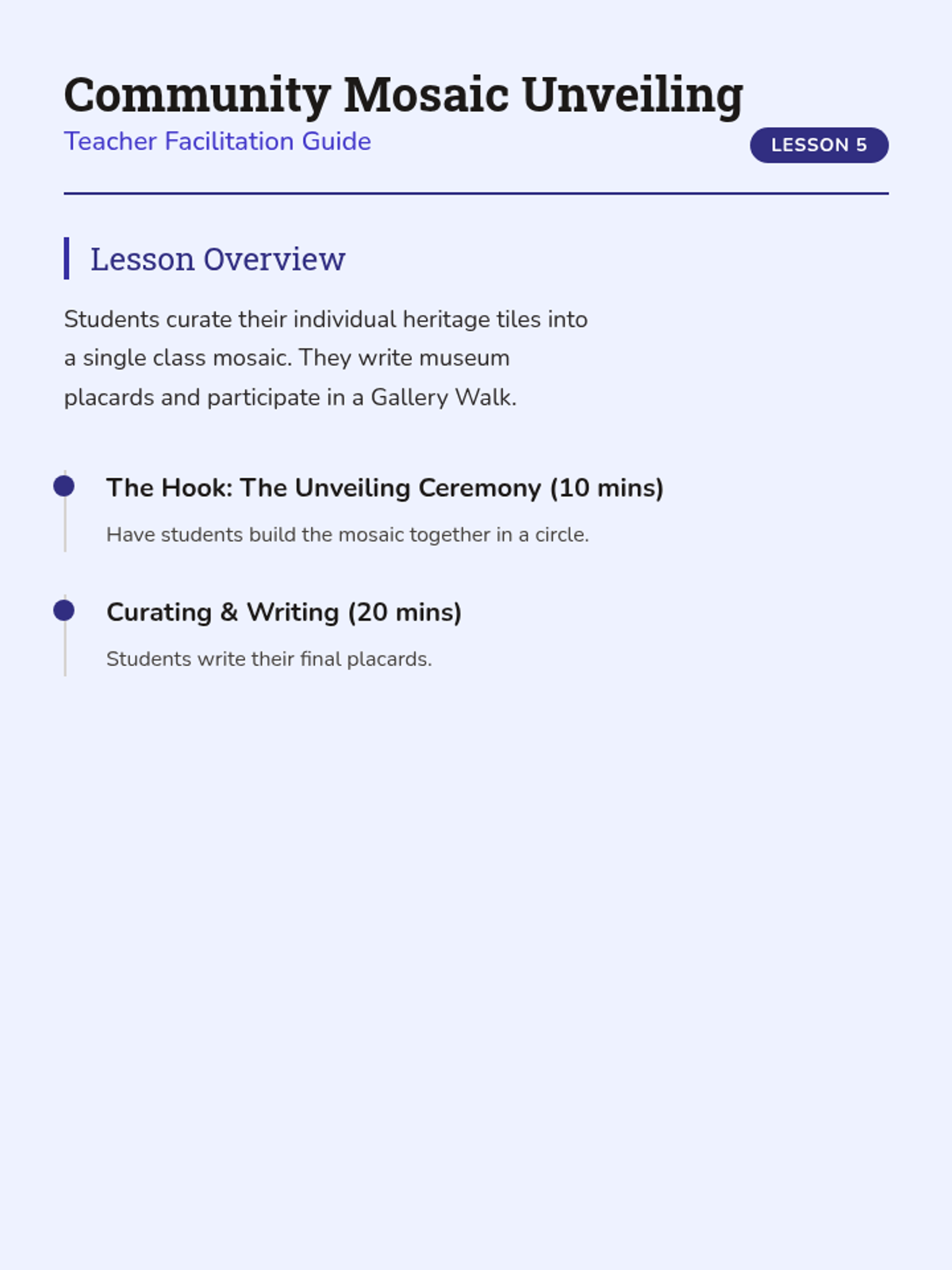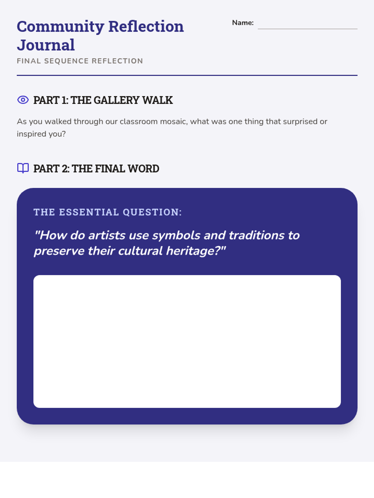 This 5-lesson sequence explores how art preserves cultural heritage. Students analyze patterns from West African, Navajo, and Japanese traditions, identify personal cultural symbols, and create a collaborative class mosaic that celebrates their diverse backgrounds and shared community.