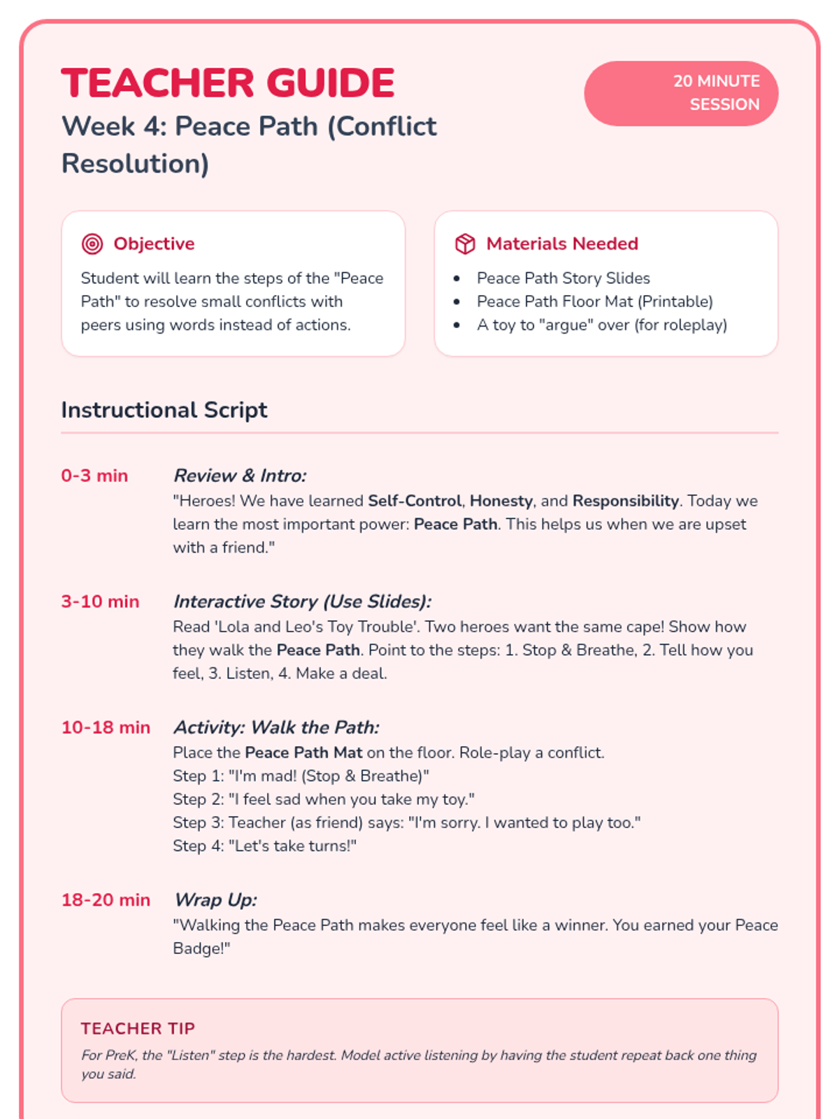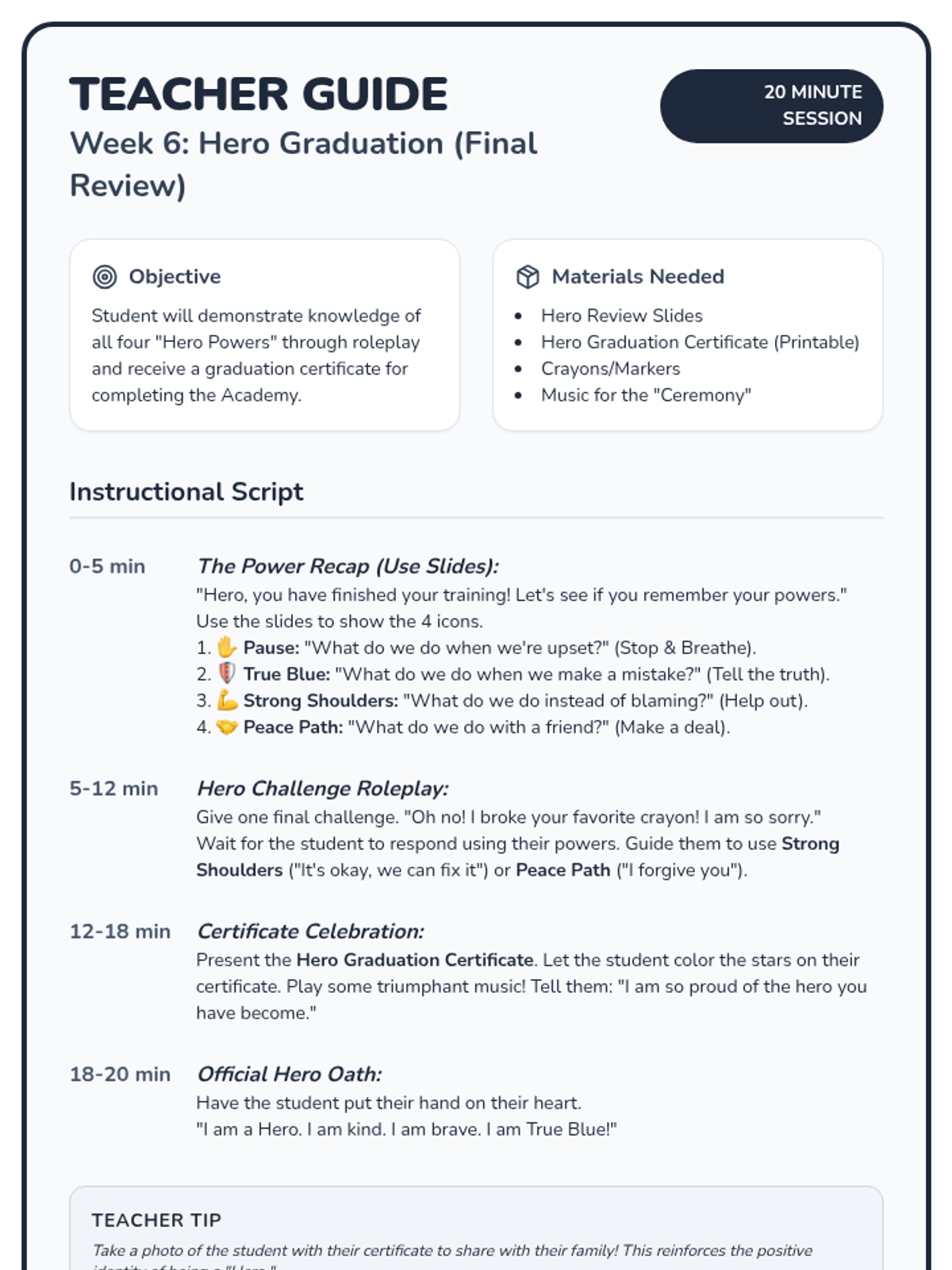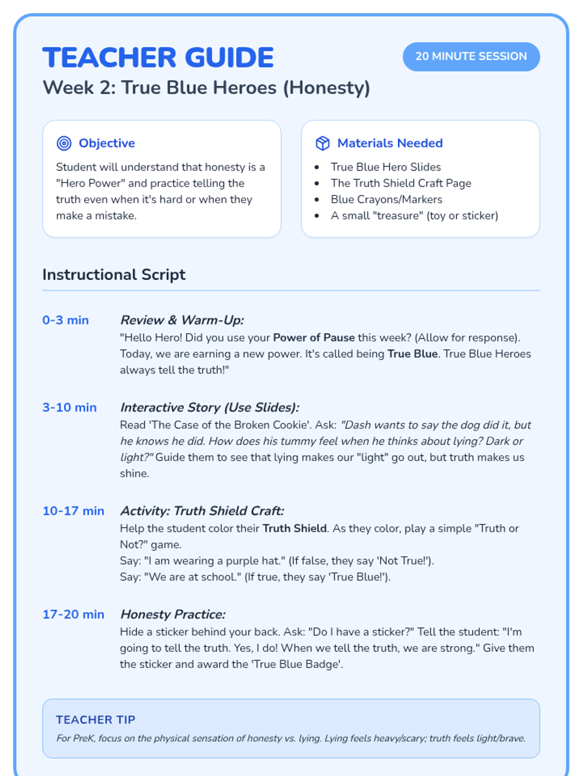 A 6-week social-emotional learning curriculum for PreK students focusing on self-control, honesty, responsibility, and conflict resolution through the engaging theme of 'Hero Academy'. Each 20-minute session includes a visual story, a hands-on activity, and a guided instructional script.