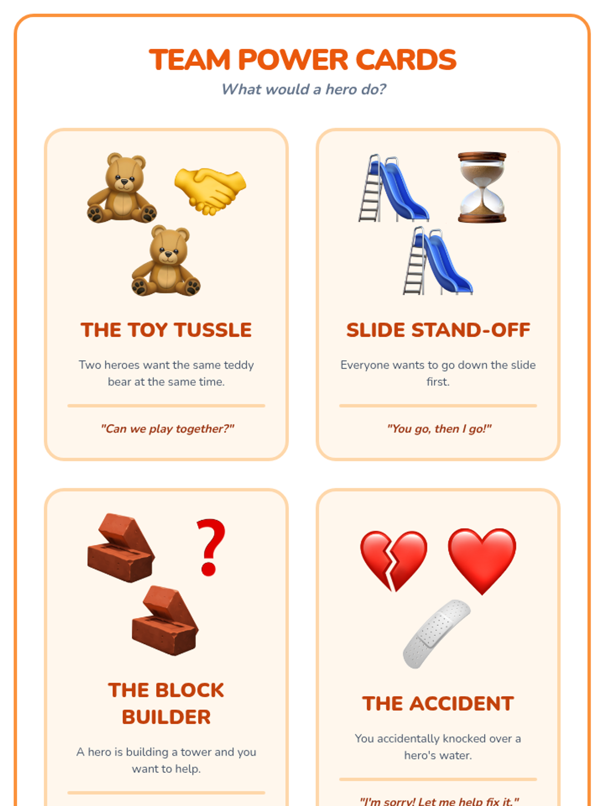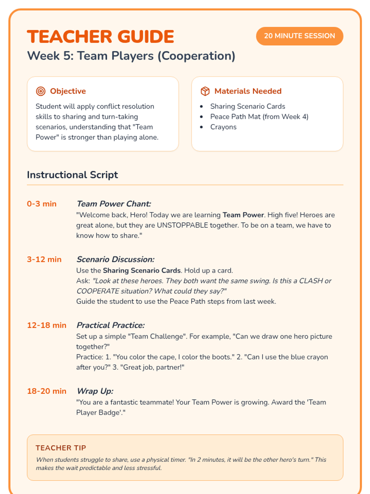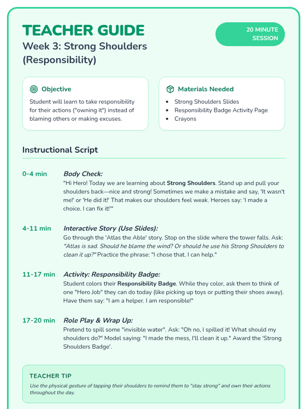 A 6-week social-emotional learning curriculum for PreK students focusing on self-control, honesty, responsibility, and conflict resolution through the engaging theme of 'Hero Academy'. Each 20-minute session includes a visual story, a hands-on activity, and a guided instructional script.