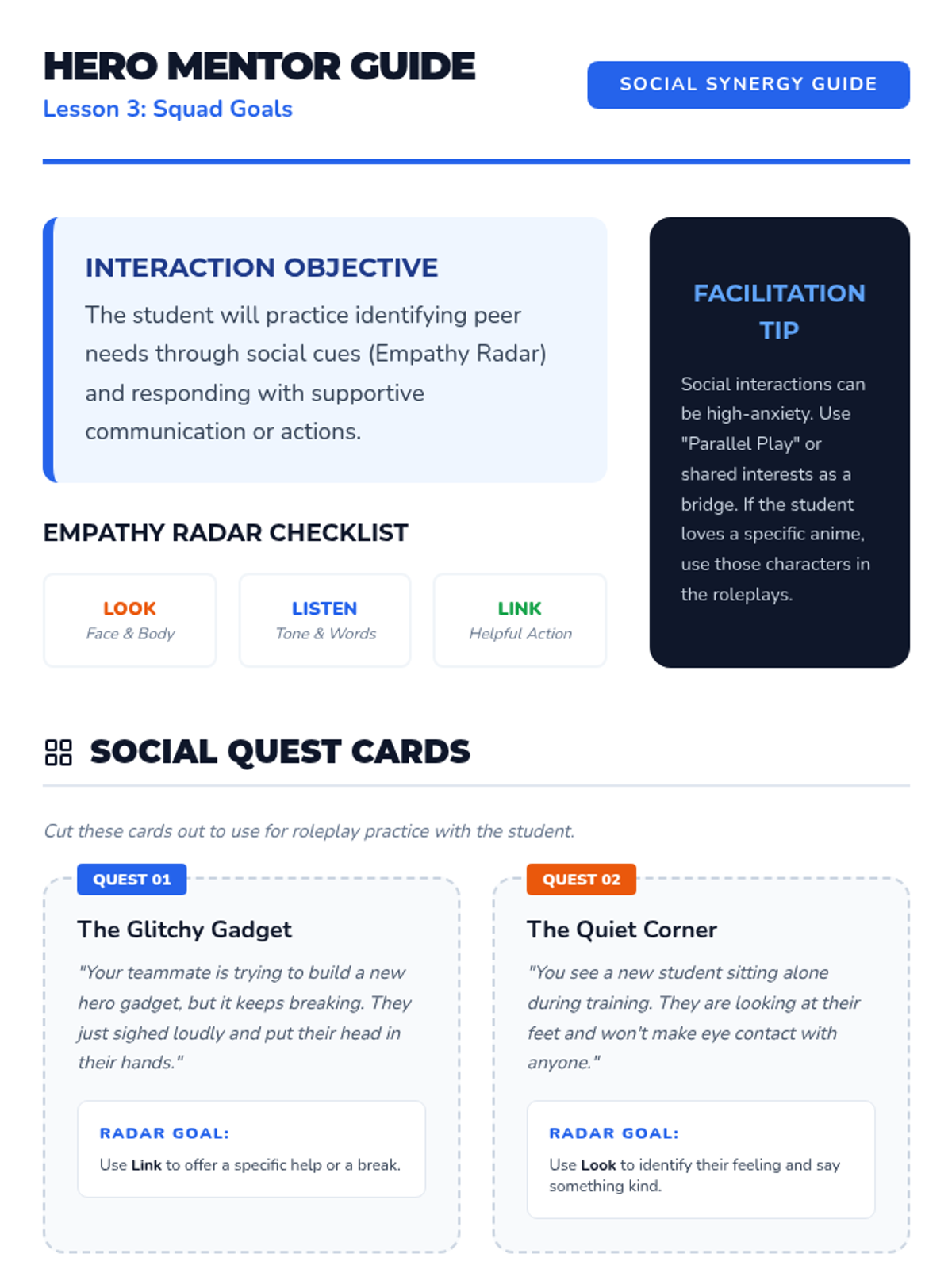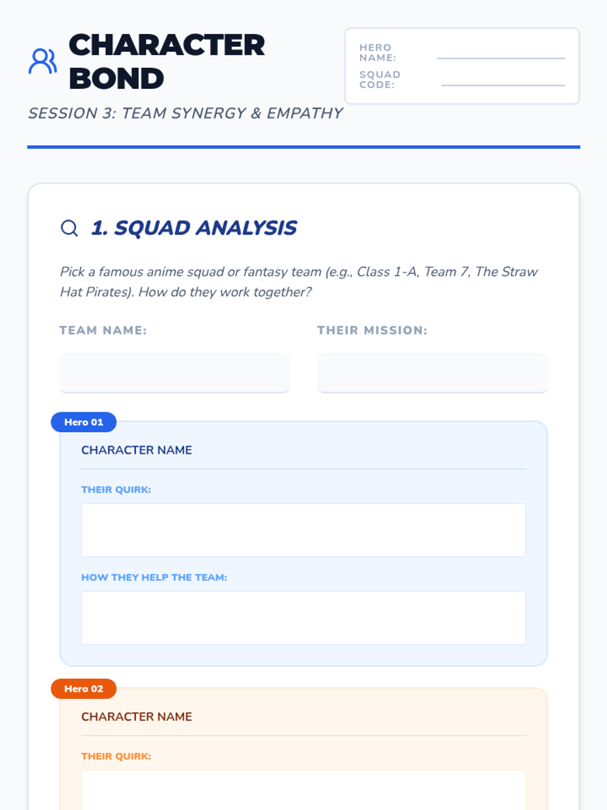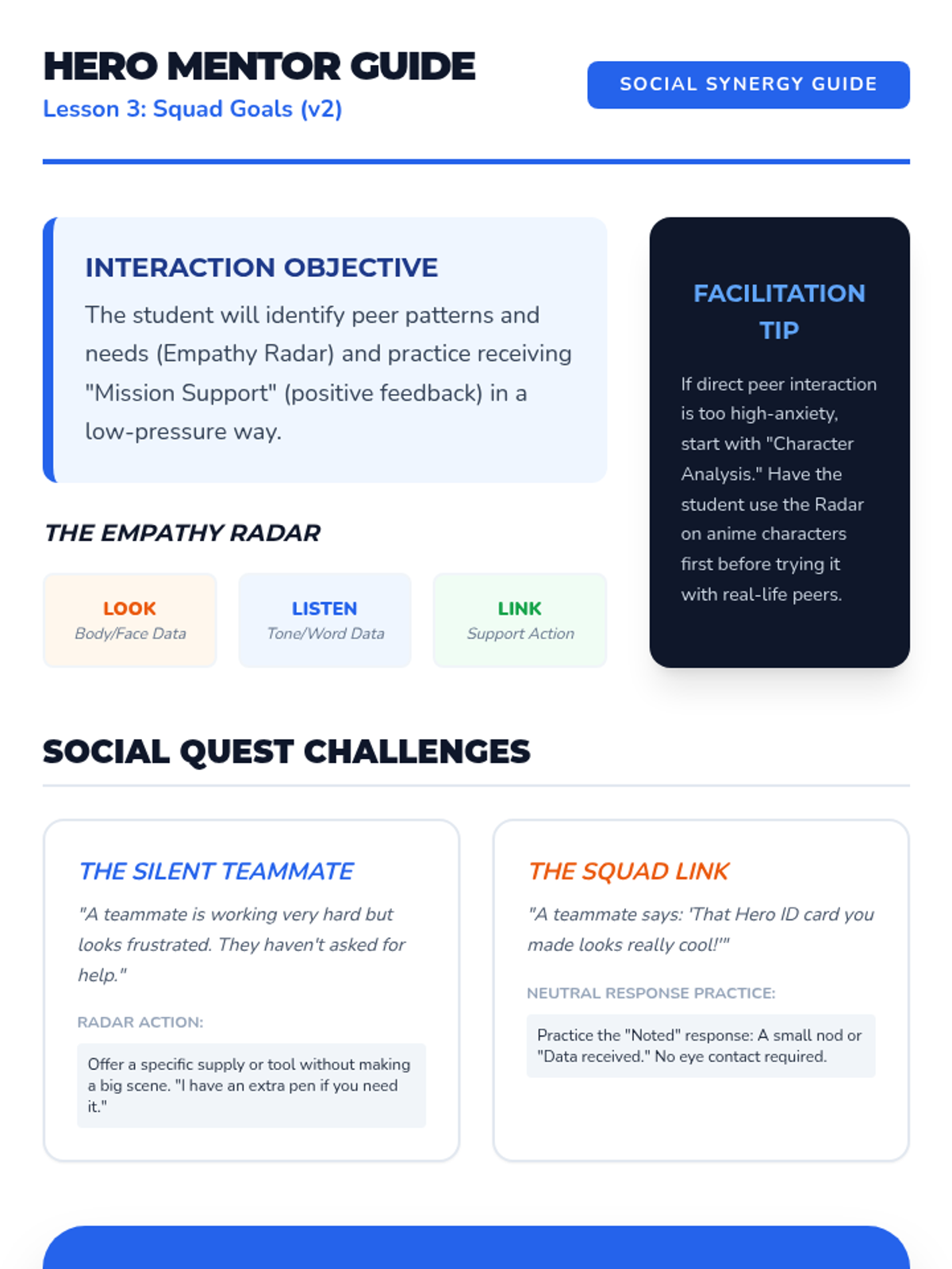 A multi-session social-emotional learning journey using anime themes to build self-esteem, self-advocacy skills, and positive peer interaction strategies for middle school students. Through the lens of hero tropes and fantasy narratives, students identify their own 'quirks' and practice standing up for themselves.