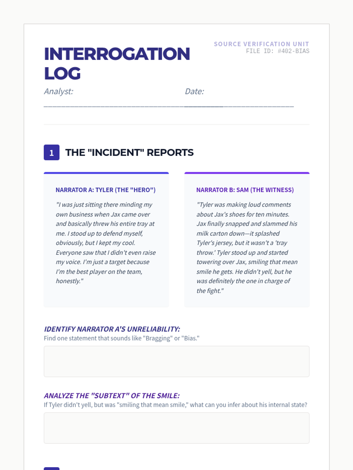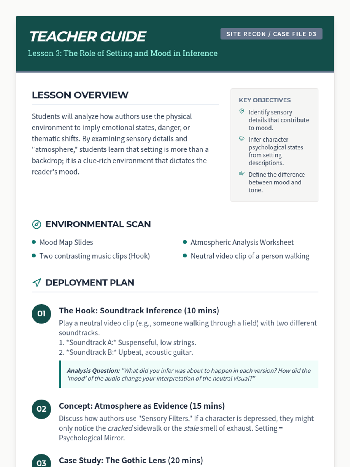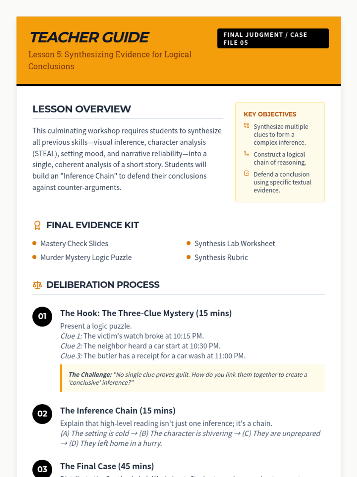 A foundational workshop for 9th-grade students to master the mechanics of inference. Students move from simple visual analysis to complex literary interpretation, using the formula 'Text Clues + Background Knowledge = Inference' to decode character motivations, setting atmosphere, and unreliable narrators.