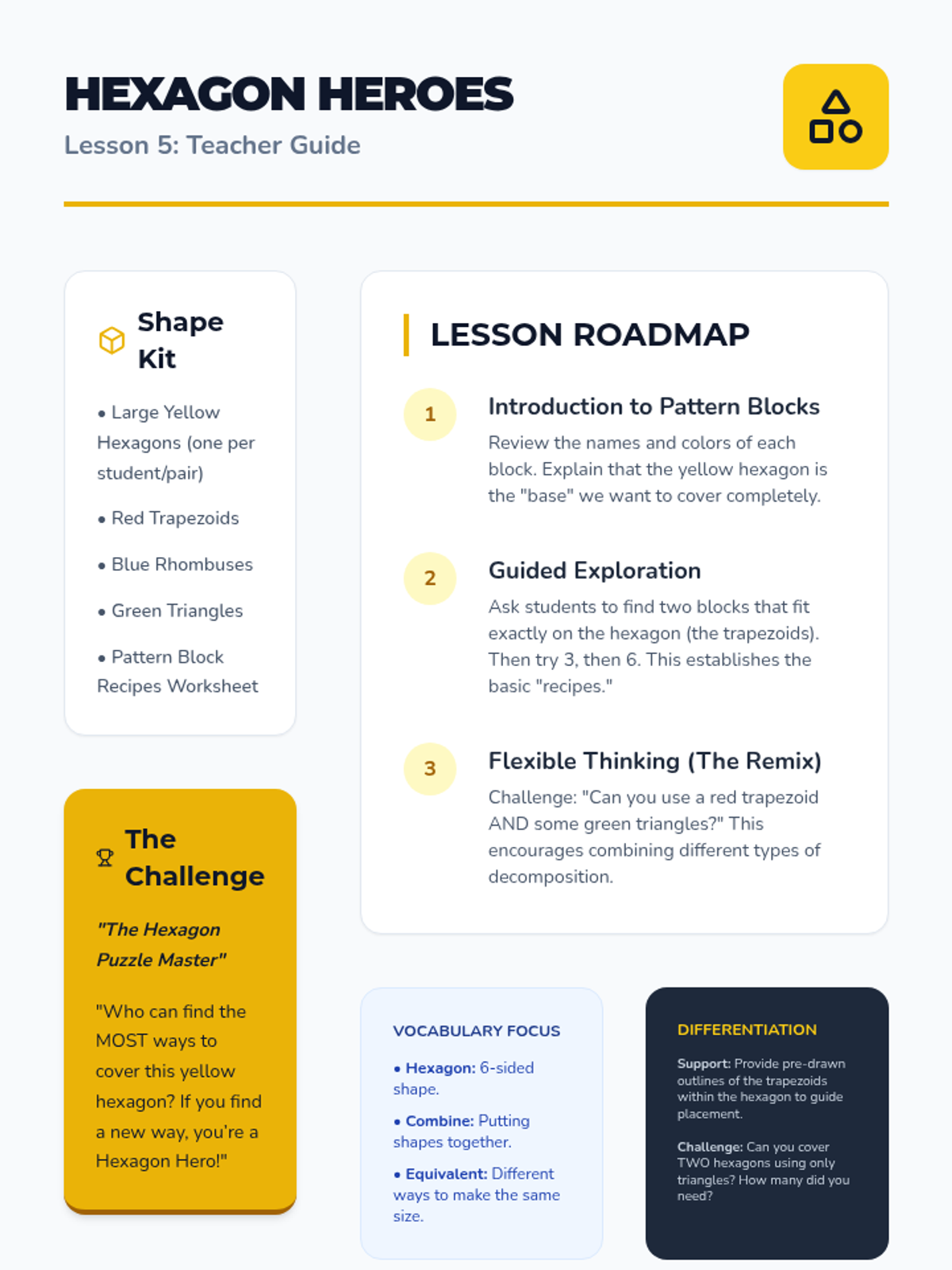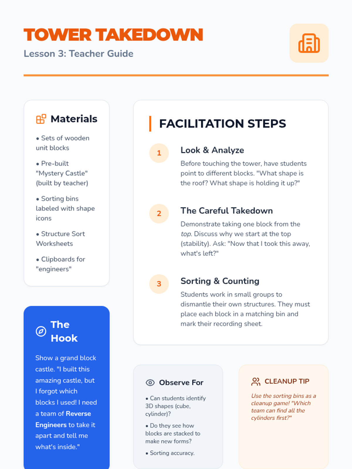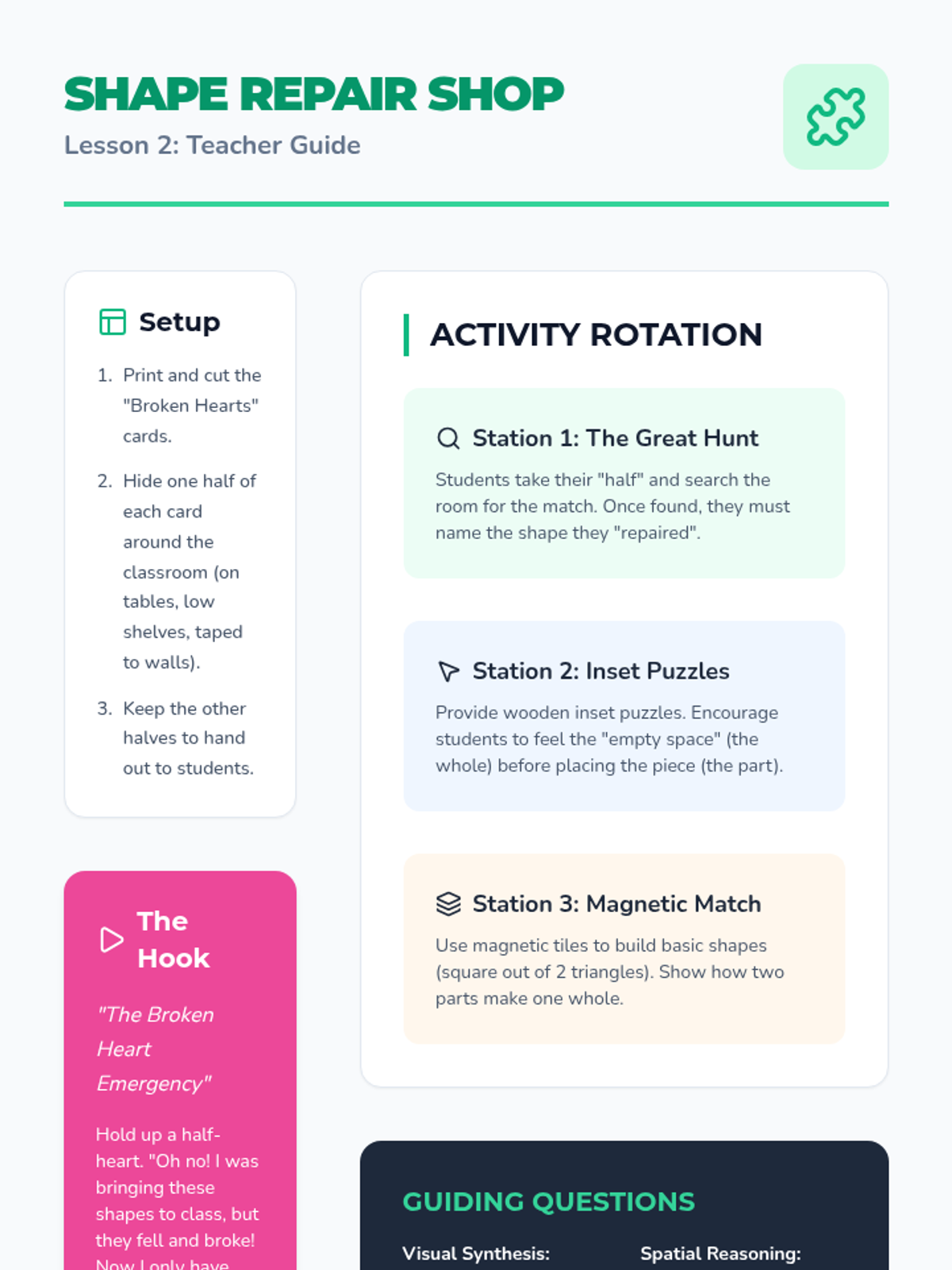 This sequence introduces Pre-K students to shape decomposition and spatial awareness by exploring how larger shapes are made of smaller ones. Through hands-on cutting, puzzles, block building, and art analysis, students learn to see the parts within the whole.