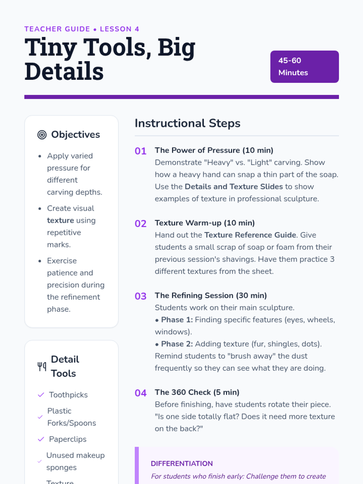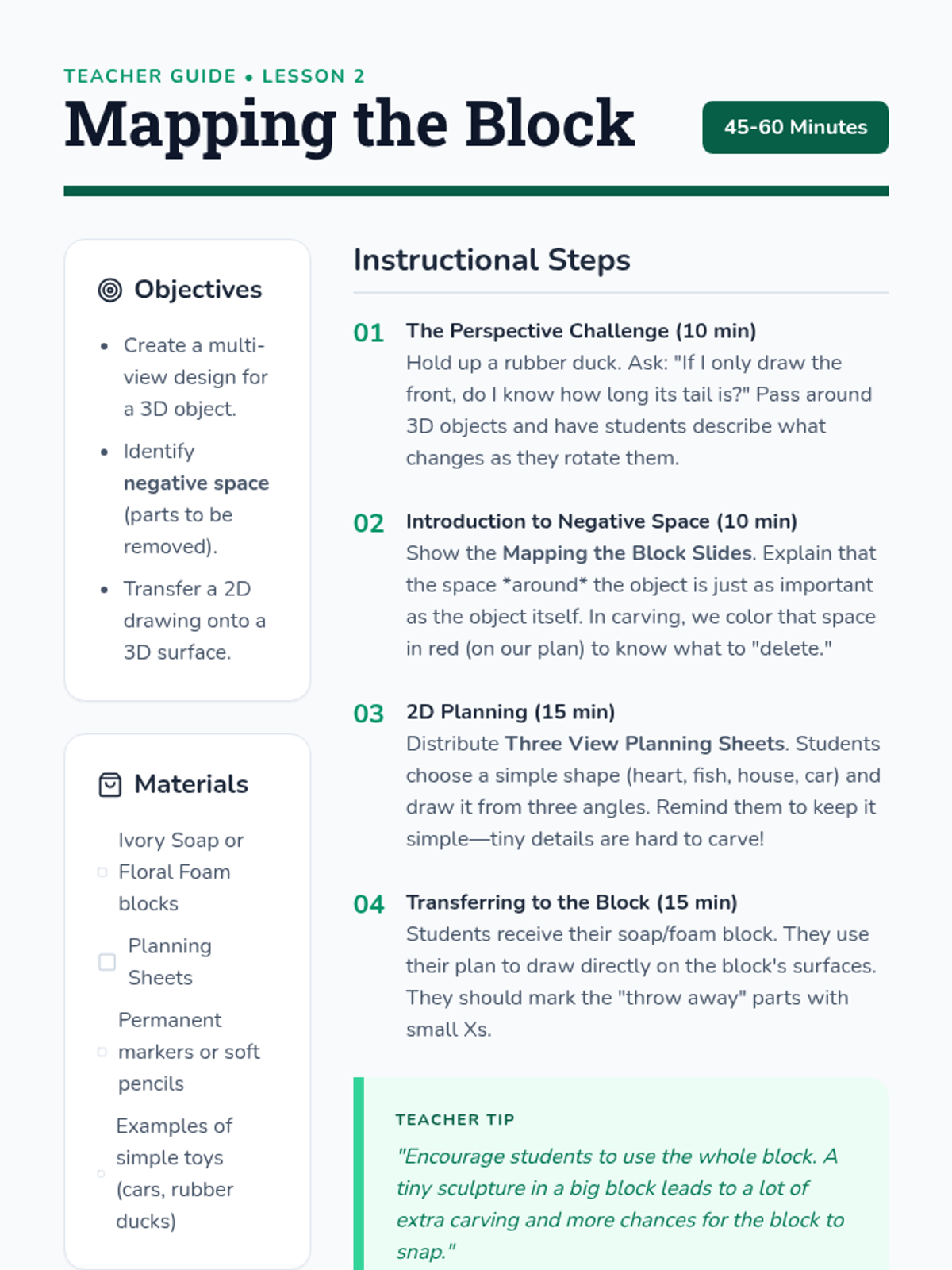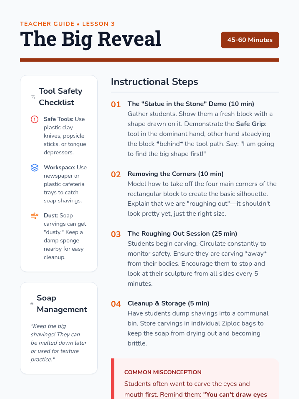 A 2nd-grade unit on subtractive sculpture, where students learn to reveal hidden forms by carving away material from soap or foam blocks. The sequence covers the difference between additive and subtractive art, 3D planning, tool safety, and refining techniques.