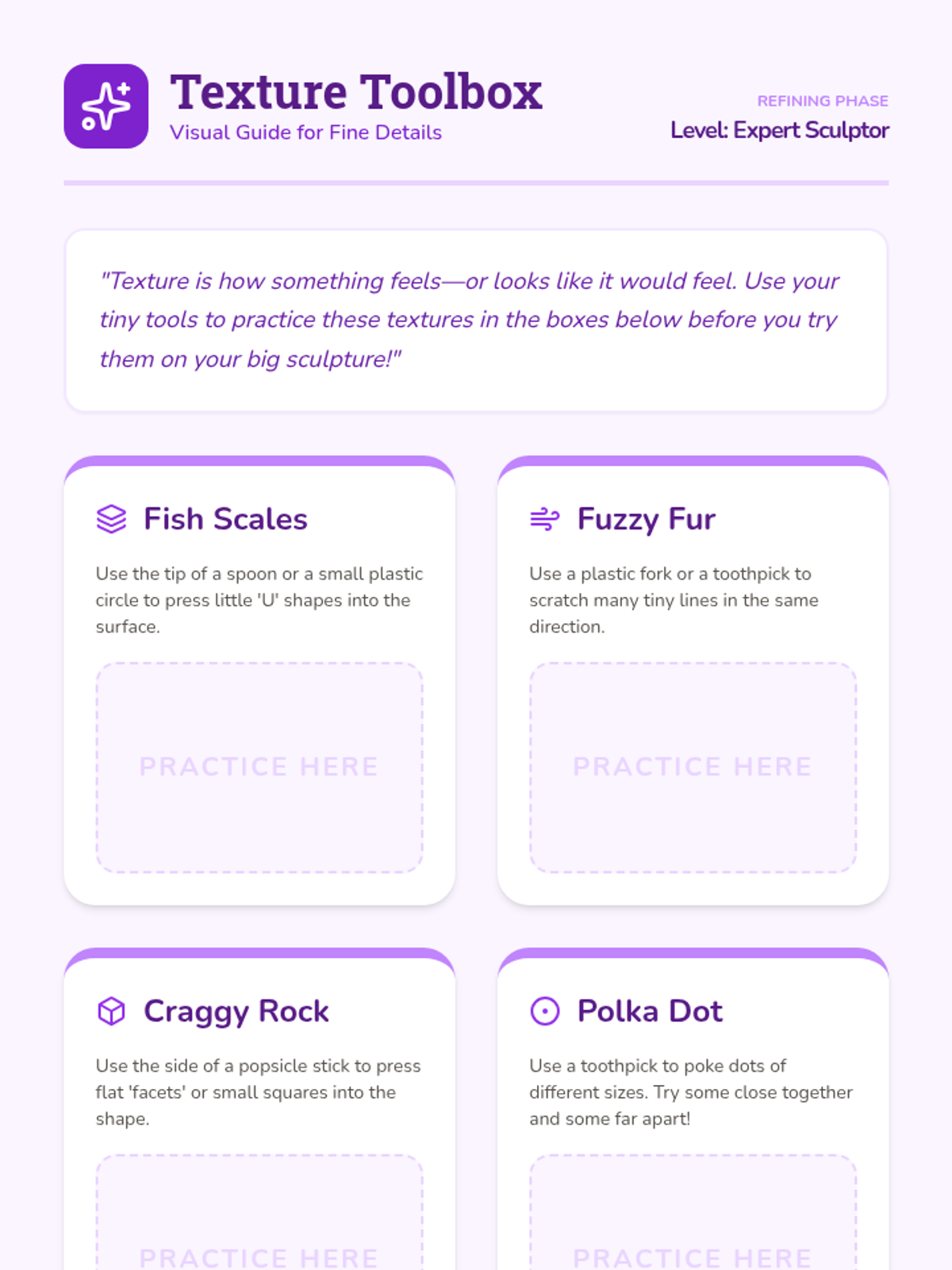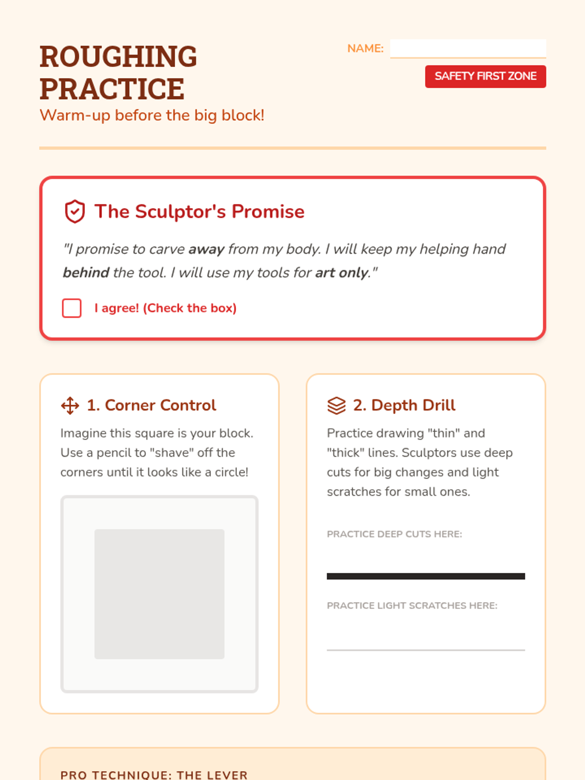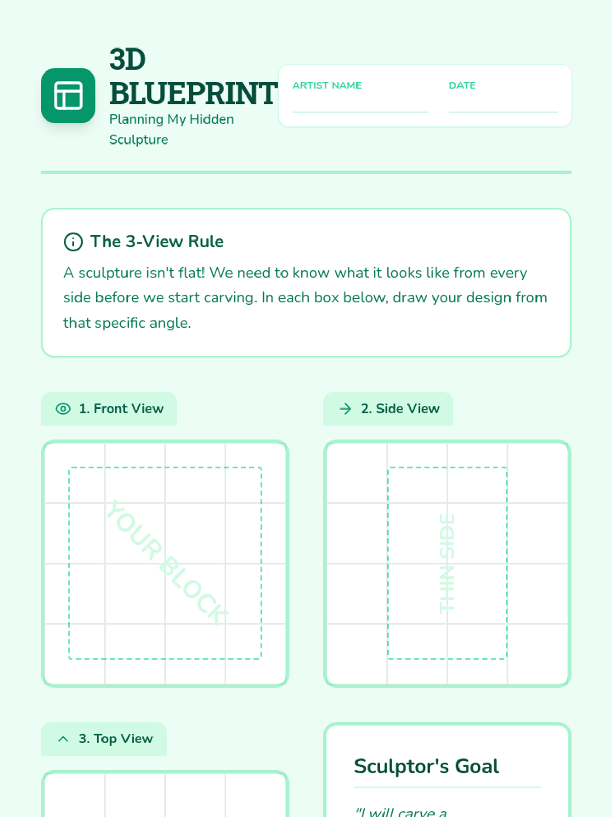 A 2nd-grade unit on subtractive sculpture, where students learn to reveal hidden forms by carving away material from soap or foam blocks. The sequence covers the difference between additive and subtractive art, 3D planning, tool safety, and refining techniques.