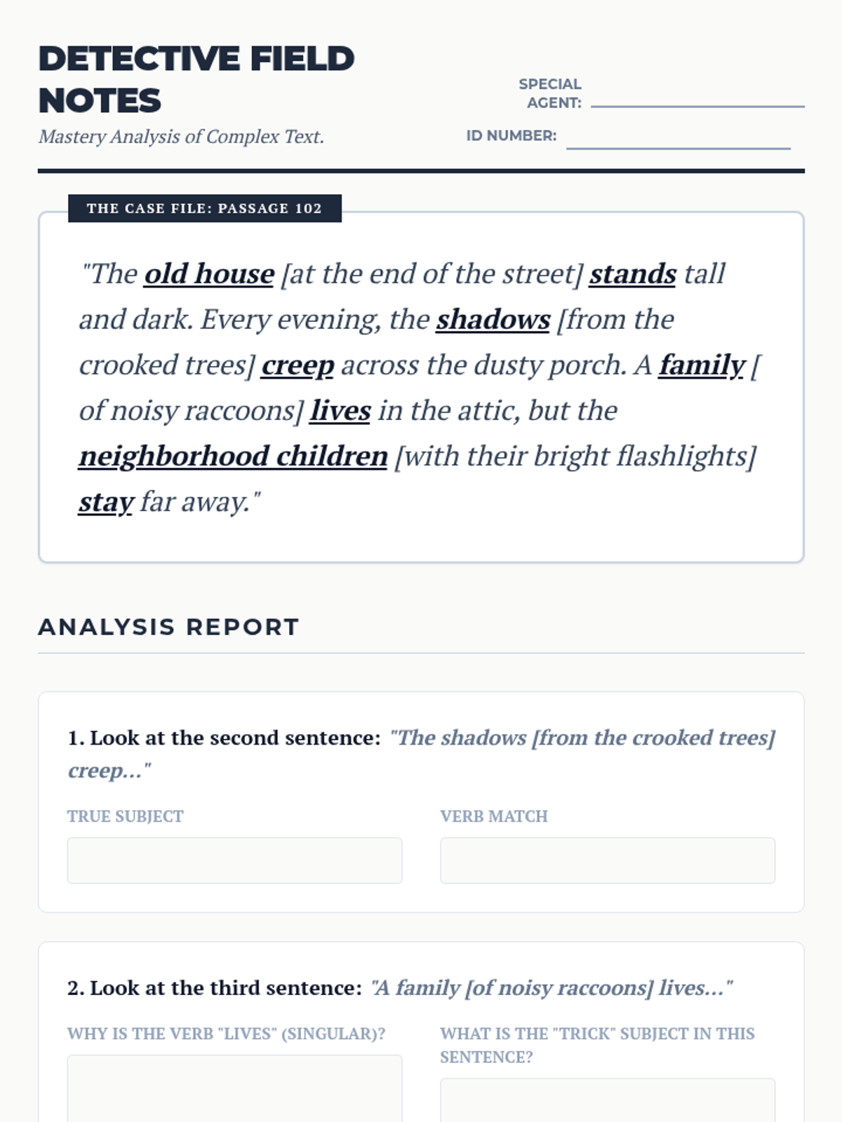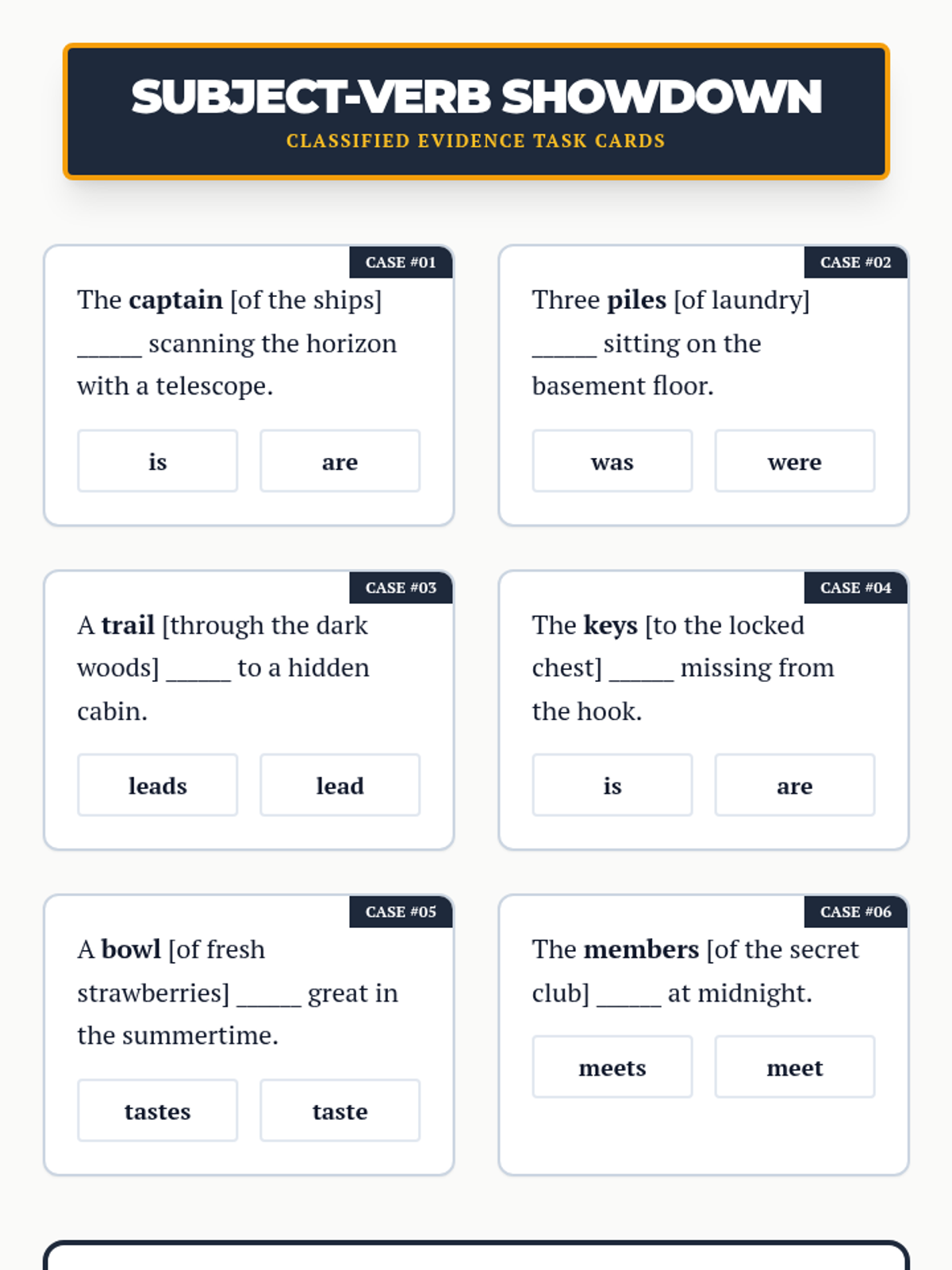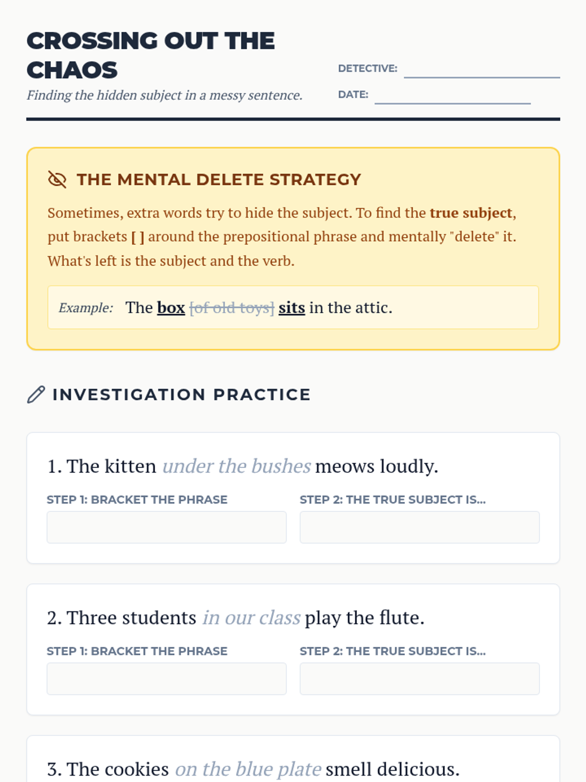 A 4th-grade ELA sequence focused on mastering subject-verb agreement in sentences with intervening prepositional phrases. Students use a detective-themed approach to identify 'hidden' subjects and ensure grammatical accuracy.