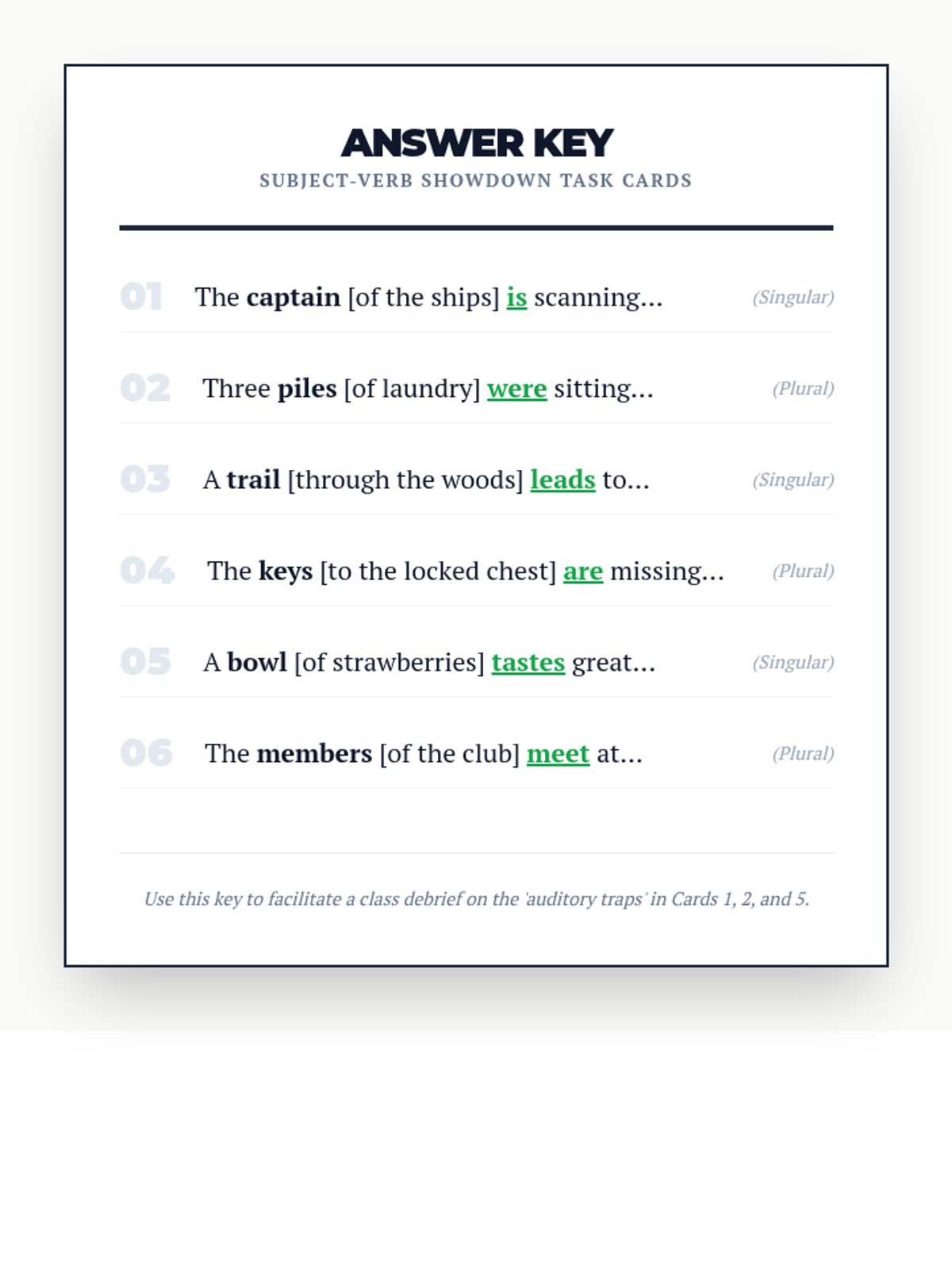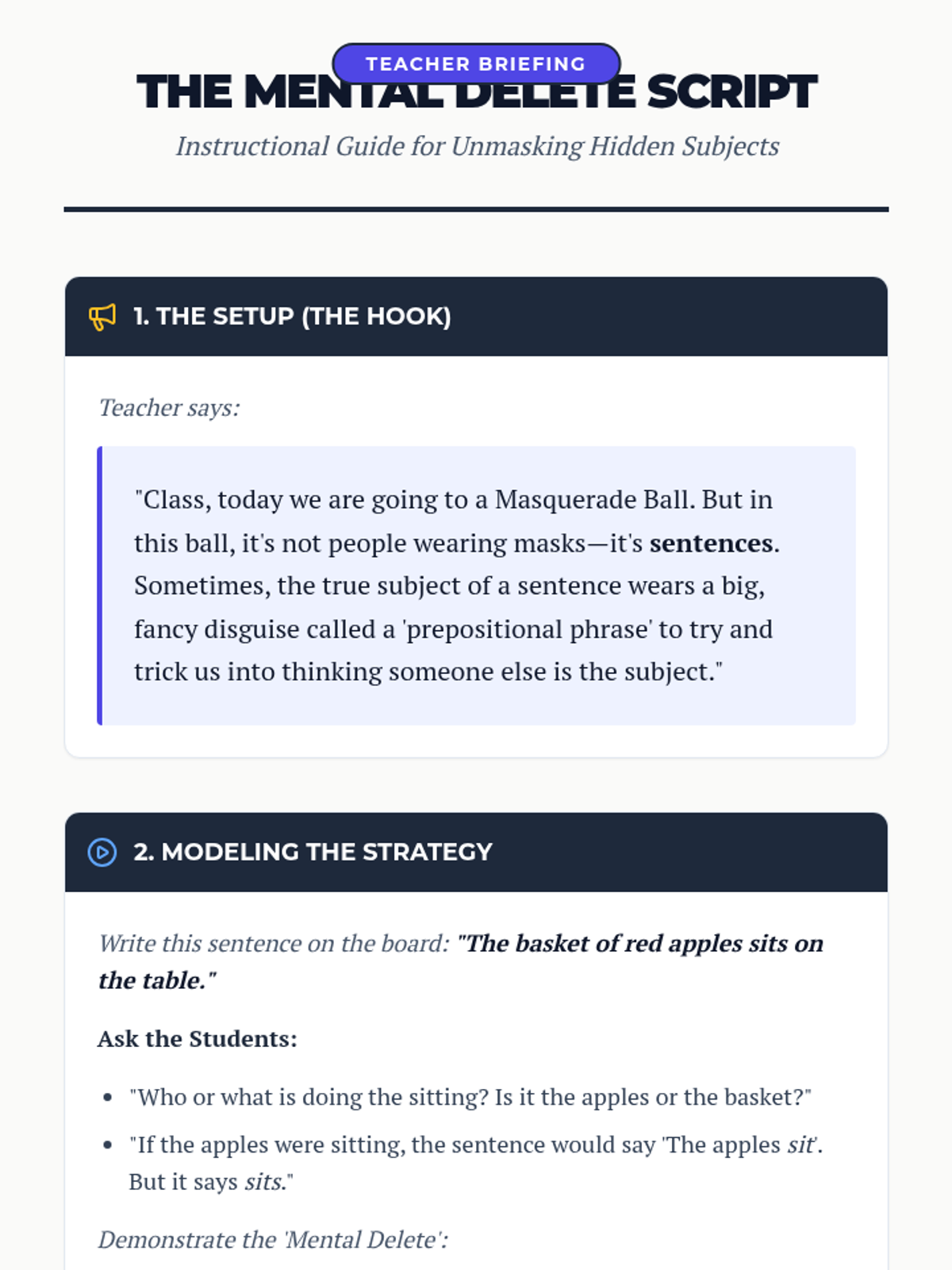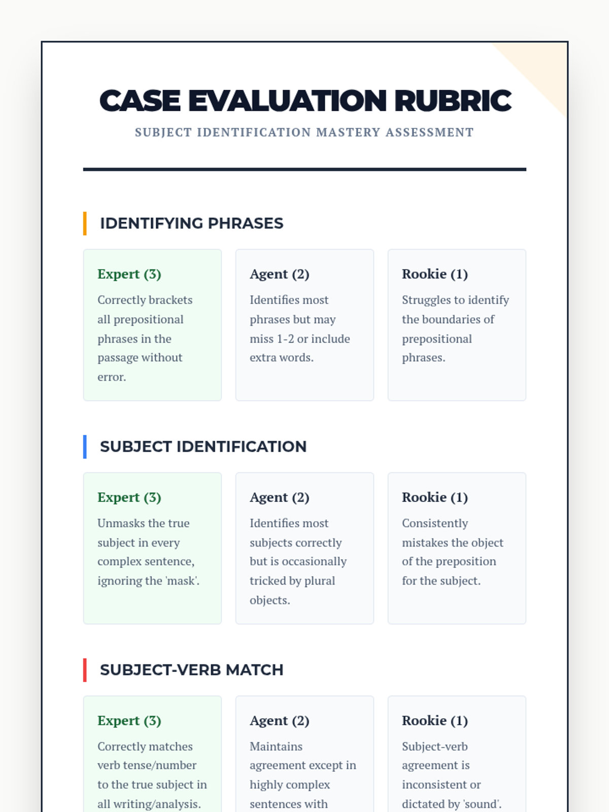 A 4th-grade ELA sequence focused on mastering subject-verb agreement in sentences with intervening prepositional phrases. Students use a detective-themed approach to identify 'hidden' subjects and ensure grammatical accuracy.