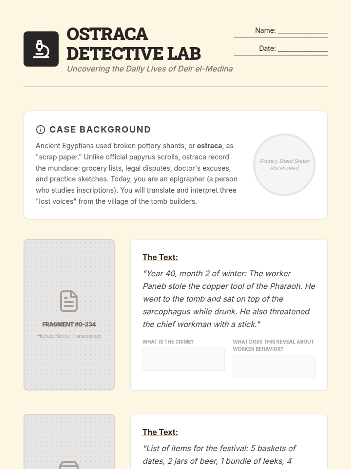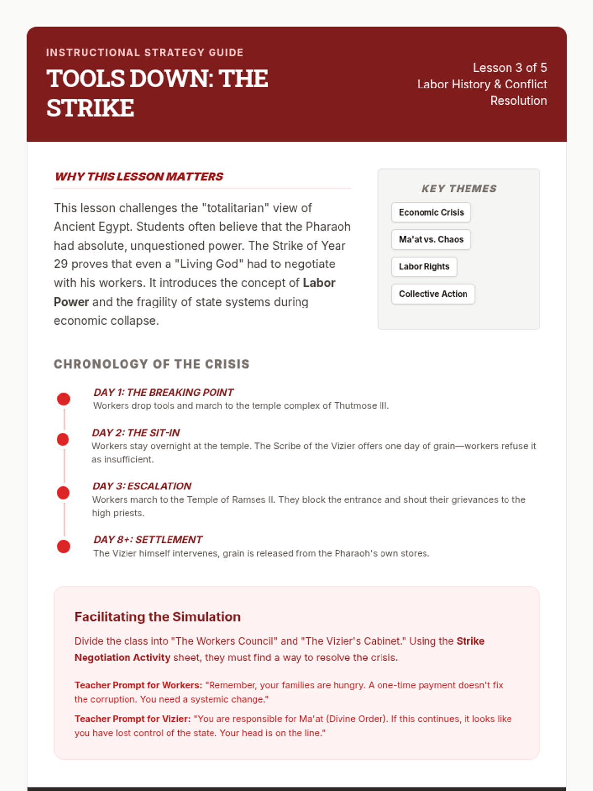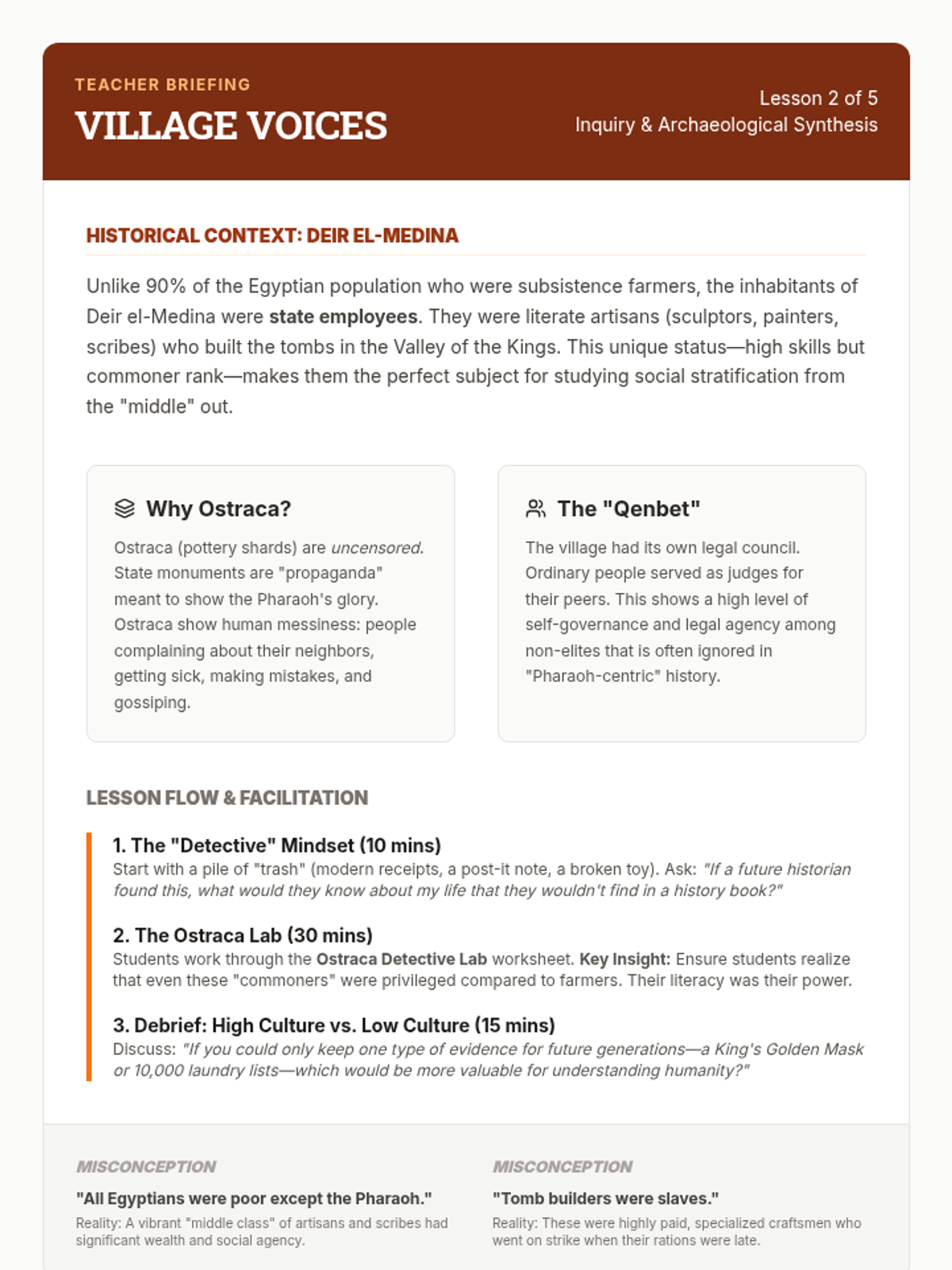 A social history sequence for 10th grade students that examines Ancient Egypt and Kush through the lens of labor systems, social stratification, and the daily lives of non-elites, centered on evidence from Deir el-Medina.