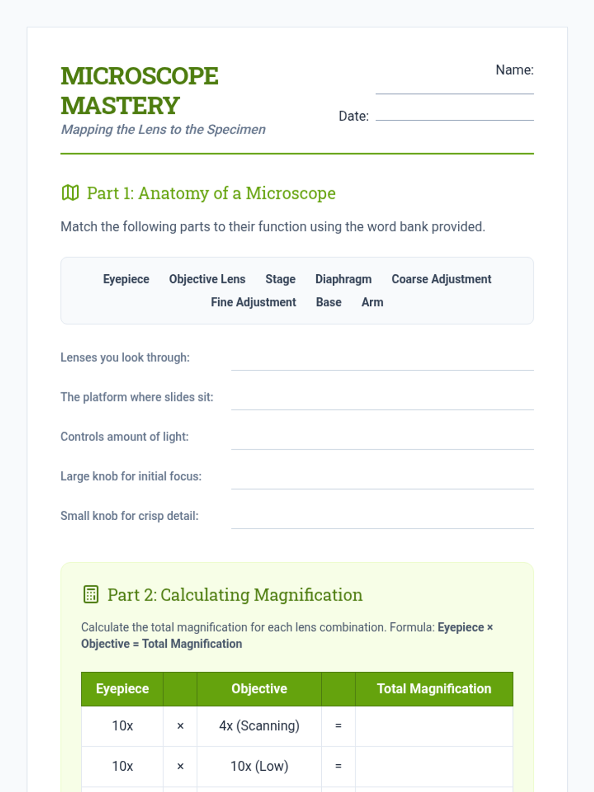 A comprehensive one-week unit covering the foundations of cell theory, the technical mastery of microscopes, and the fascinating structures of unicellular organisms (Amoeba, Paramecium, Euglena, and Volvox).