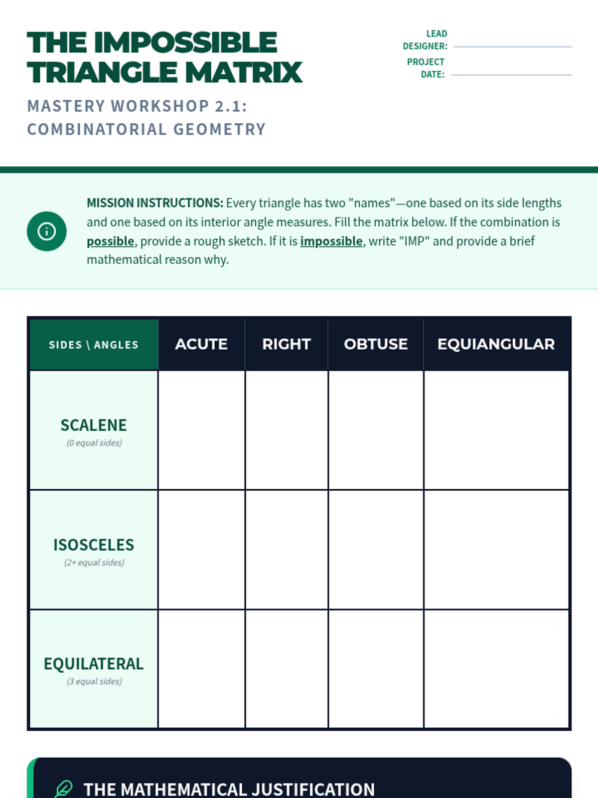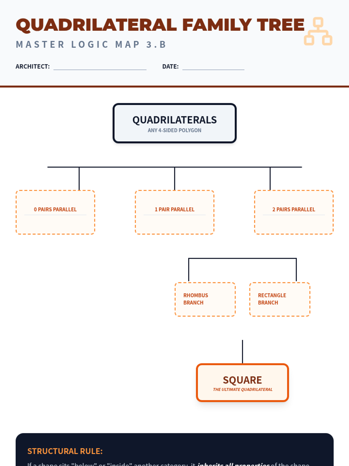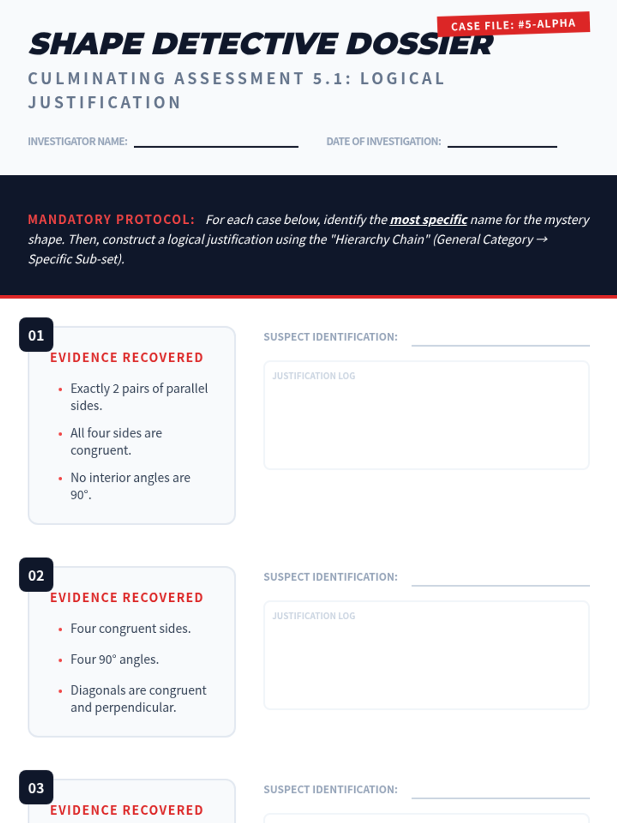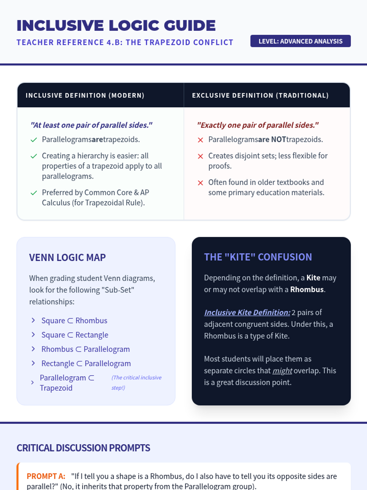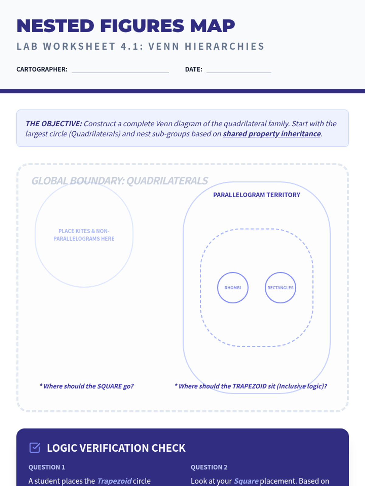 A comprehensive 10th-grade geometry unit focused on the hierarchical classification of 2D figures. Students explore triangles and quadrilaterals through inquiry-based investigations, Venn diagram mapping, and deductive reasoning to understand inclusive definitions and geometric properties.