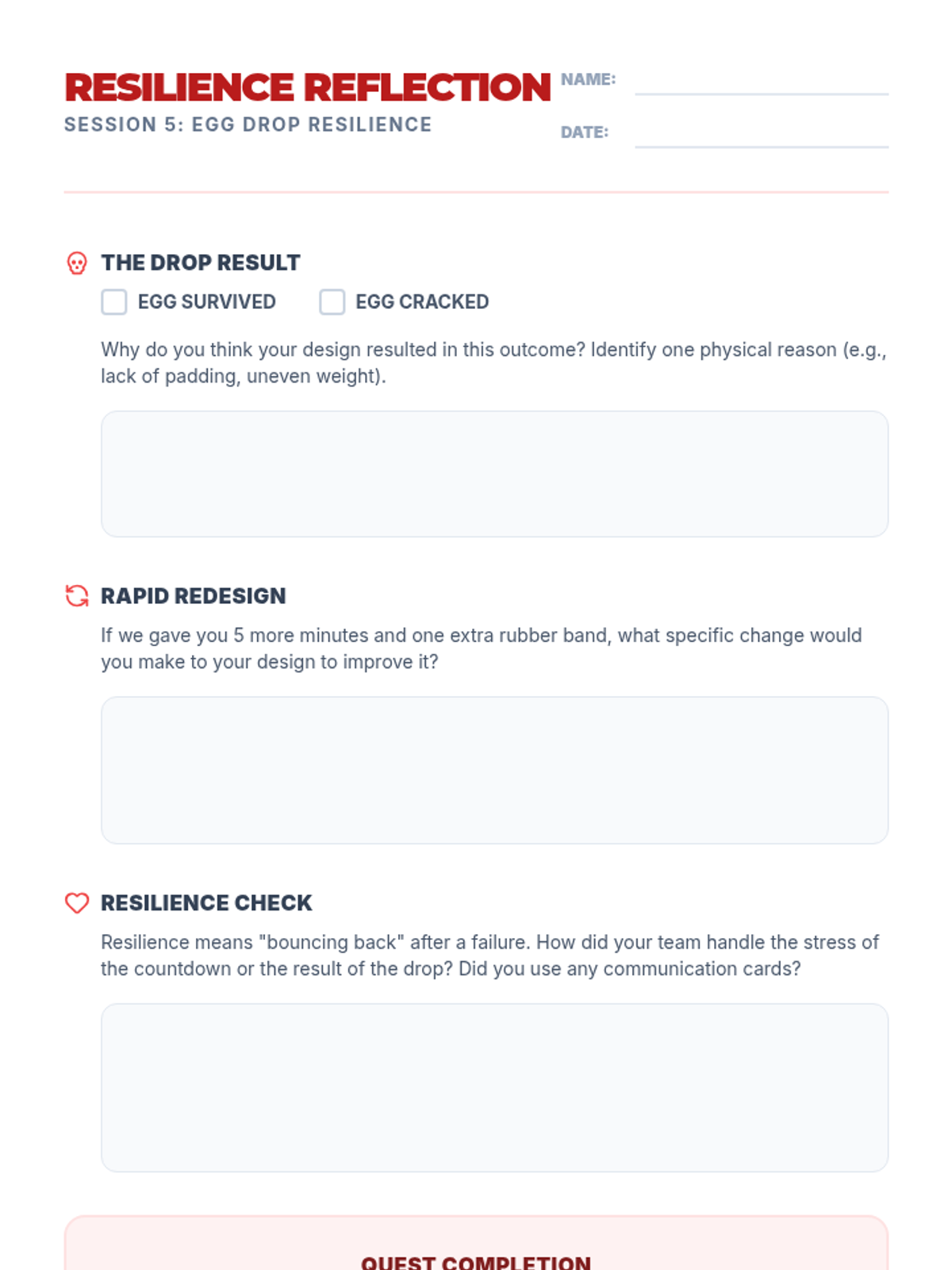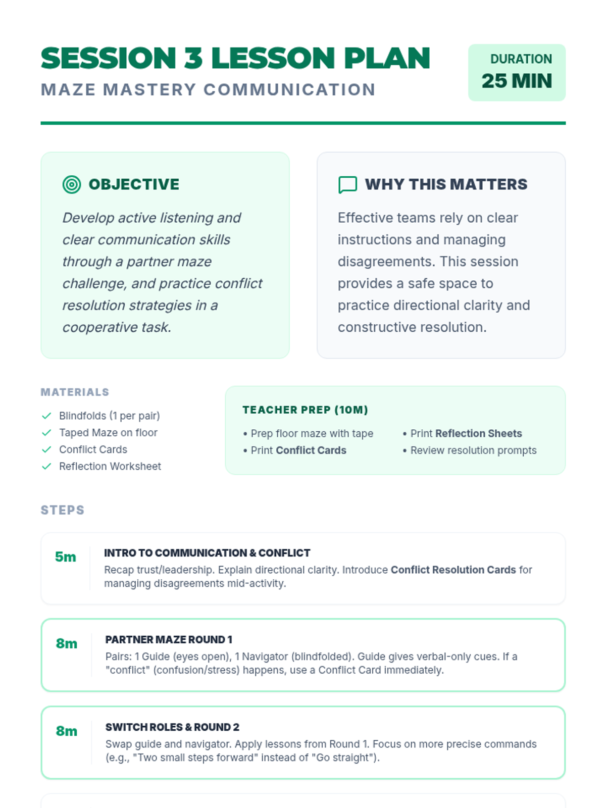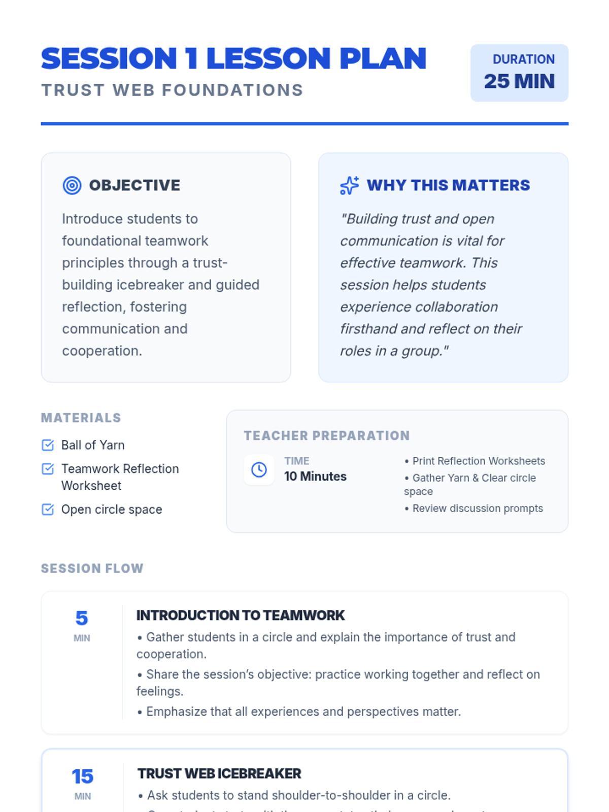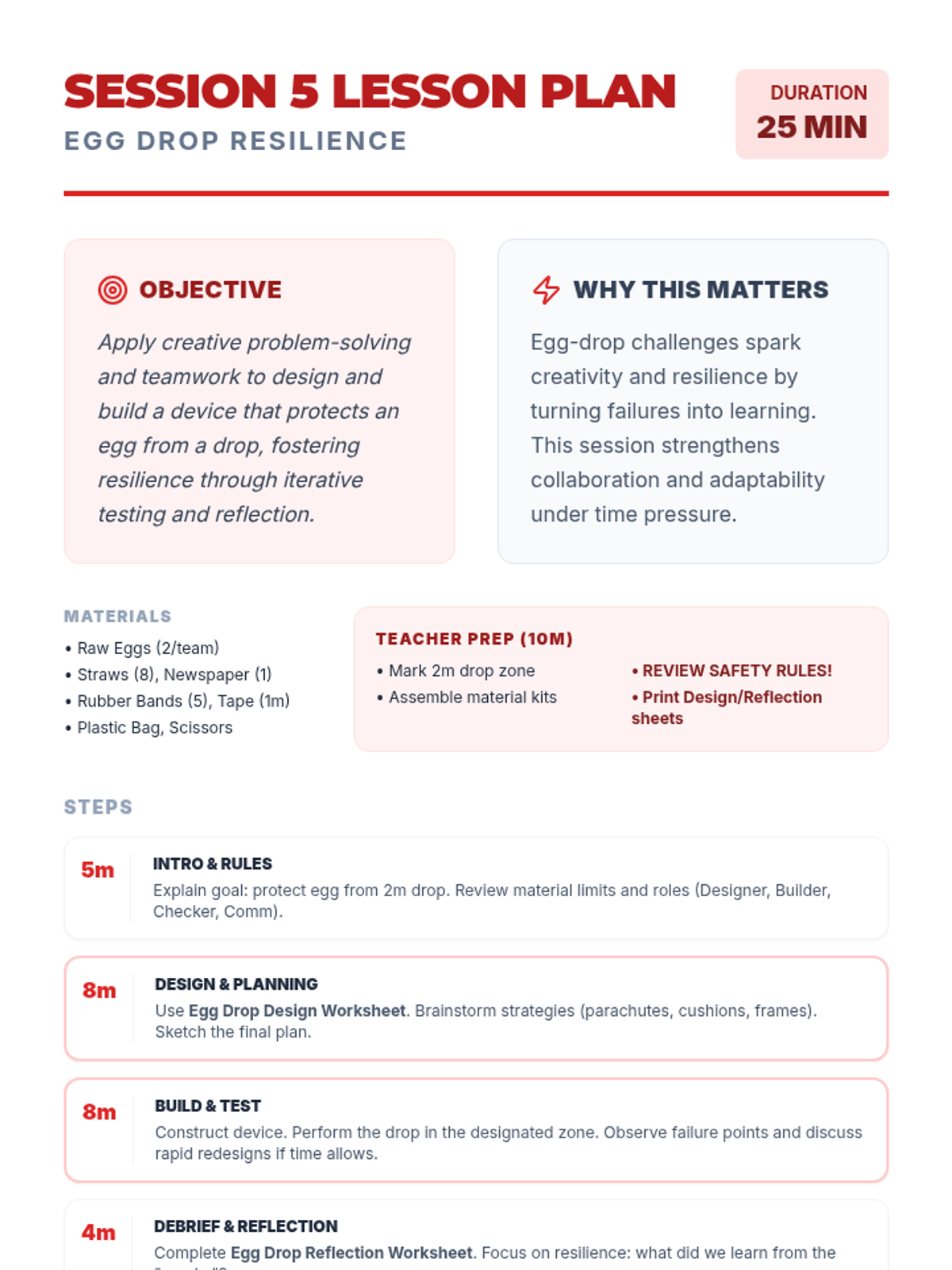A 5-session journey for middle schoolers to develop trust, leadership, communication, and resilience through hands-on team challenges. Each session builds on the last, culminating in a community project and a classic engineering challenge.