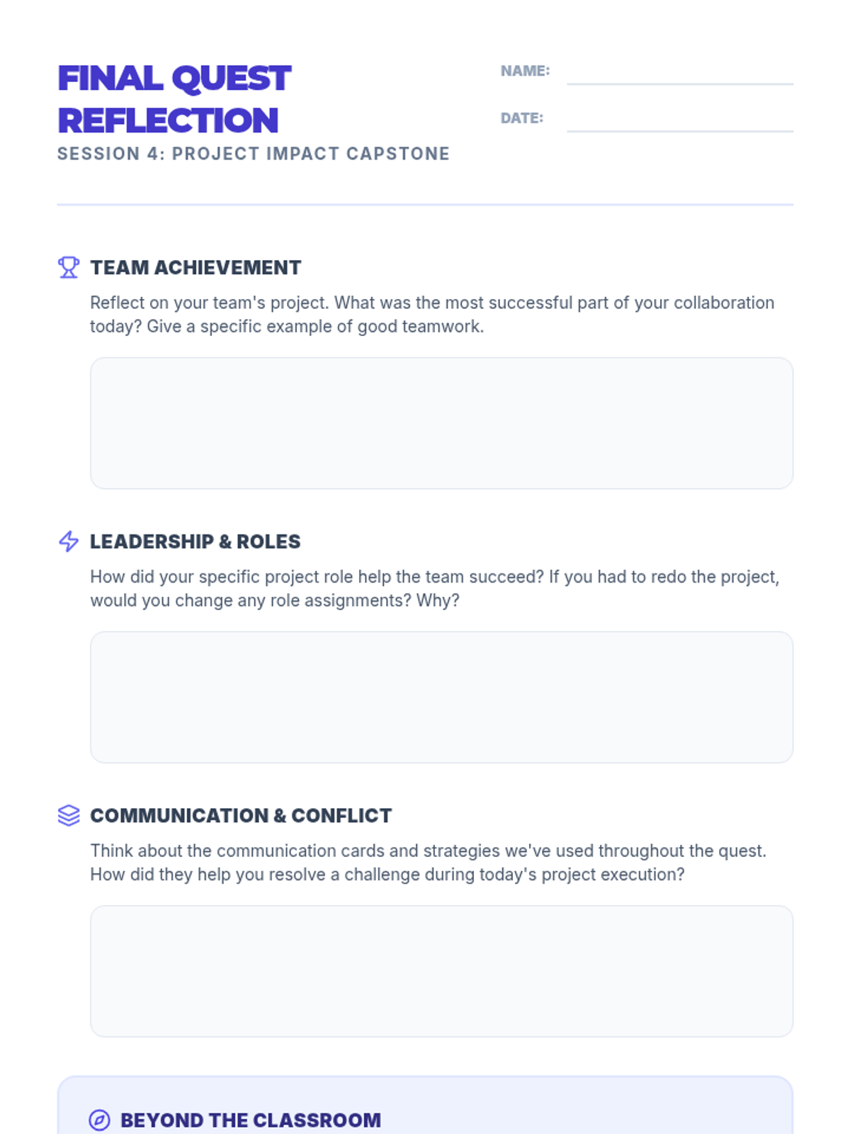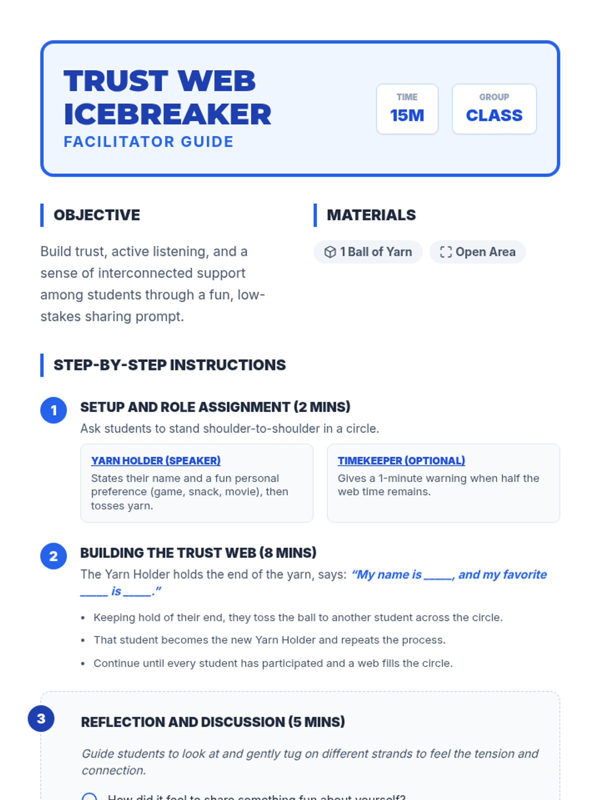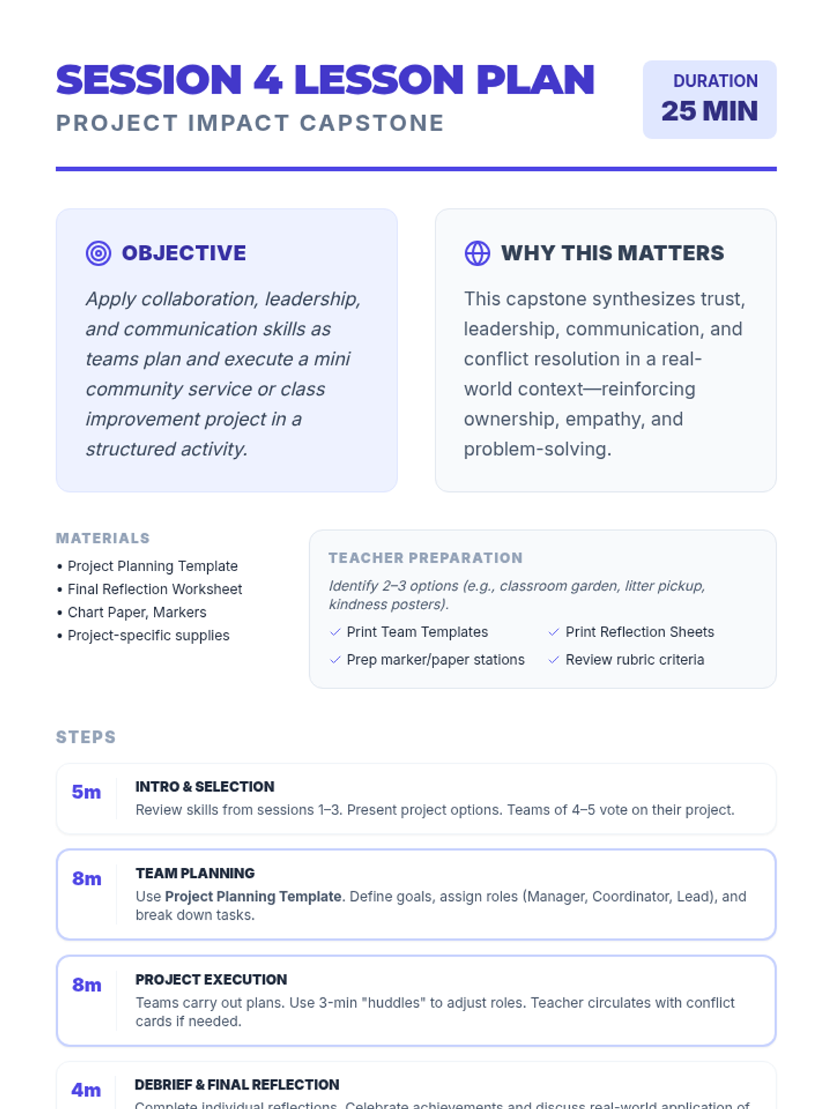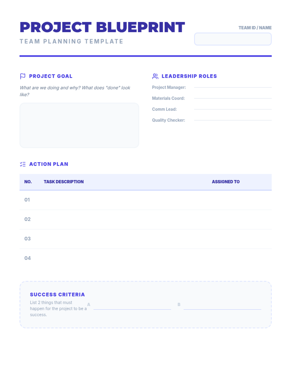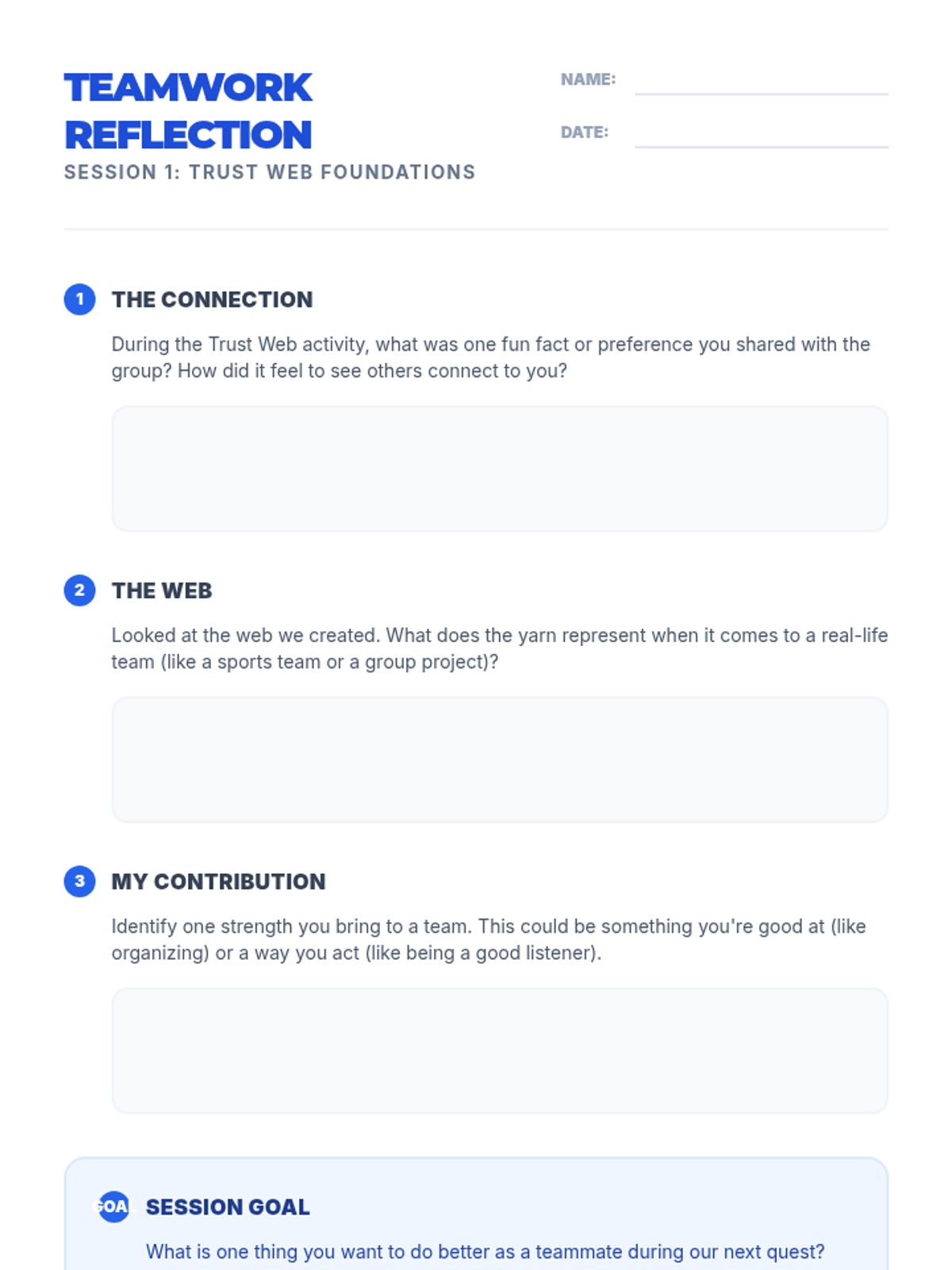 A 5-session journey for middle schoolers to develop trust, leadership, communication, and resilience through hands-on team challenges. Each session builds on the last, culminating in a community project and a classic engineering challenge.