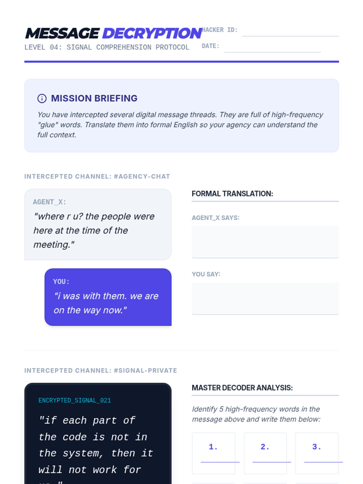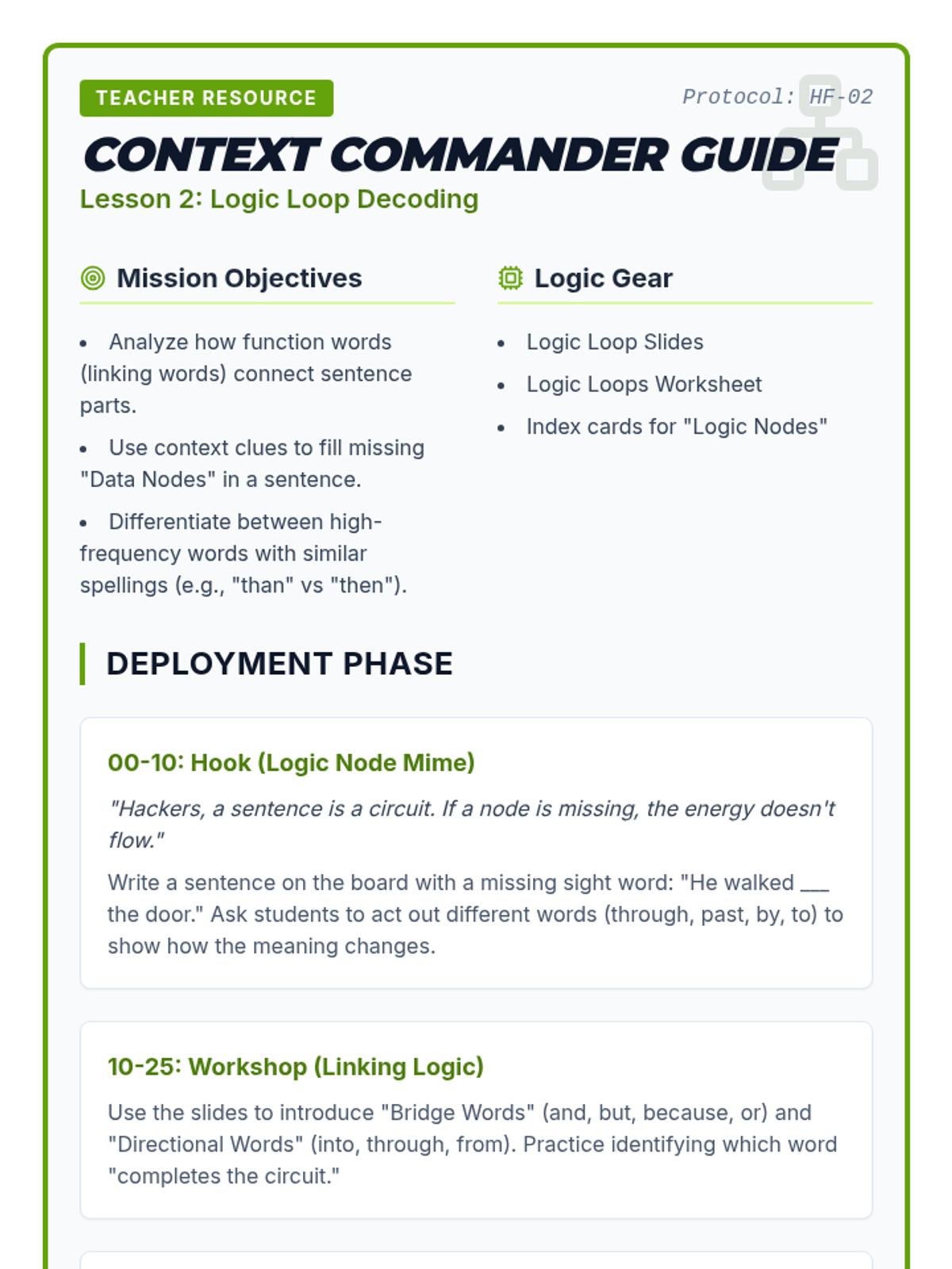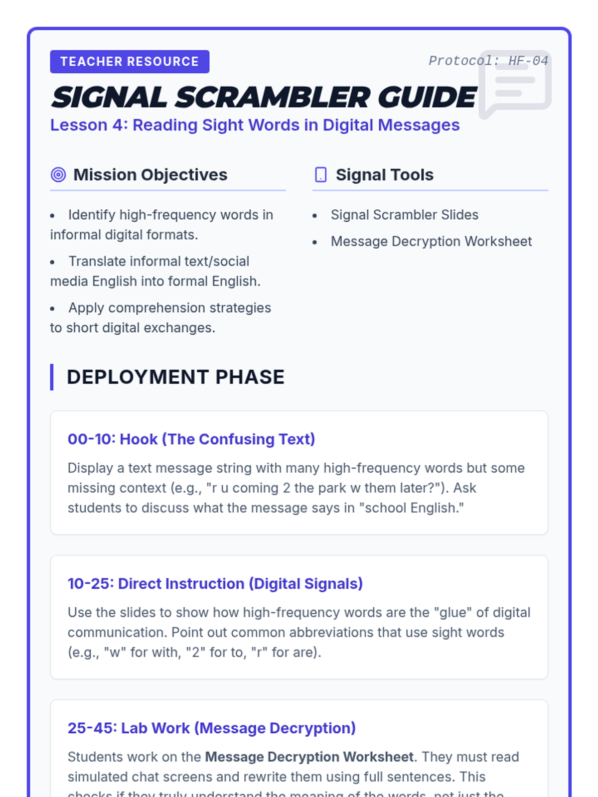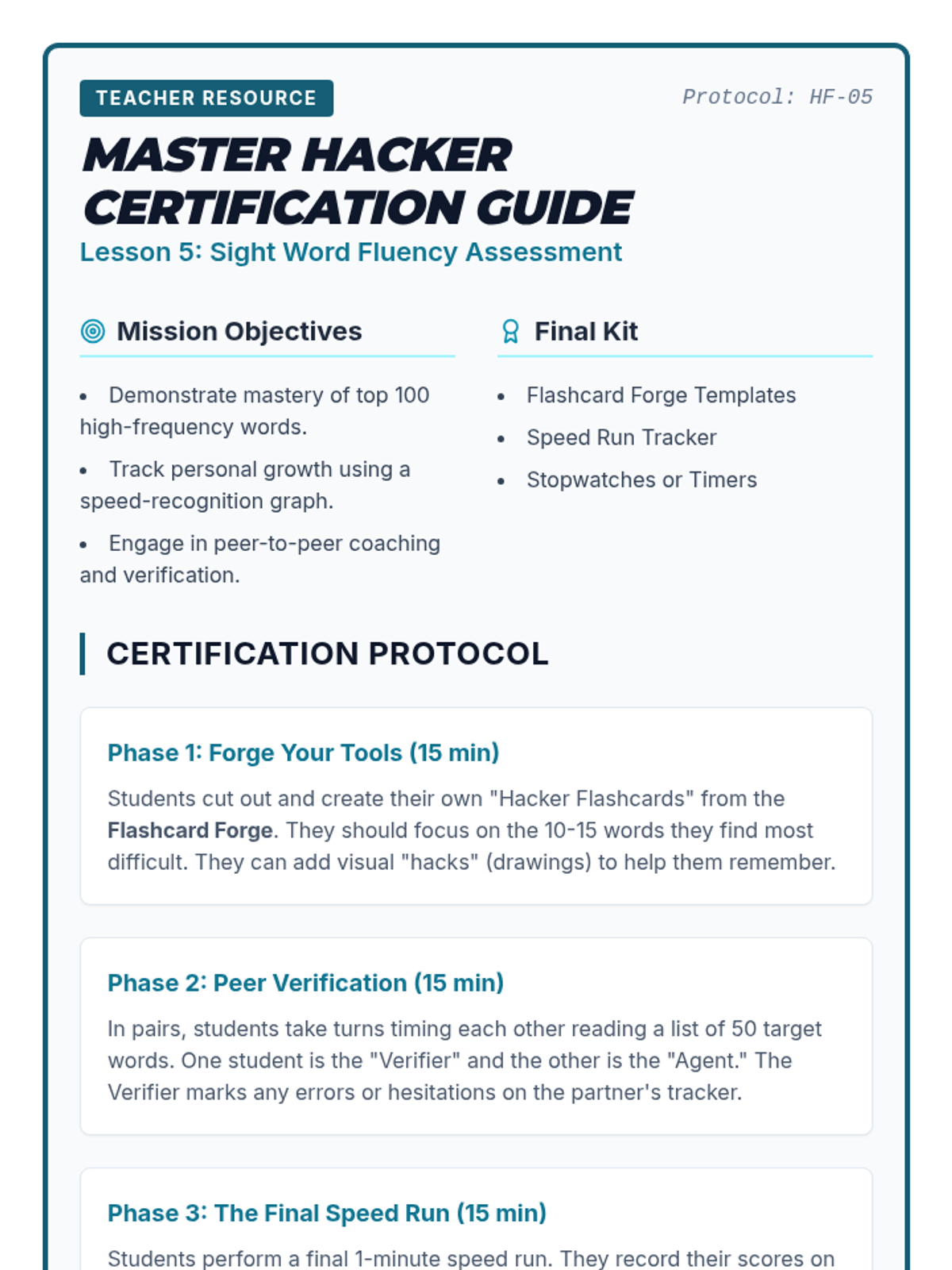 This sequence targets the top 100 high-frequency words for 8th-grade English learners. Using a 'Word Hacker' theme, students build automaticity through gamified recognition, contextual analysis, and digital literacy exercises to improve overall reading fluency.