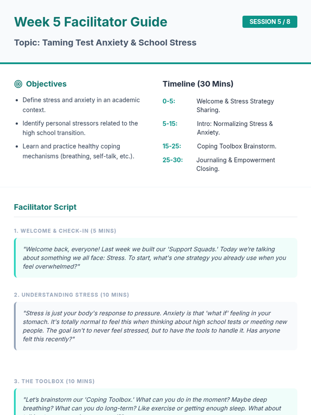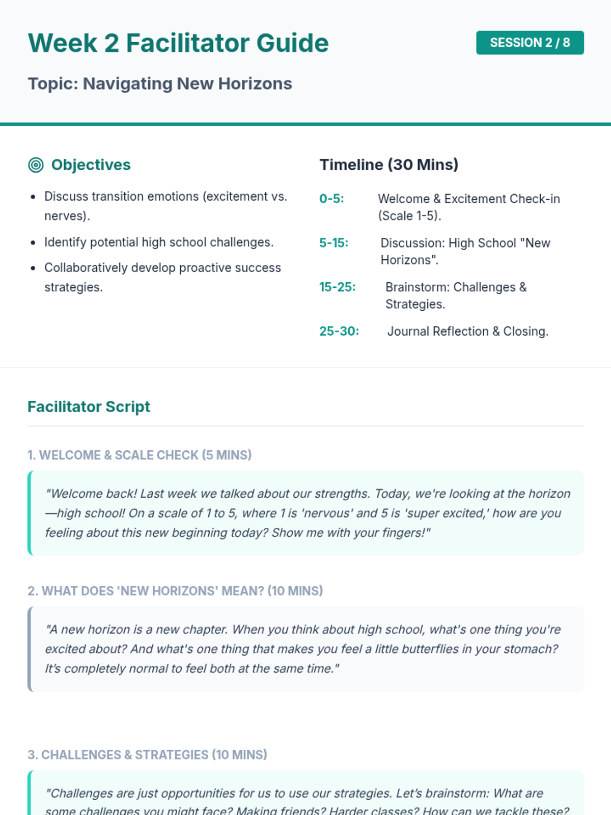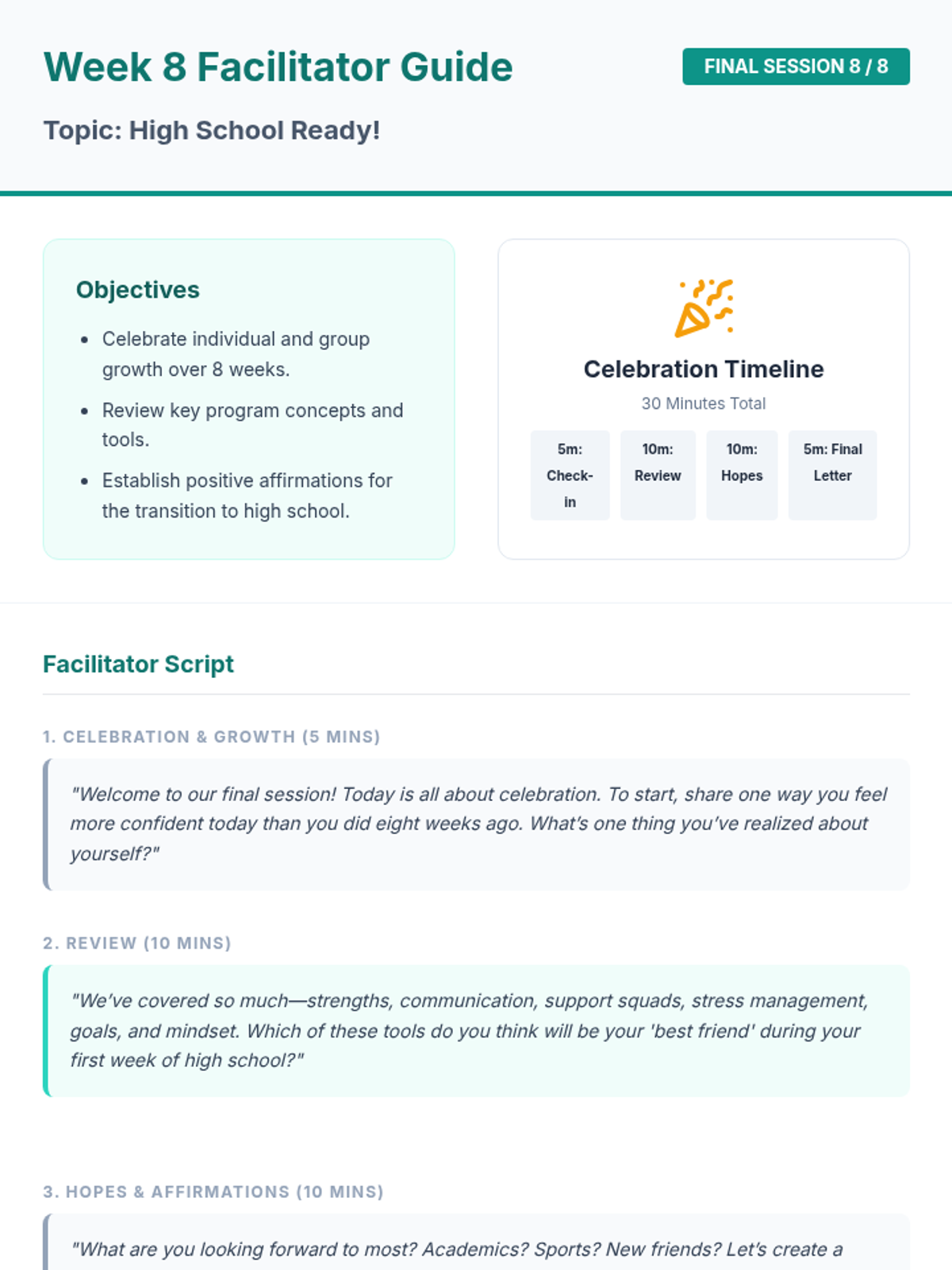 An 8-week group counseling program for 8th-grade students to build confidence and essential skills for the transition to high school. Through interactive sessions, journaling, and group discussion, students develop self-esteem, communication skills, and stress-management tools.