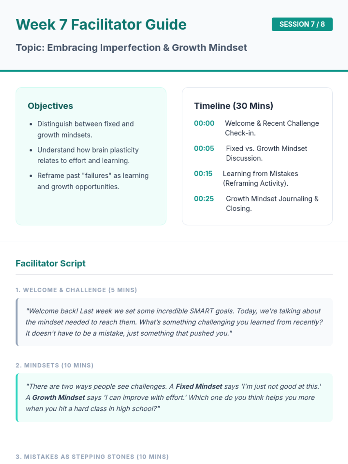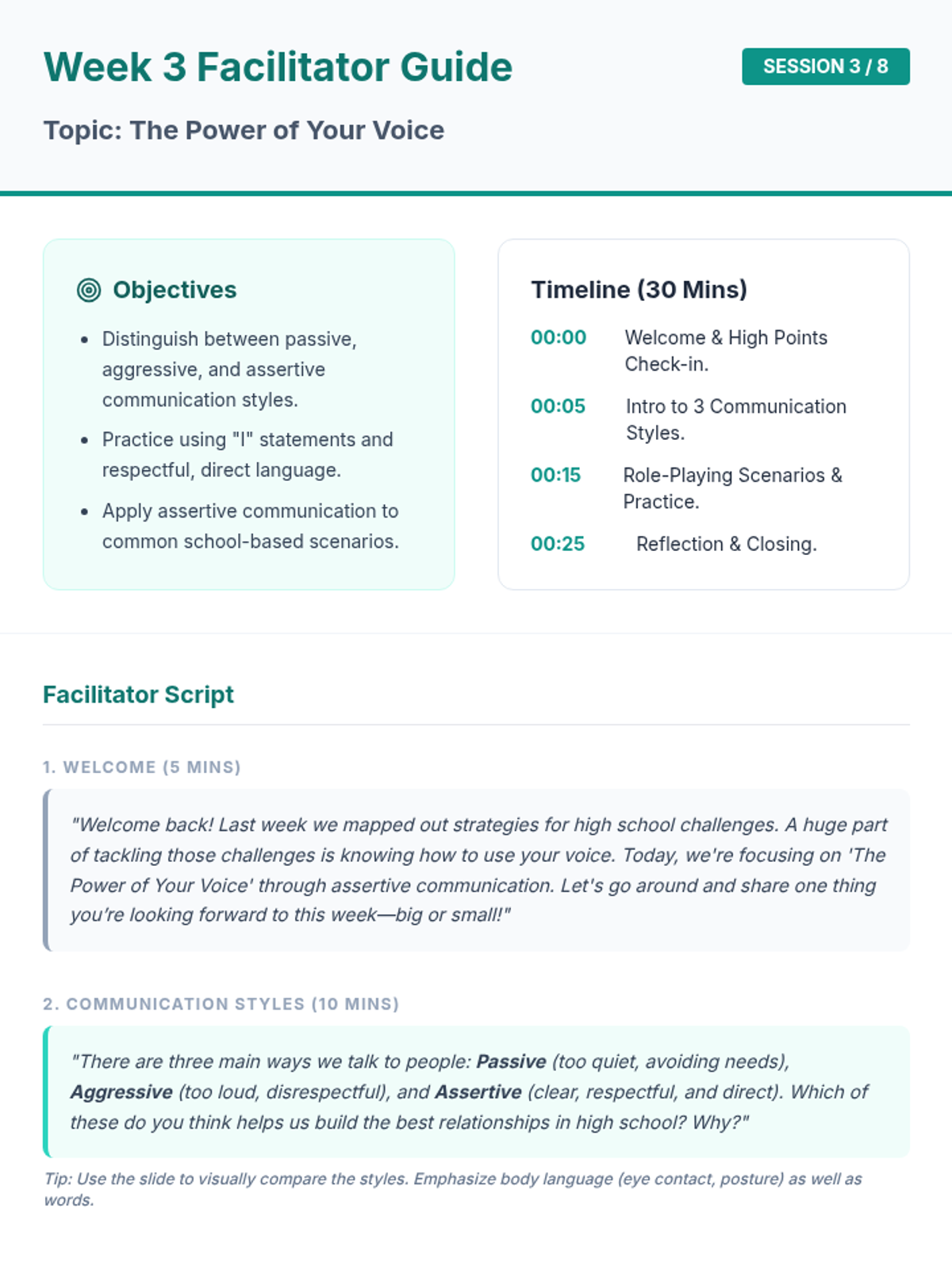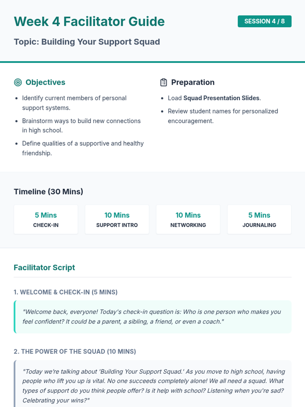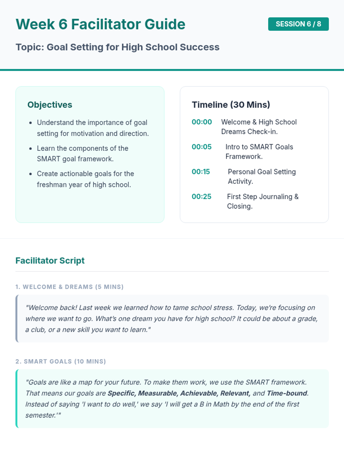 An 8-week group counseling program for 8th-grade students to build confidence and essential skills for the transition to high school. Through interactive sessions, journaling, and group discussion, students develop self-esteem, communication skills, and stress-management tools.