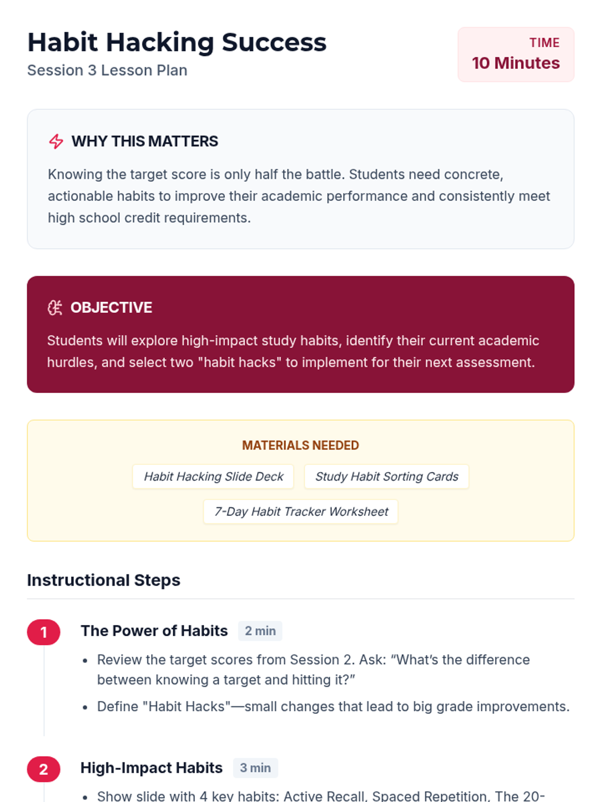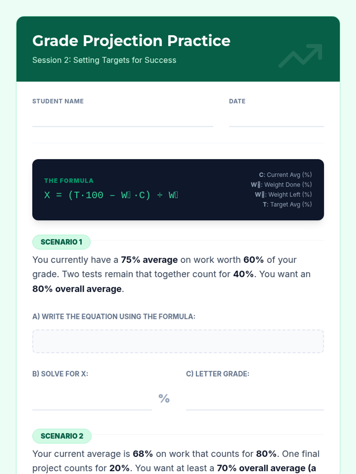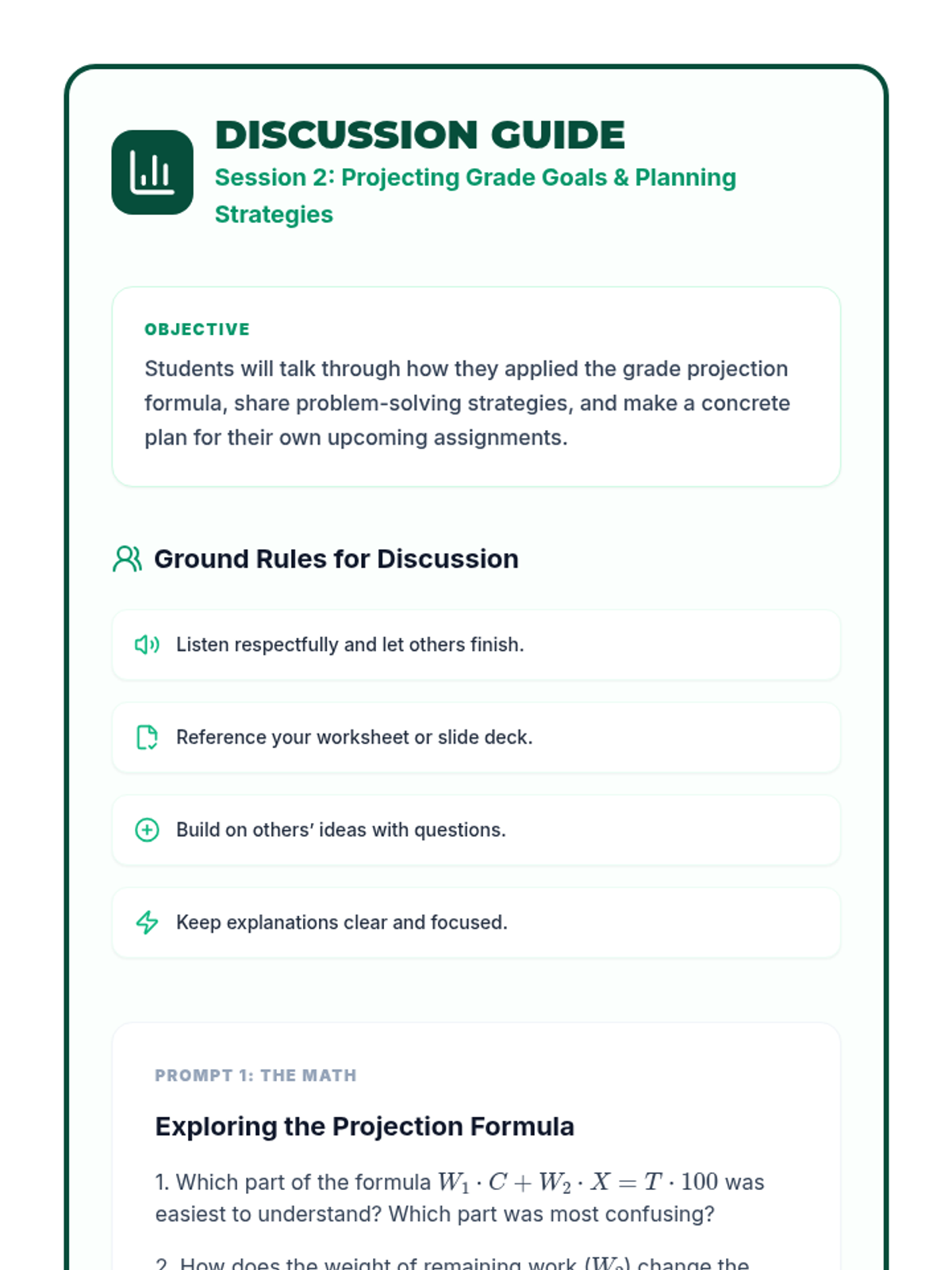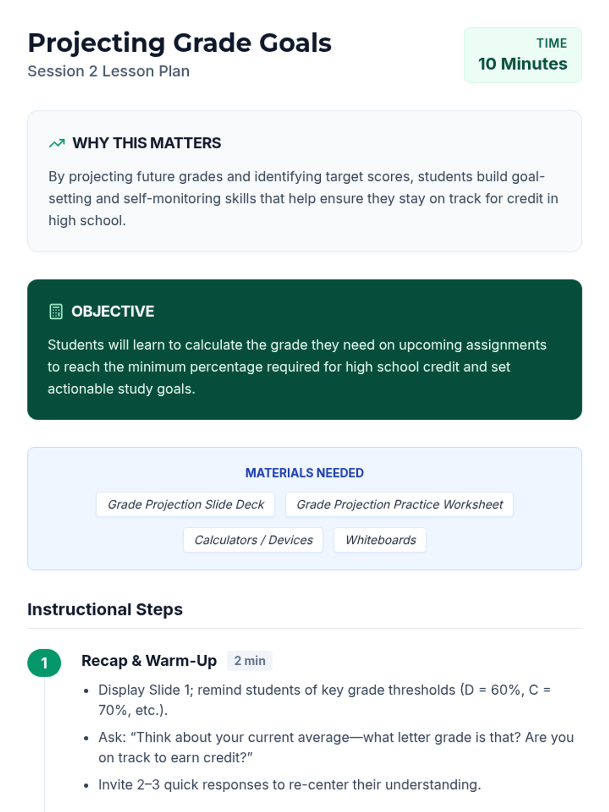 A 4-session sequence for middle school students to learn grade tracking, projection calculations, and study habits to ensure they stay on track for high school credit. Students progress from understanding grade scales to creating a personalized academic success plan.