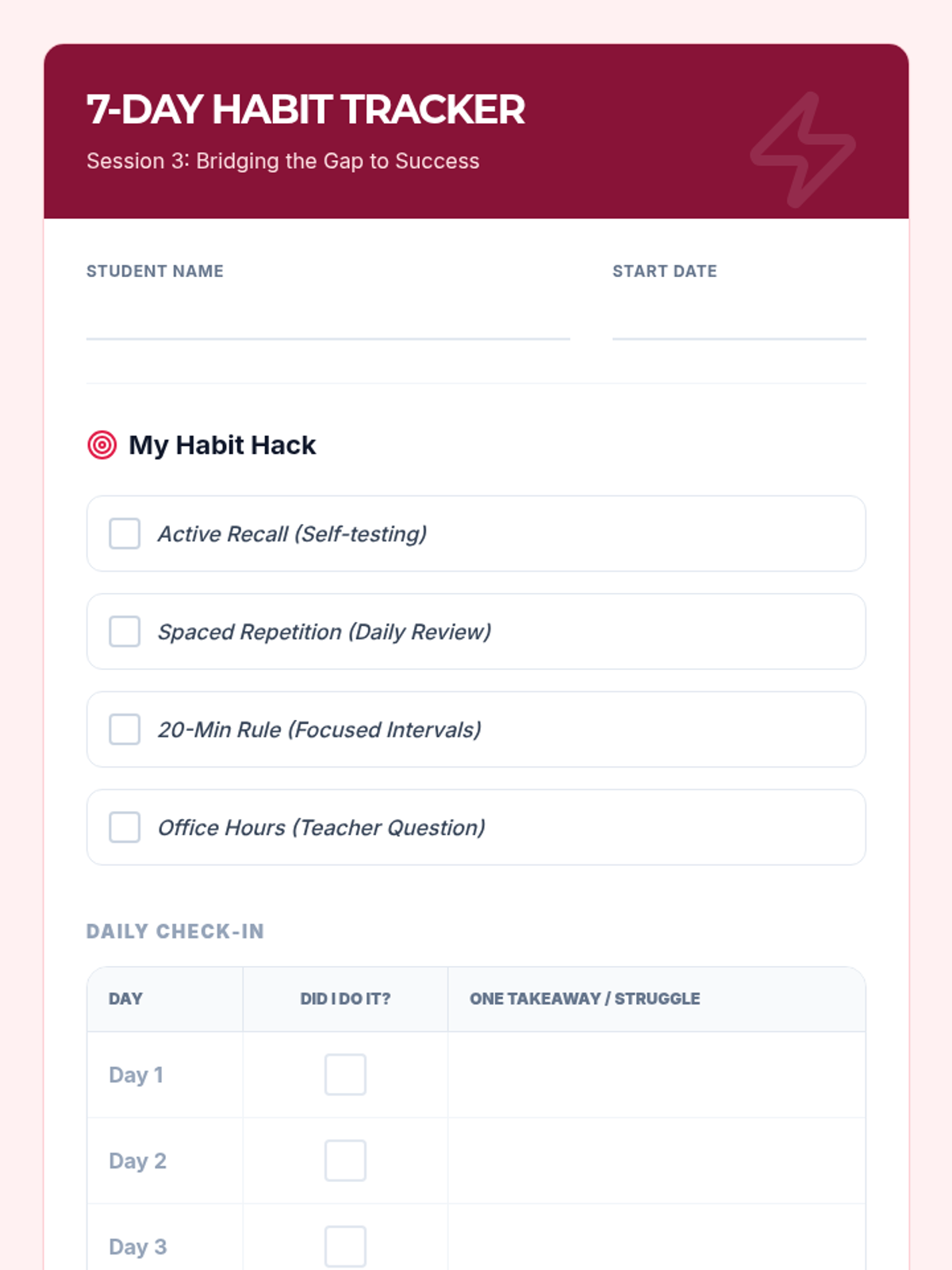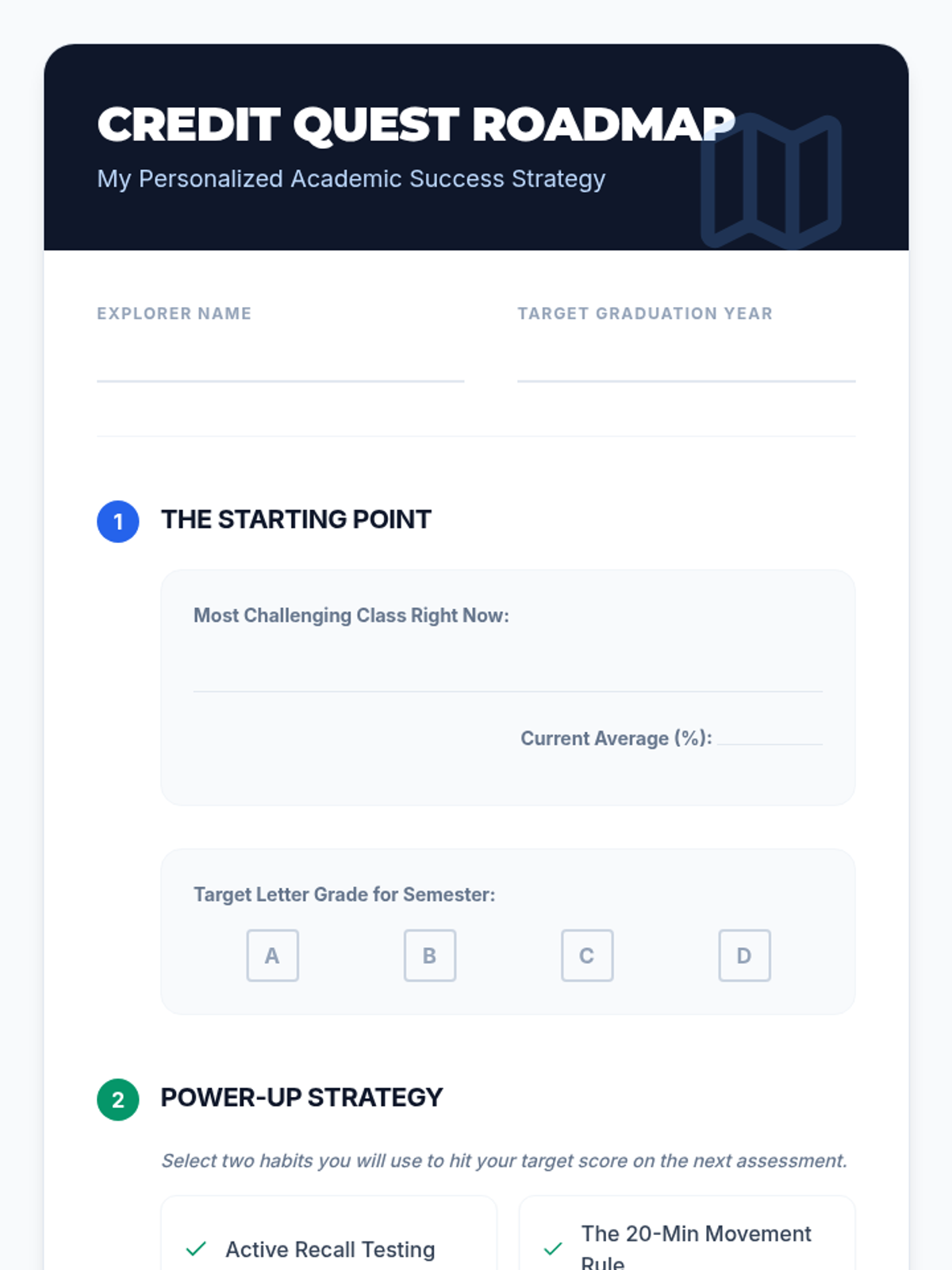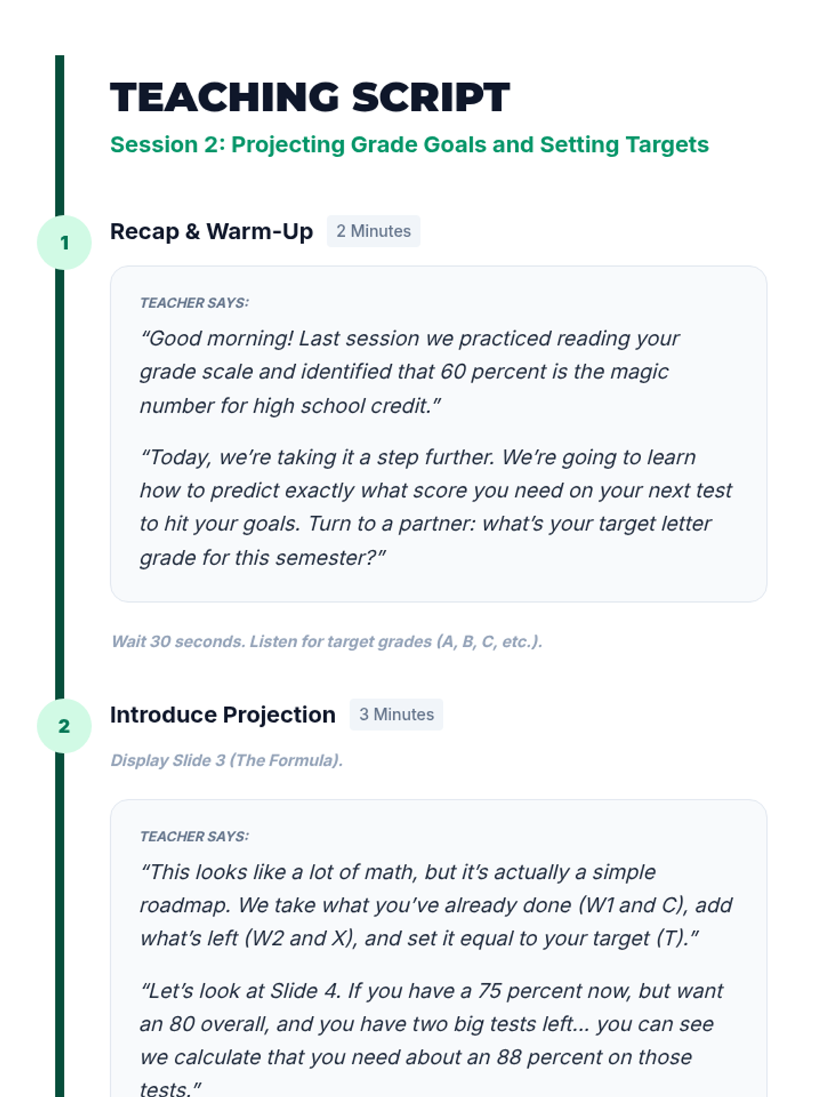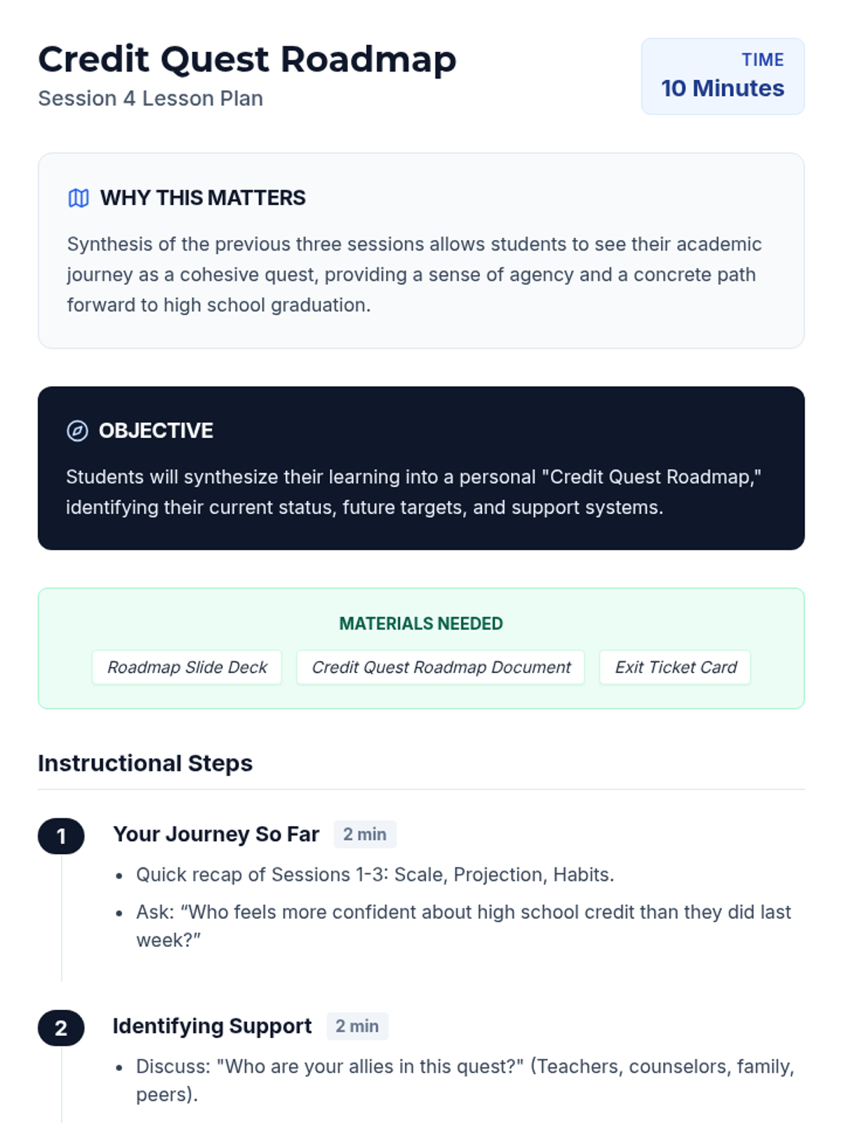 A 4-session sequence for middle school students to learn grade tracking, projection calculations, and study habits to ensure they stay on track for high school credit. Students progress from understanding grade scales to creating a personalized academic success plan.