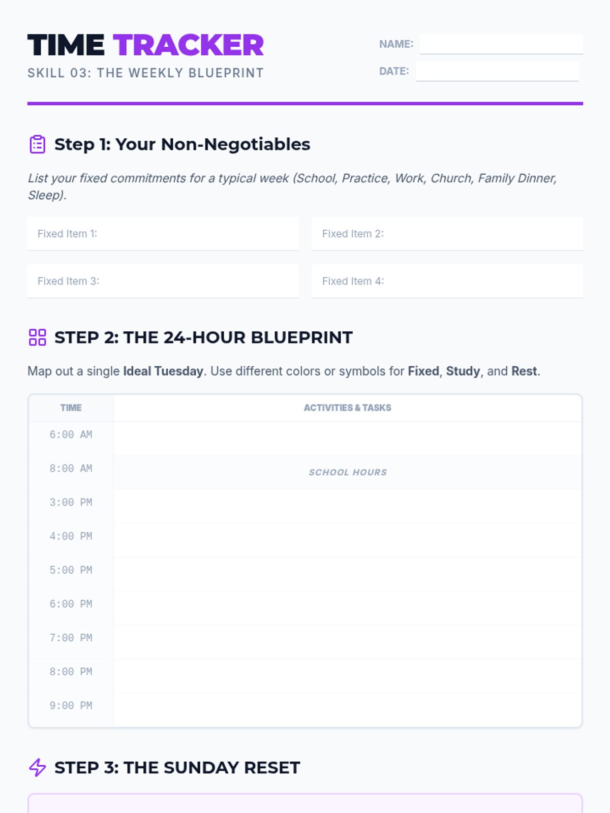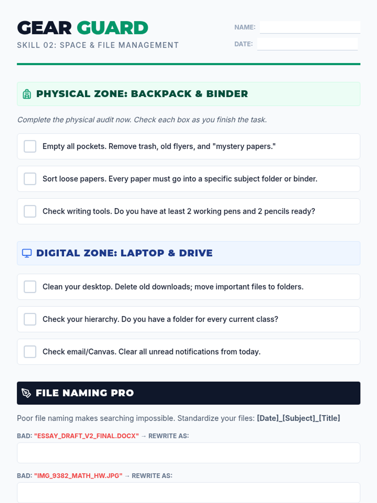 A 12-week comprehensive program designed to prepare 8th-grade students for the rigors of high school by mastering essential academic success skills. Each week focuses on a specific, actionable skill through bite-sized instruction and practical application.