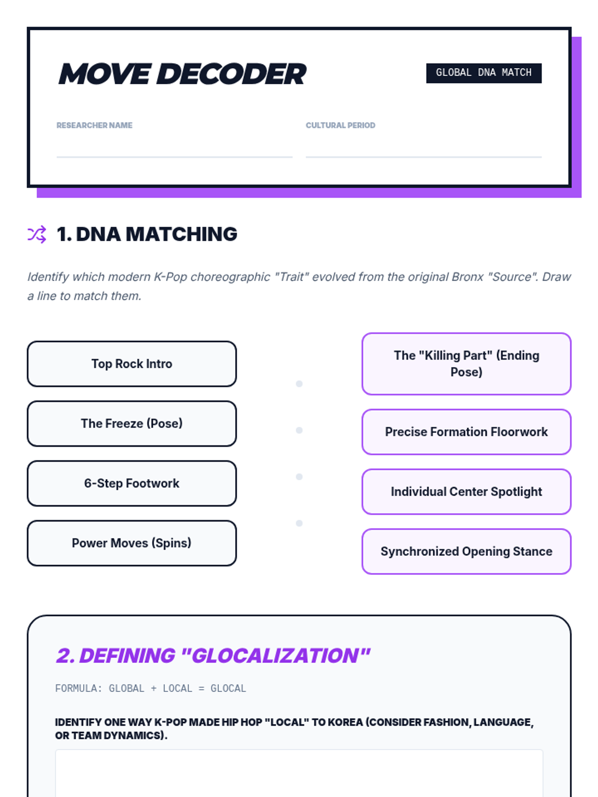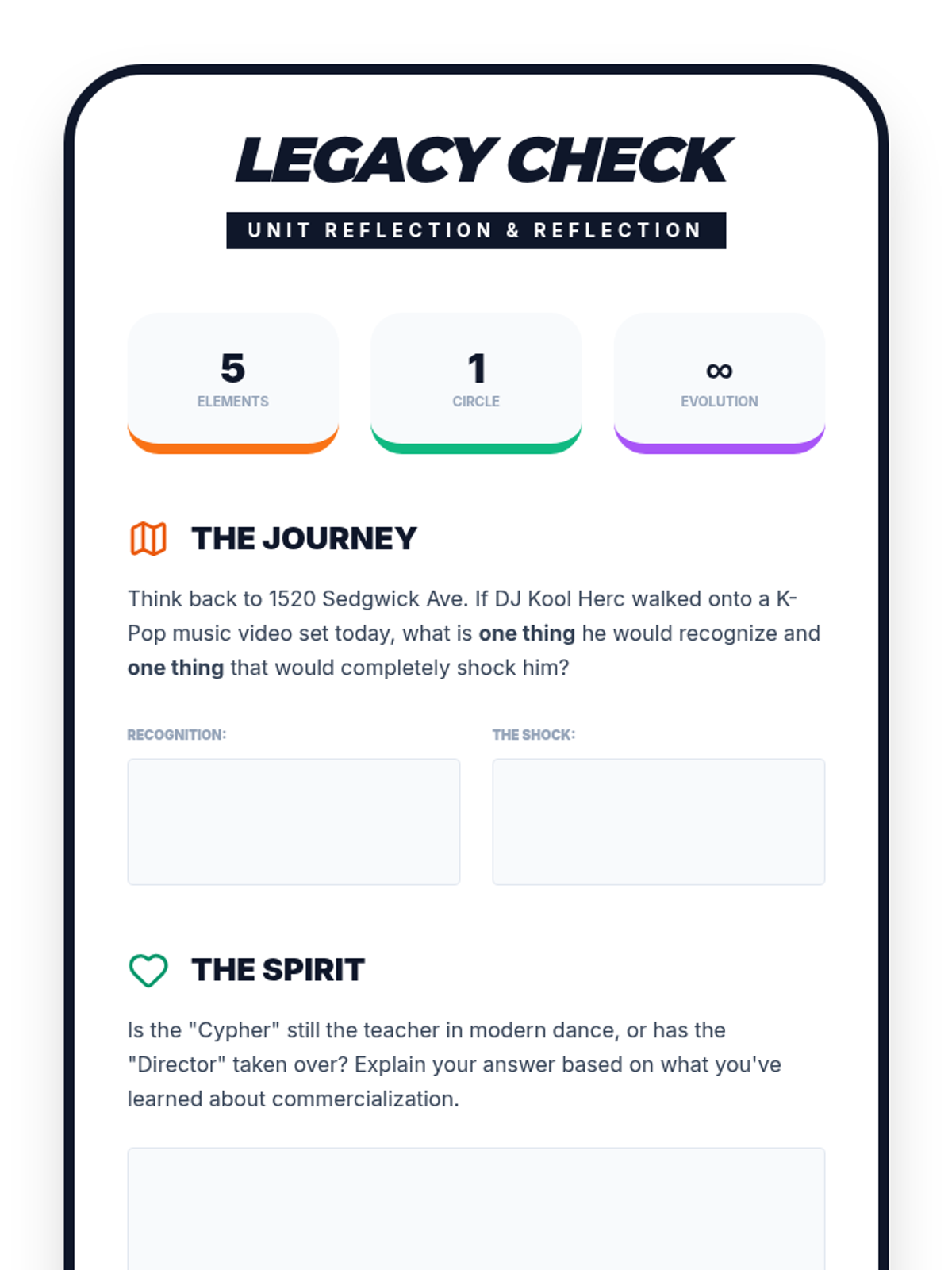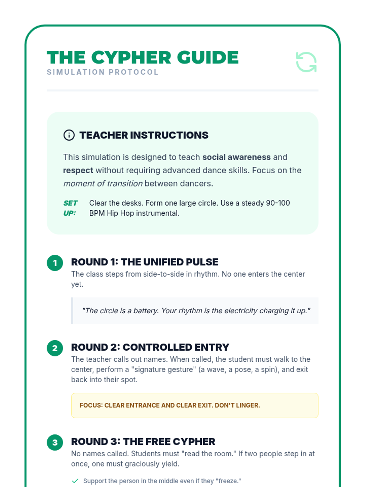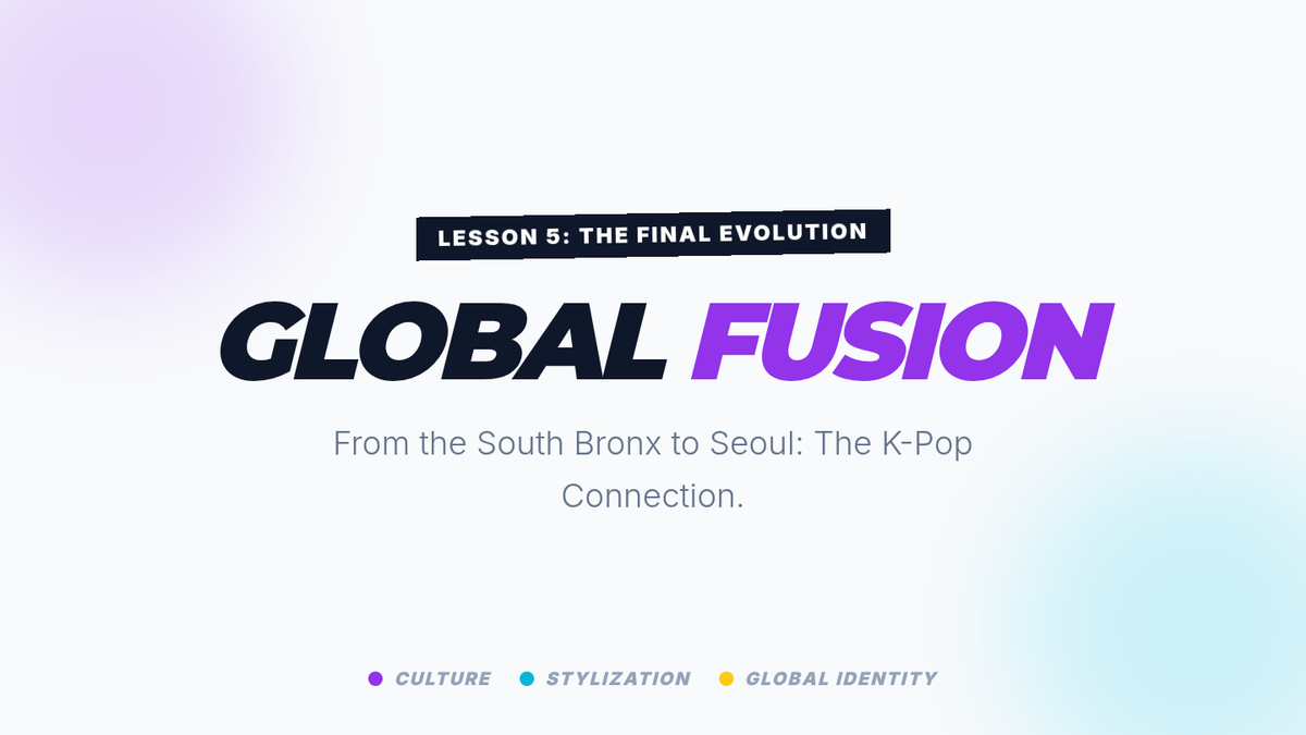 A high-energy exploration of Hip Hop culture's origins in the South Bronx and its evolution into a global phenomenon. Students analyze the socio-economic roots, the social dynamics of the cypher, the physical 'grammar' of breaking, the impact of commercialization, and the cross-cultural fusion seen in modern K-Pop.