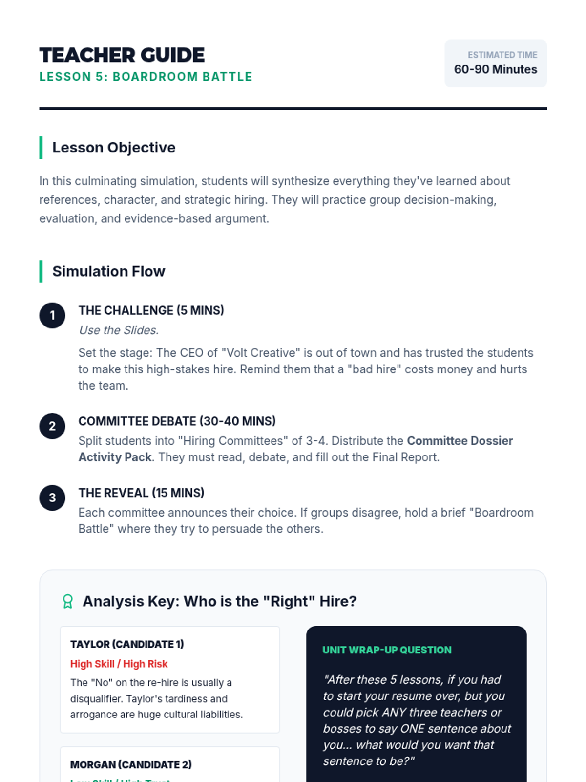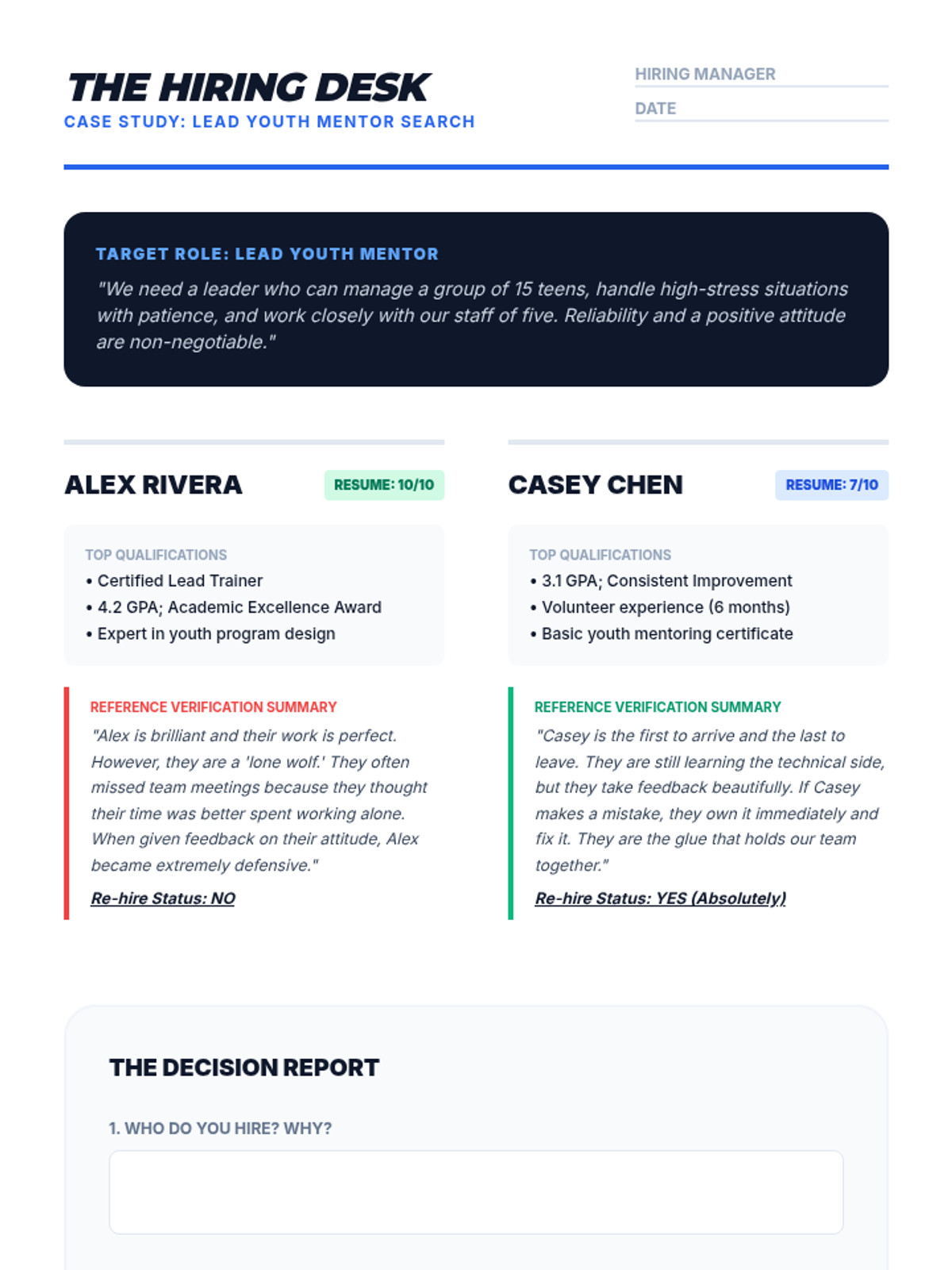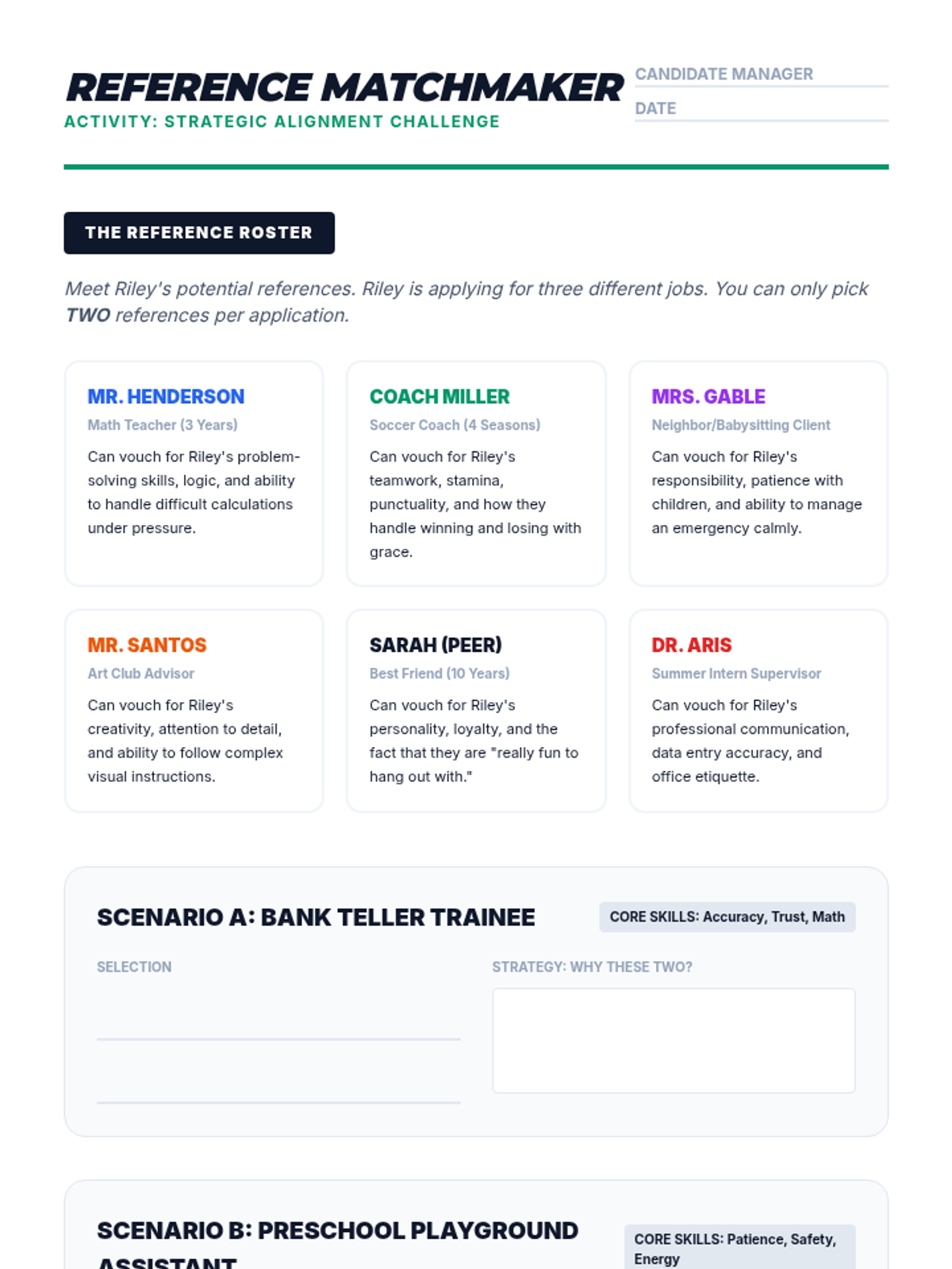 An inquiry-based unit where students act as hiring managers to understand the strategic power of professional references in the job market. Students move from decoding reference forms to strategically selecting references and managing professional reputations.