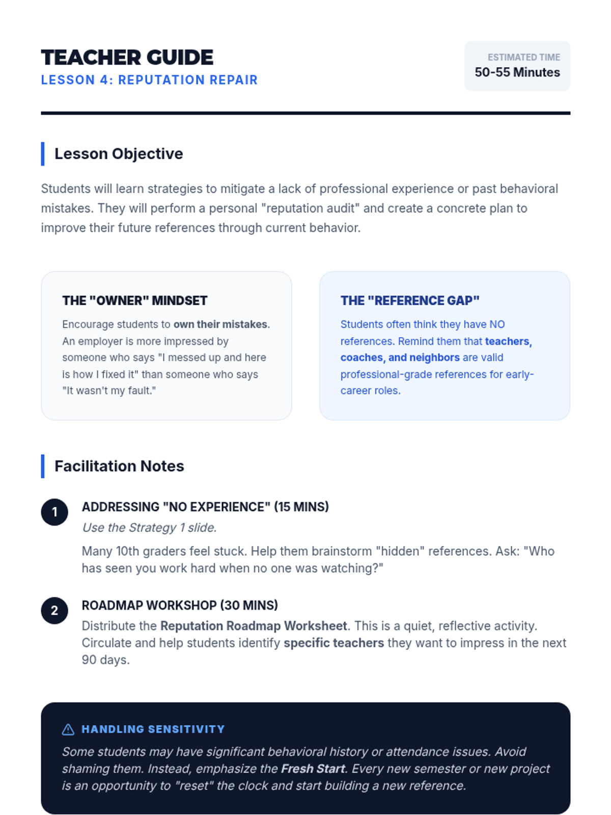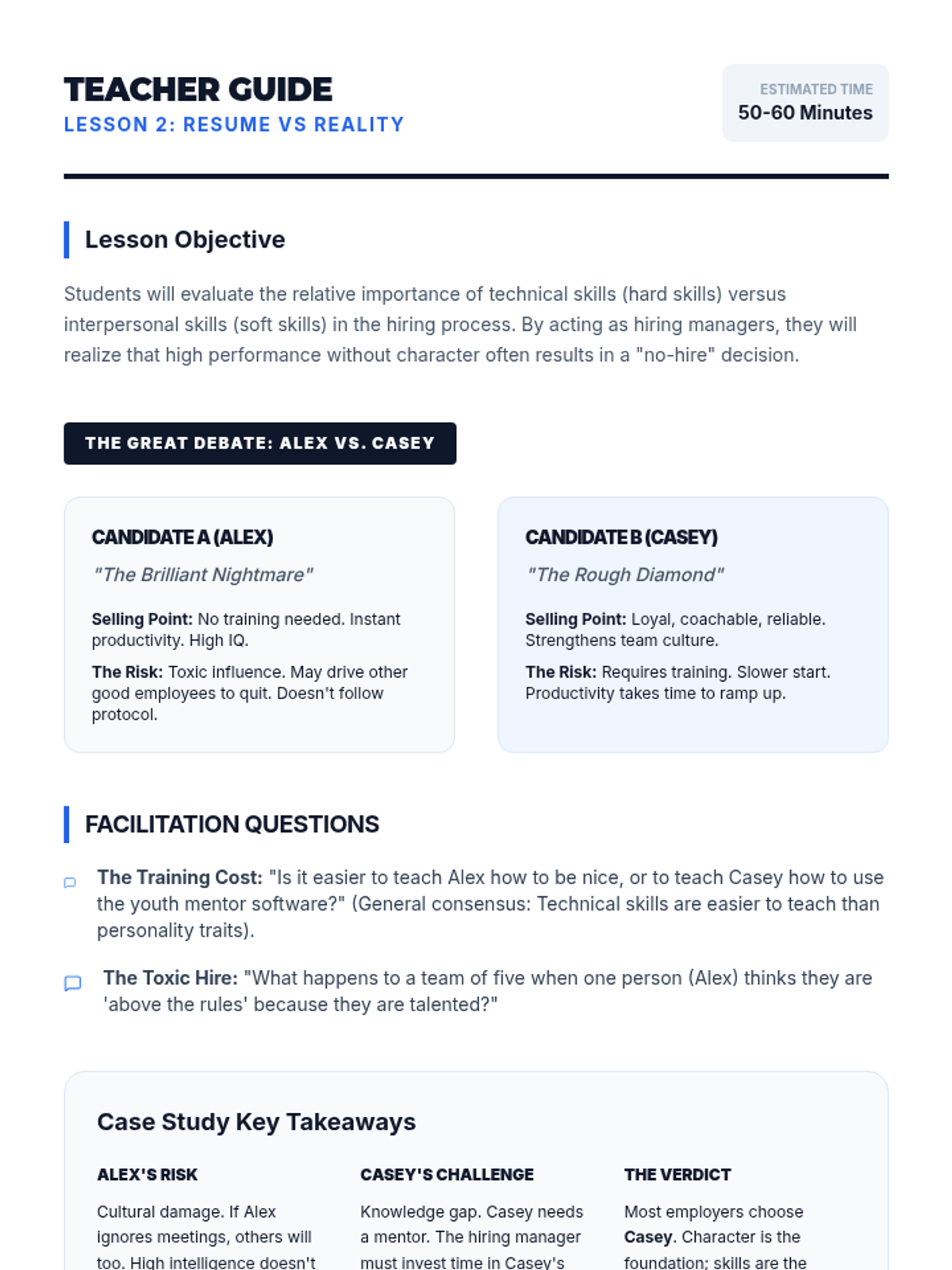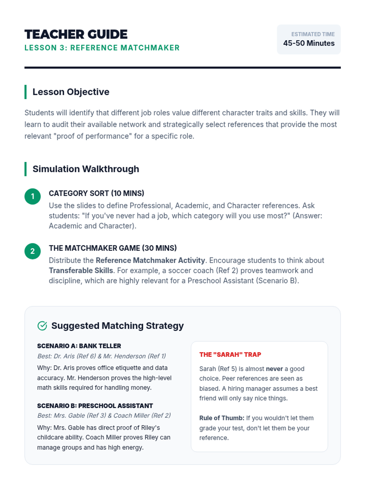 An inquiry-based unit where students act as hiring managers to understand the strategic power of professional references in the job market. Students move from decoding reference forms to strategically selecting references and managing professional reputations.