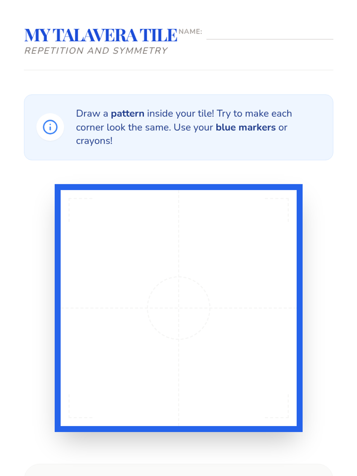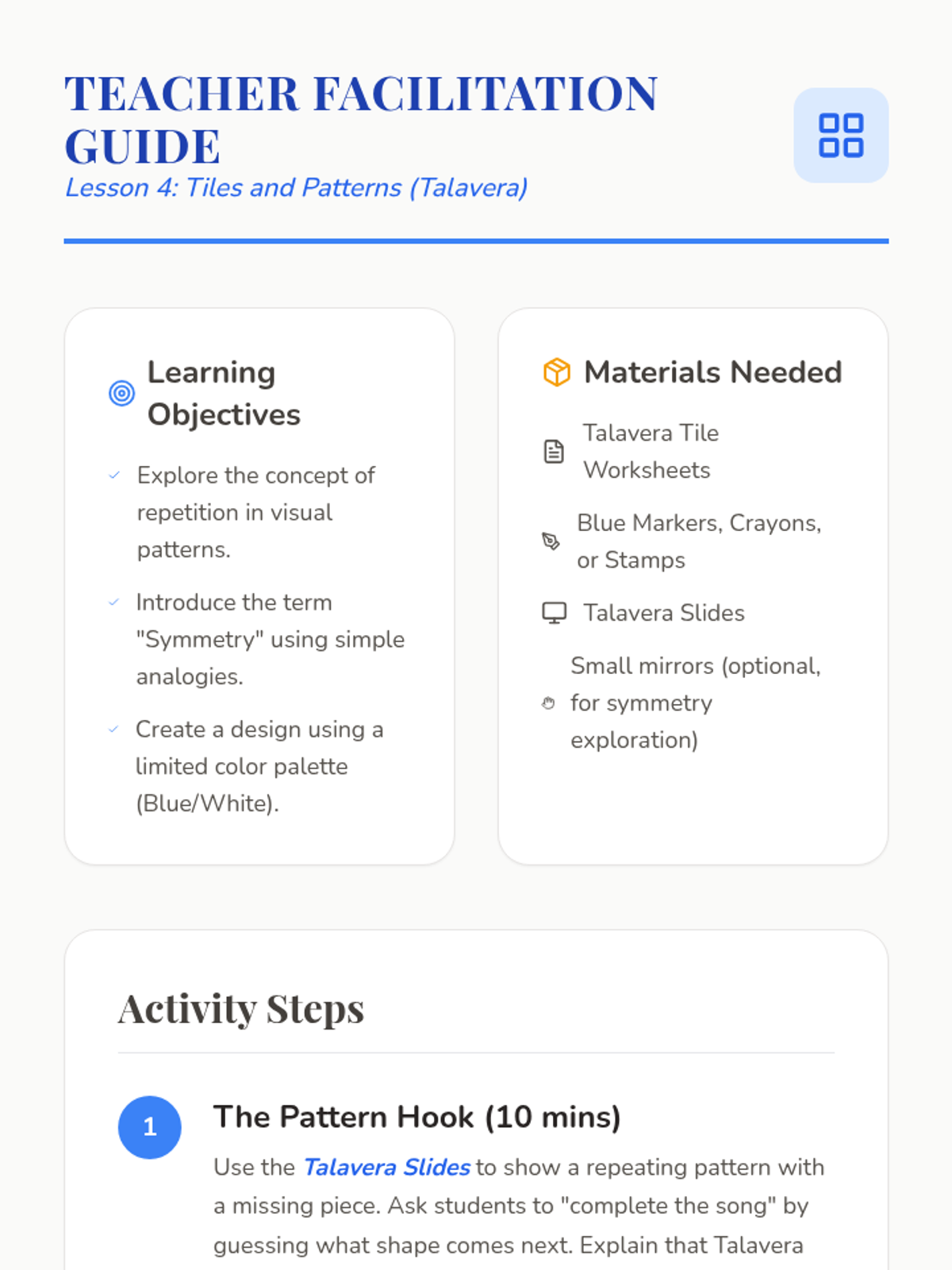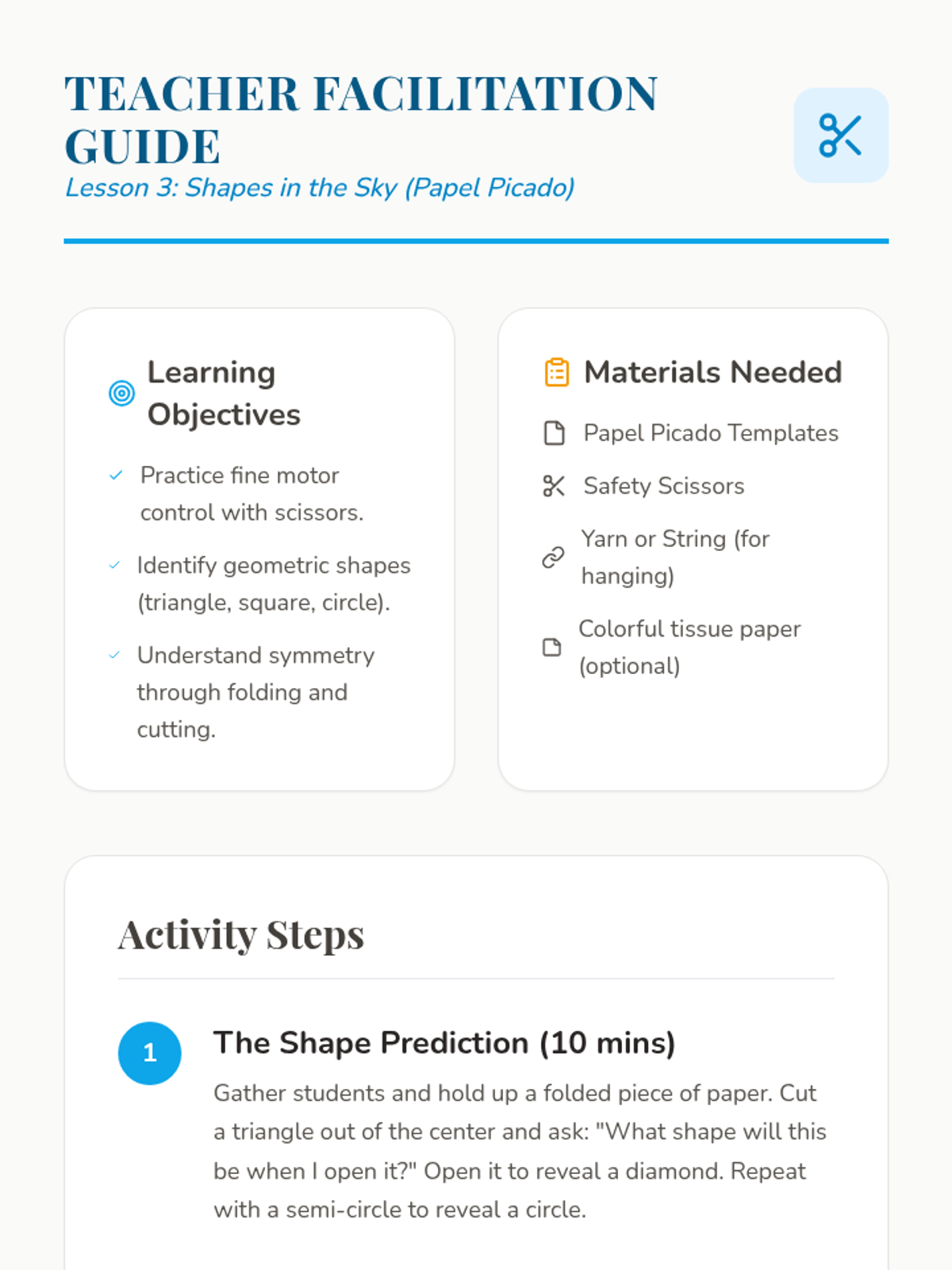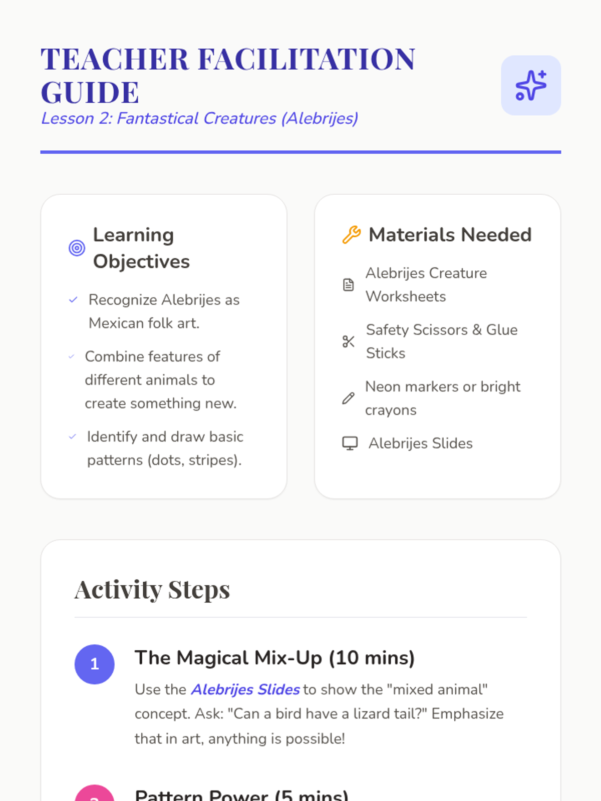 A vibrant visual arts sequence for Kindergarteners exploring Hispanic culture through the works of Frida Kahlo, Mexican Alebrijes, Papel Picado, Talavera pottery, and community murals. Students develop fine motor skills and cultural appreciation while exploring patterns, colors, and storytelling through art.