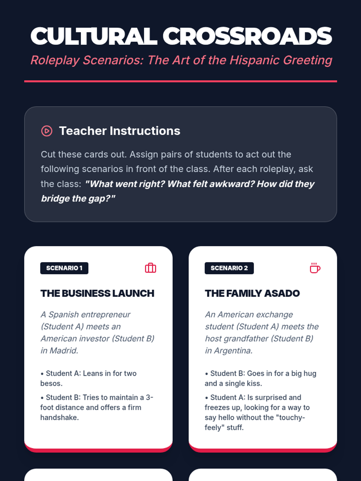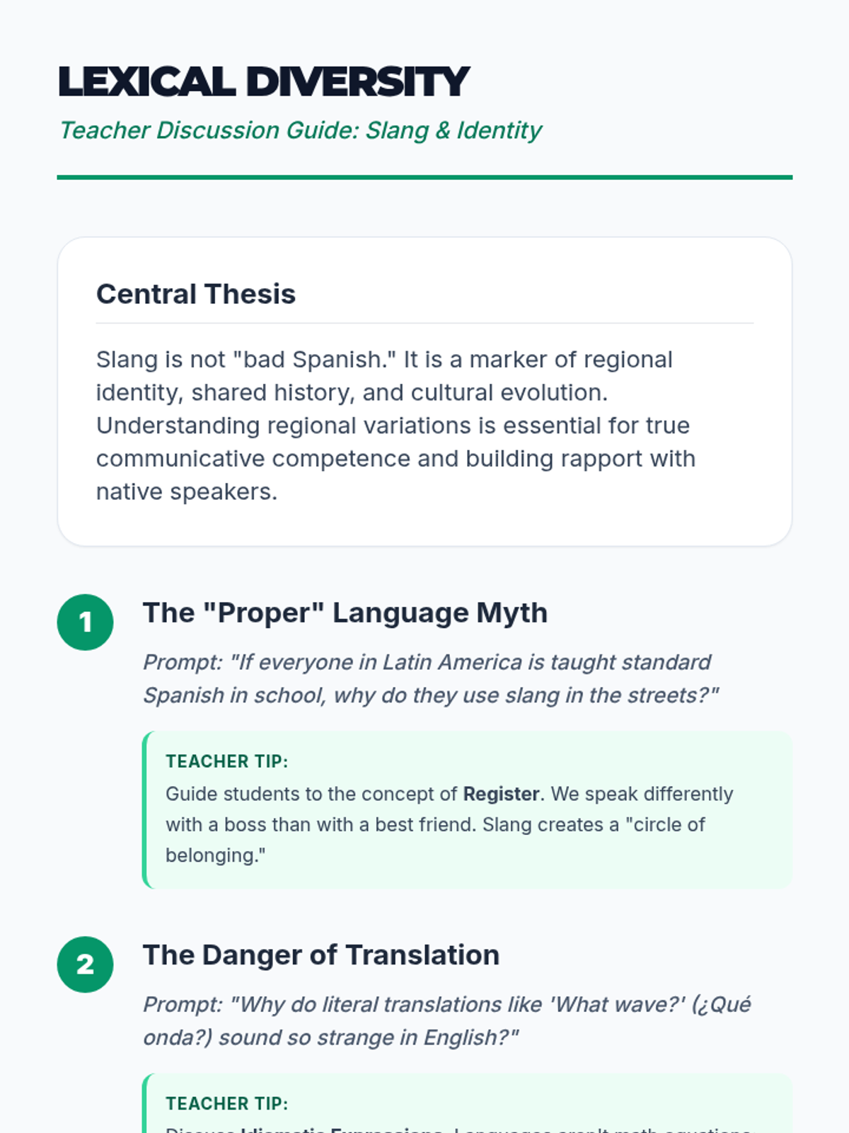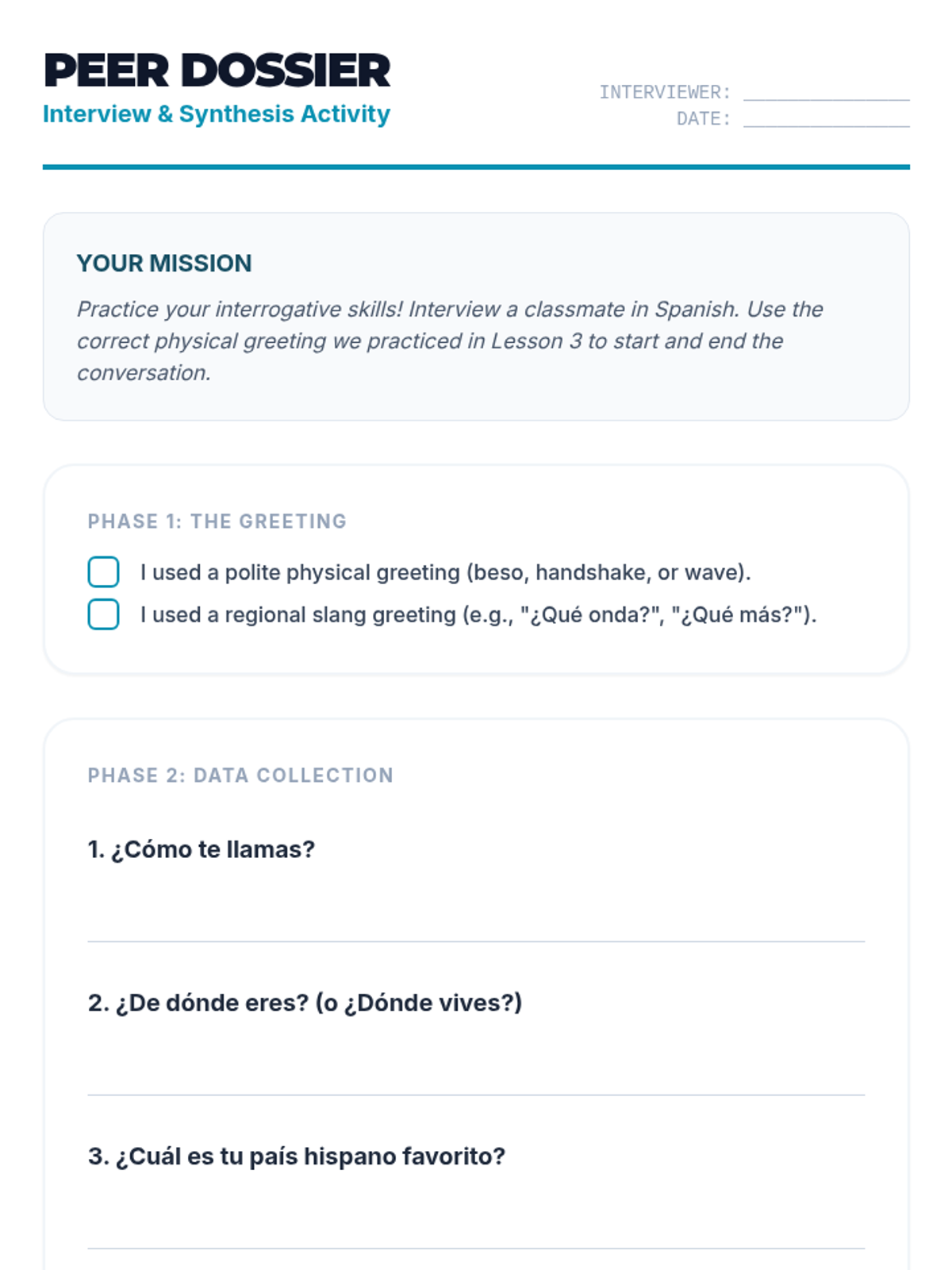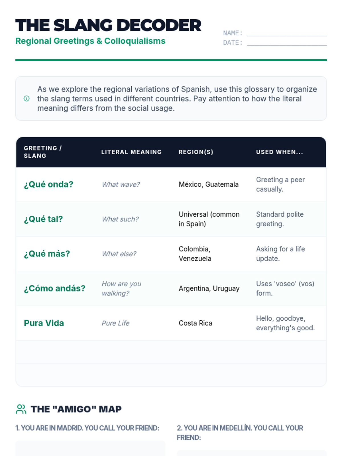 An immersive 11th-grade Spanish sequence exploring the diversity of greetings, regional slang, and cultural norms across the 21 Spanish-speaking countries. Students move from basic geography and nationality to complex cultural interactions and presentational speaking.