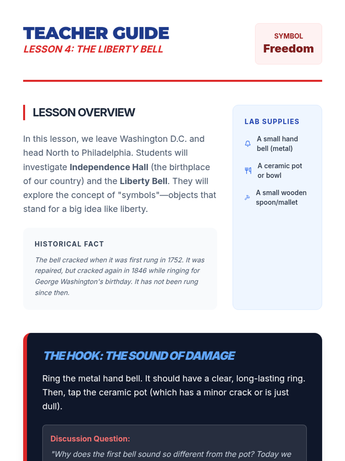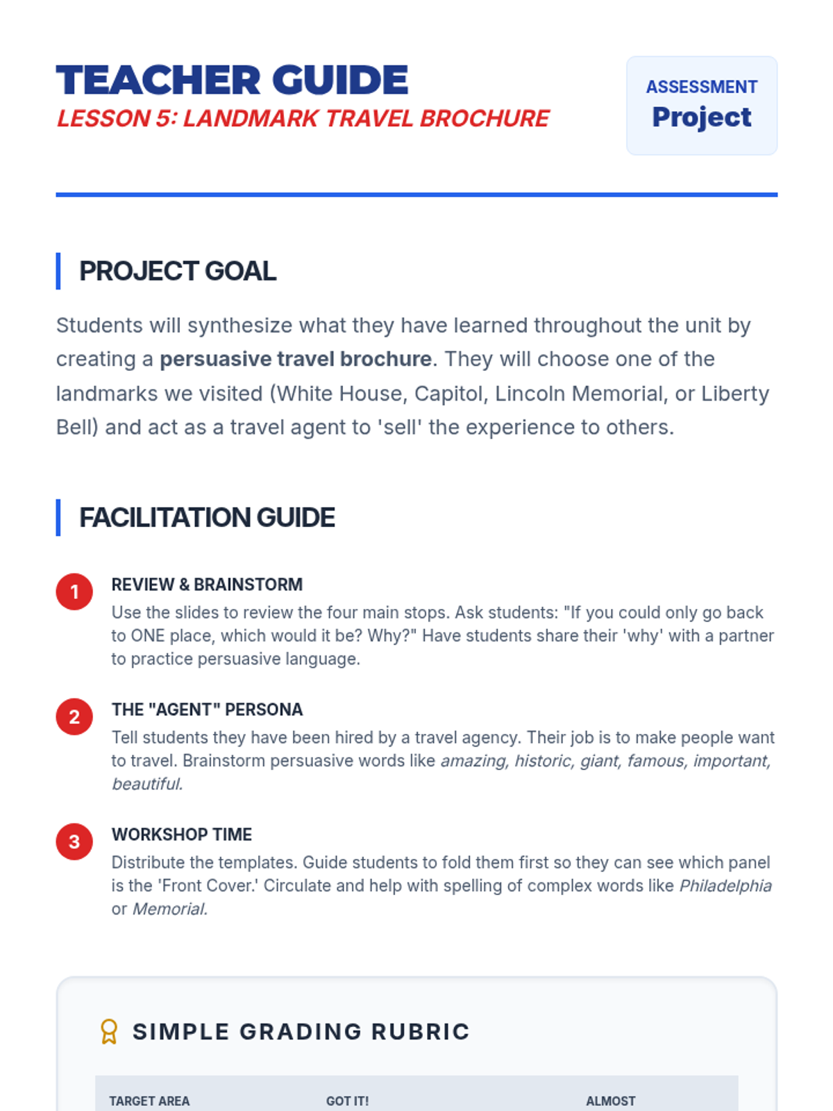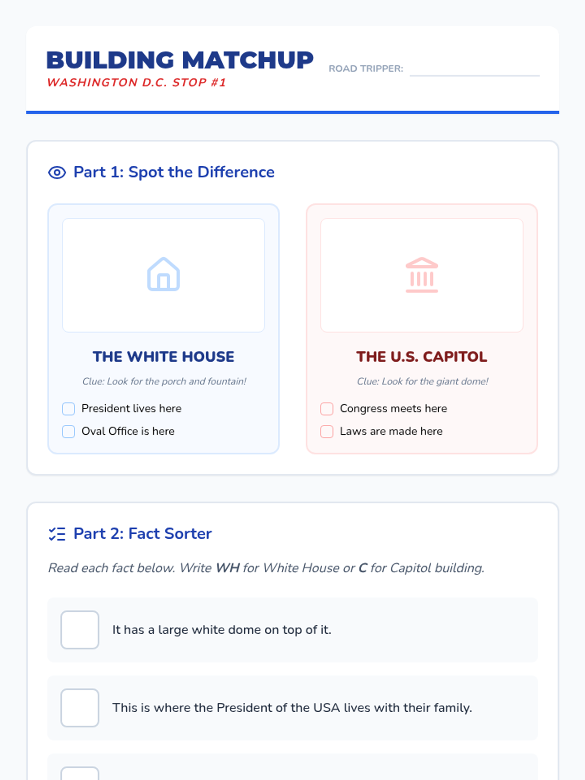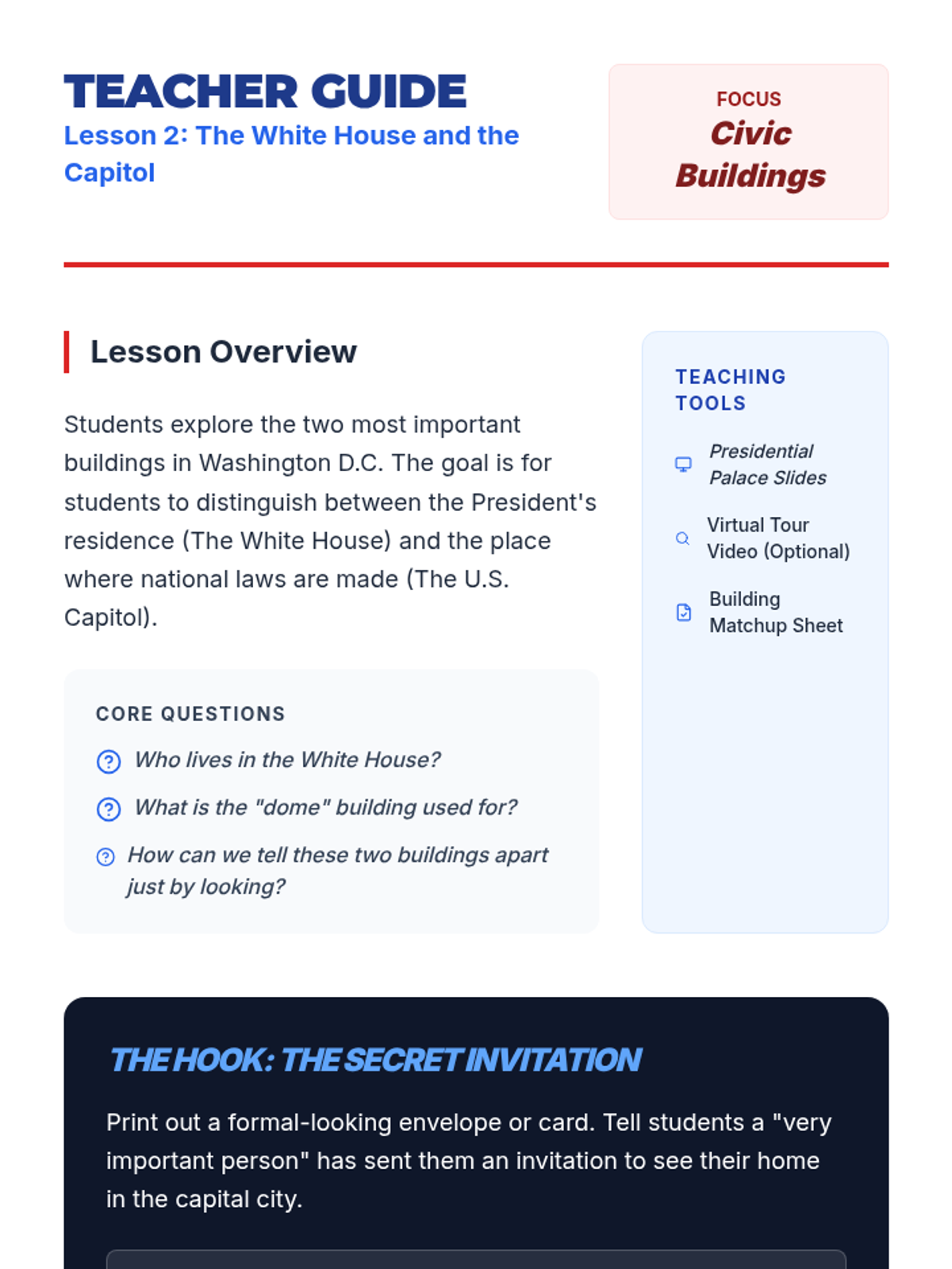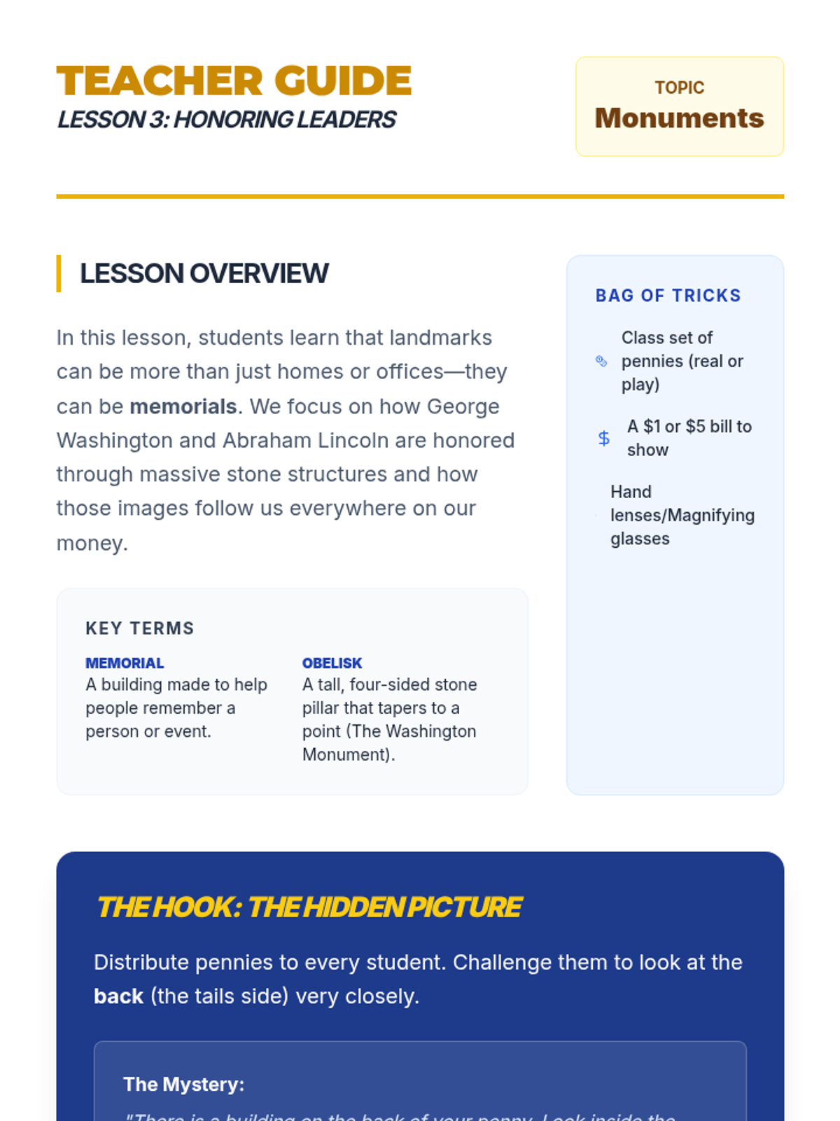 A 2nd-grade social studies unit where students take a virtual road trip across the United States to explore key man-made landmarks and monuments. Students develop map skills, learn the history of iconic sites like the White House and the Liberty Bell, and discover how we honor leaders through architecture and symbols.