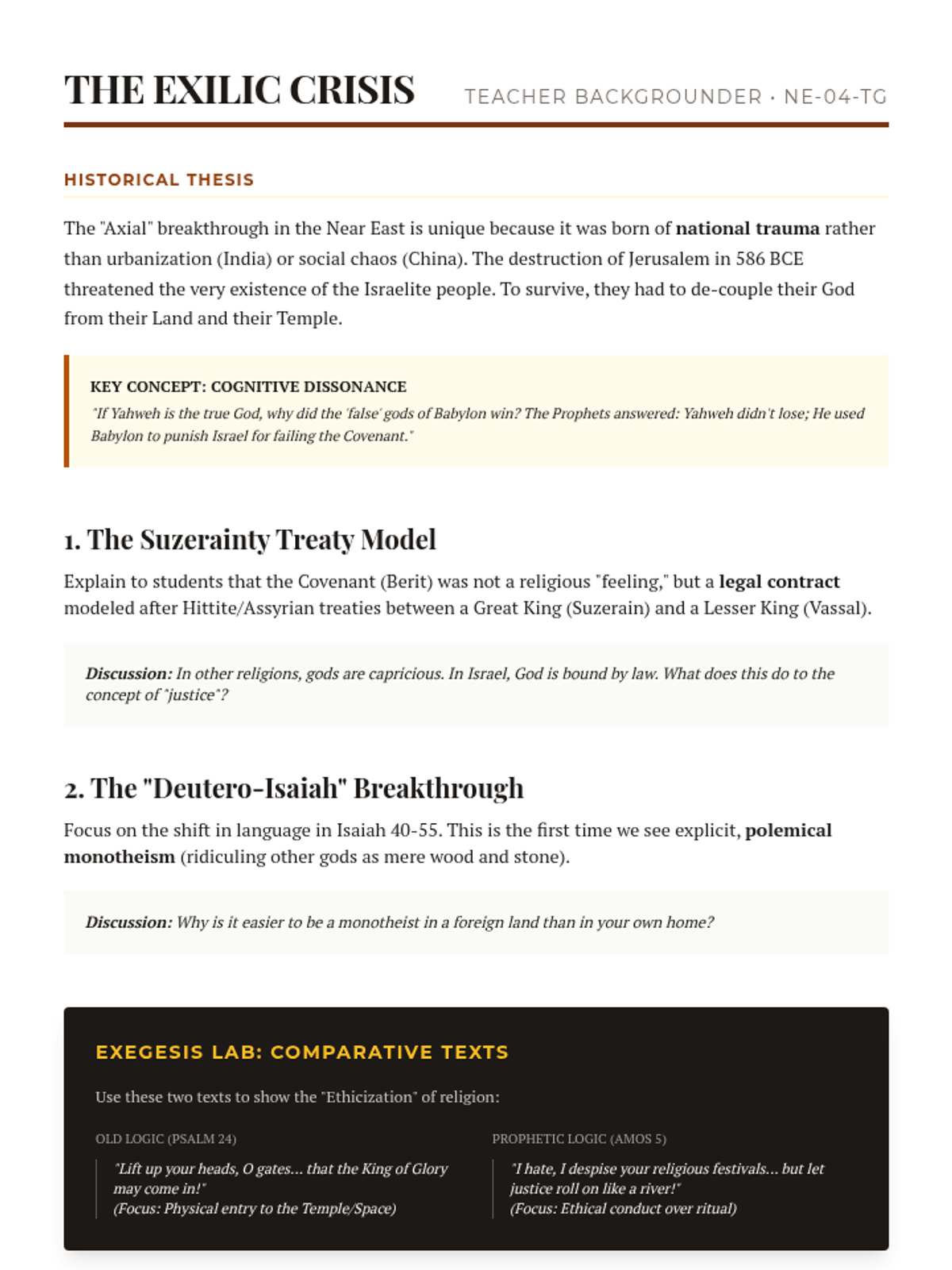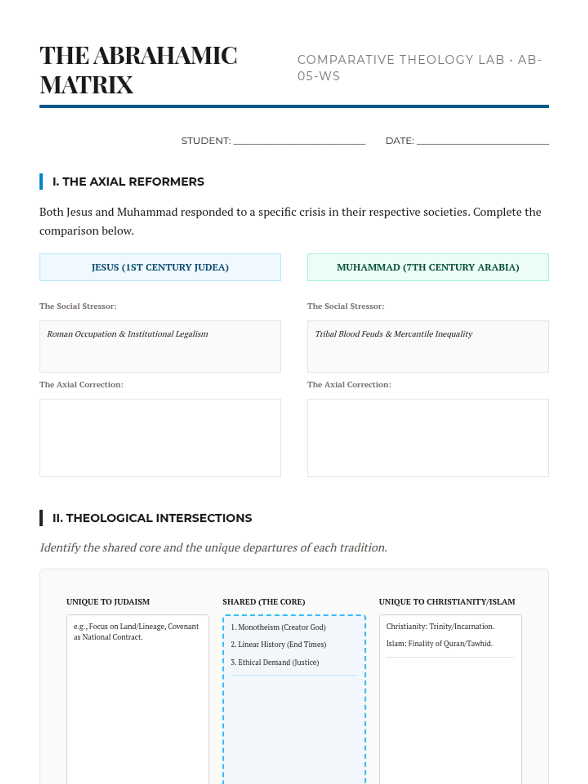 This sequence examines the 'Axial Age' (800–200 BCE) as a pivotal era in human history, investigating how simultaneous social upheavals across Eurasia led to the birth of major world religions and philosophical systems. Students will analyze the transition from ritualistic polytheism to ethical, transcendent traditions in India, China, Greece, and the Near East.