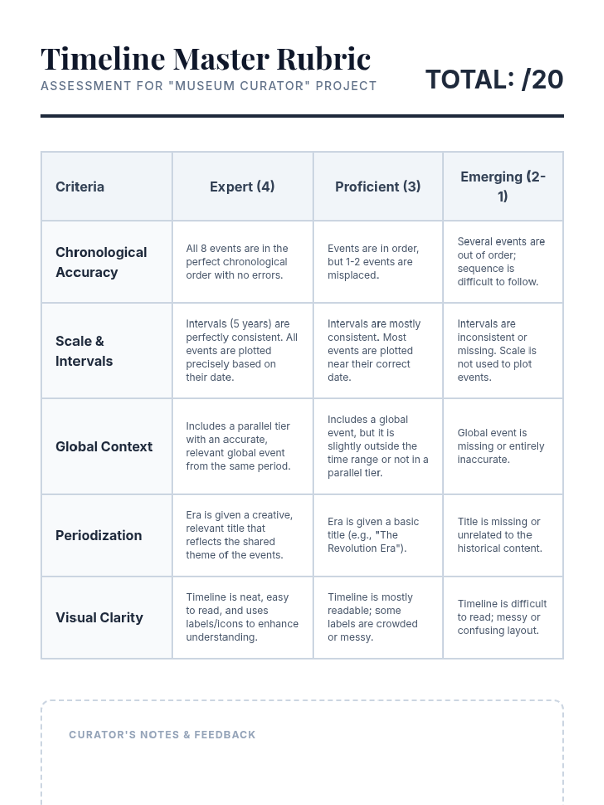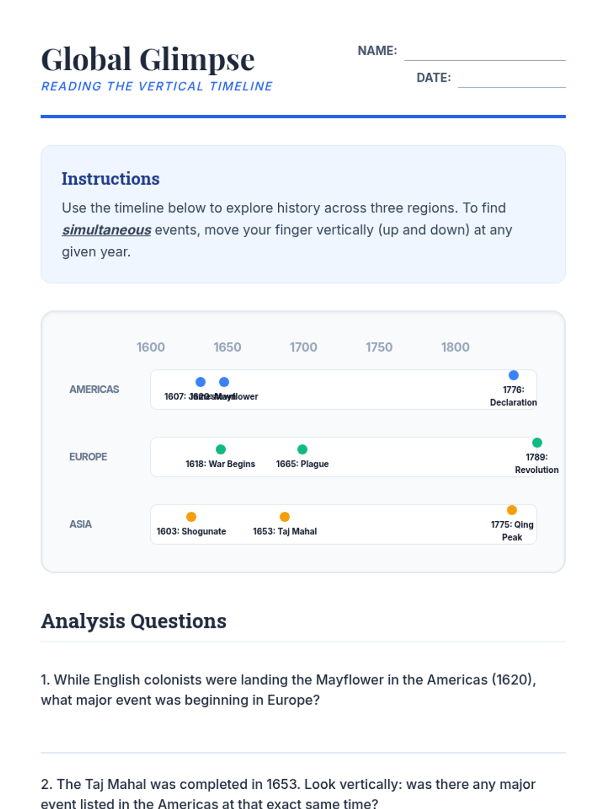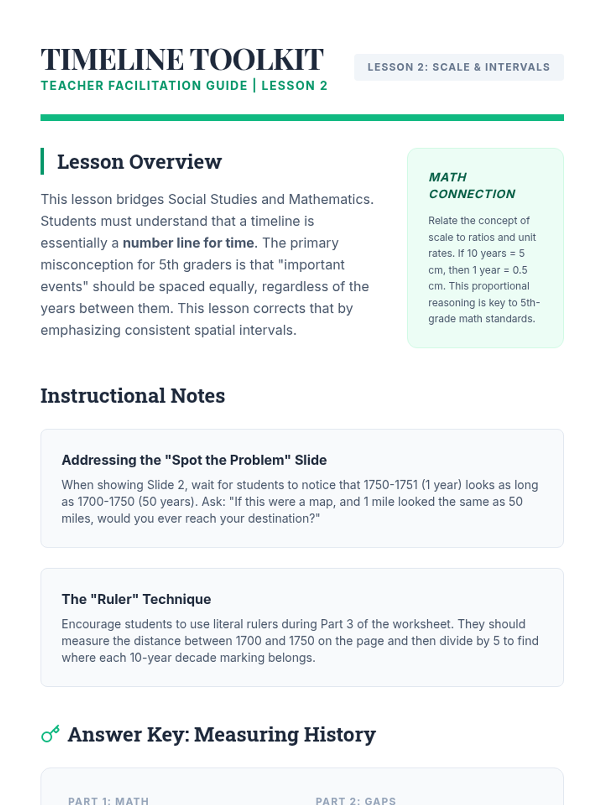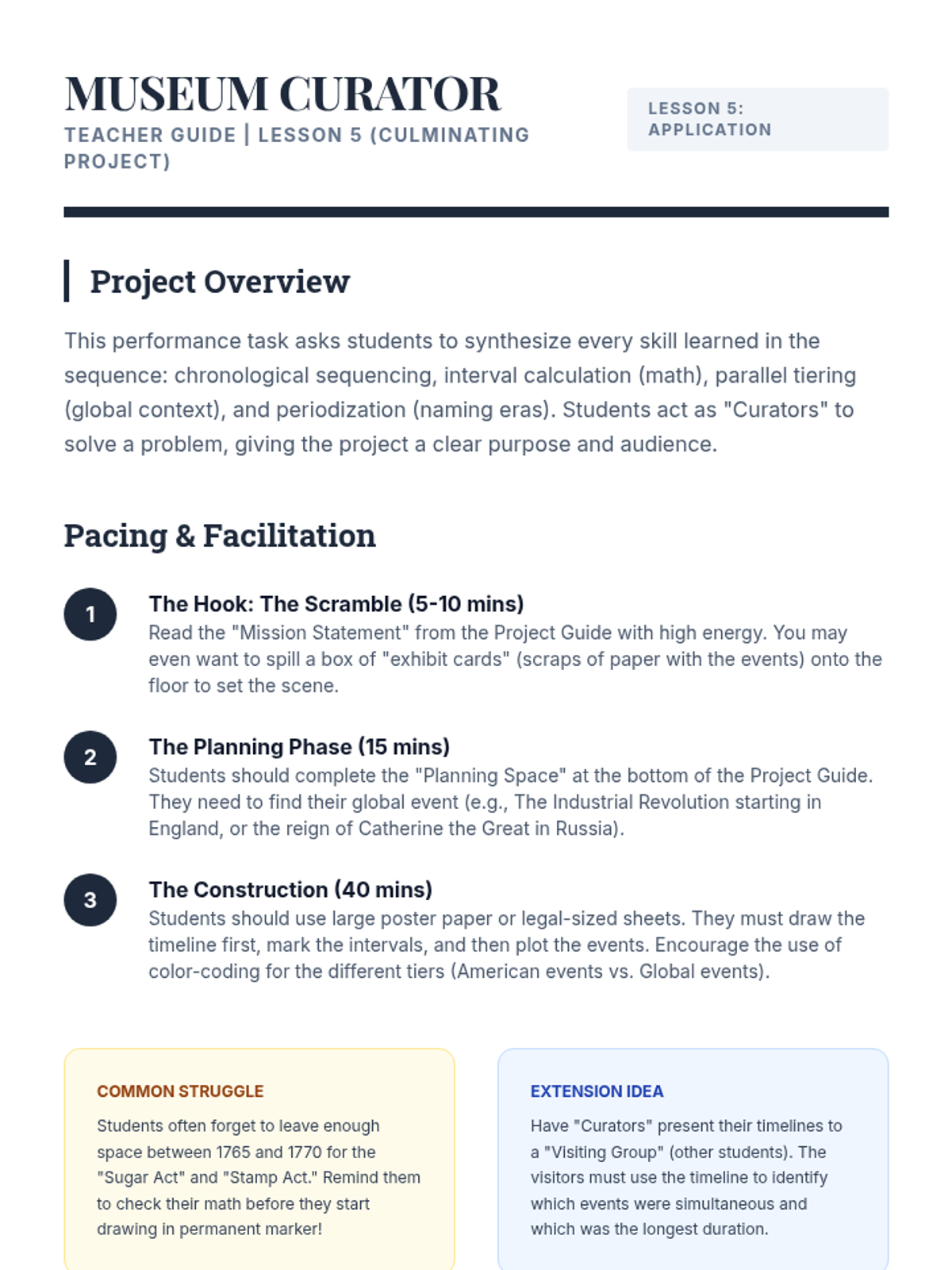 This sequence establishes the foundational mechanics of chronological thinking, moving beyond simple ordering to understanding scale and intervals. Students progress from personal timelines to complex historical representations, emphasizing scale, periodization, and concurrent global events.