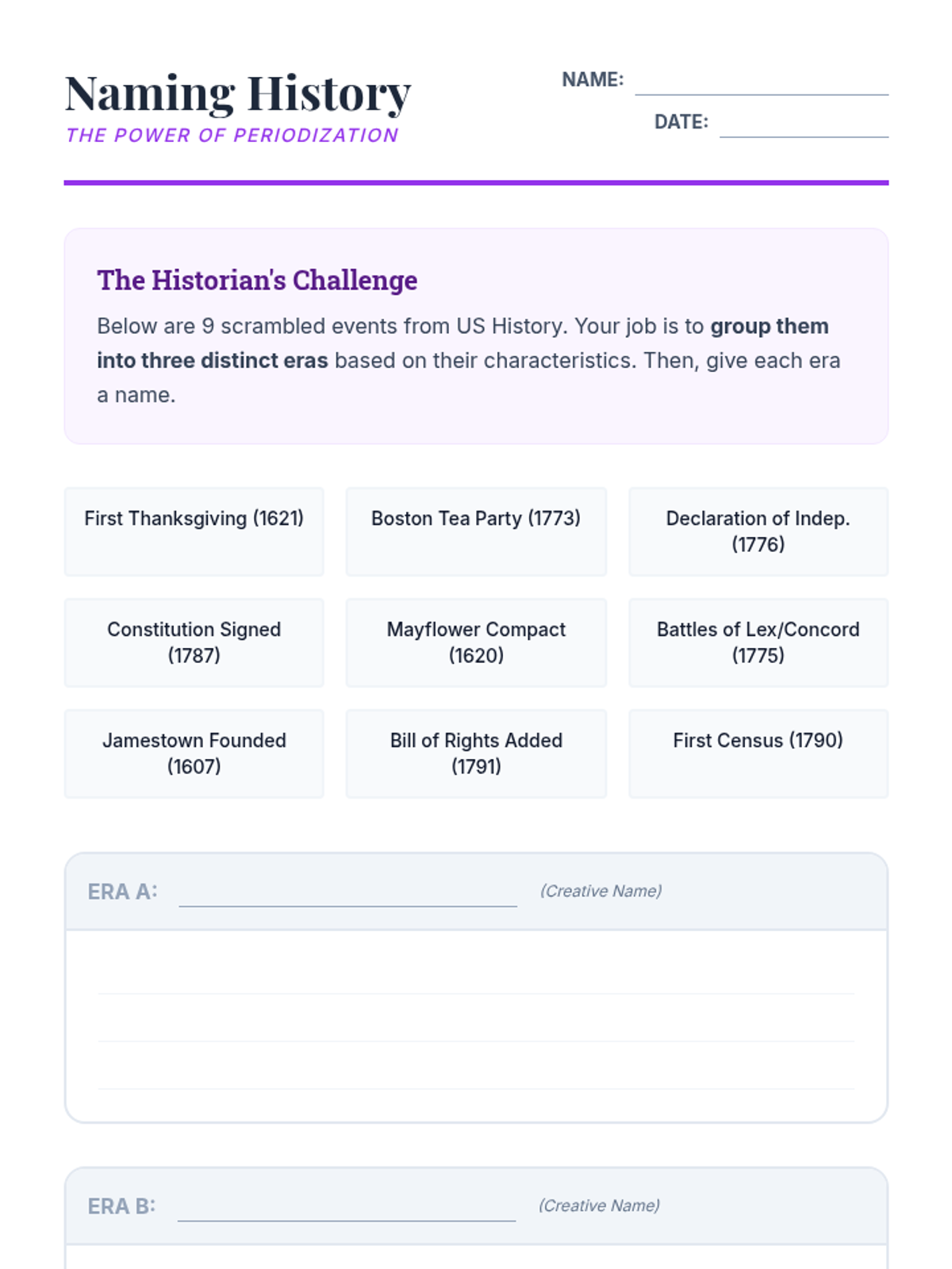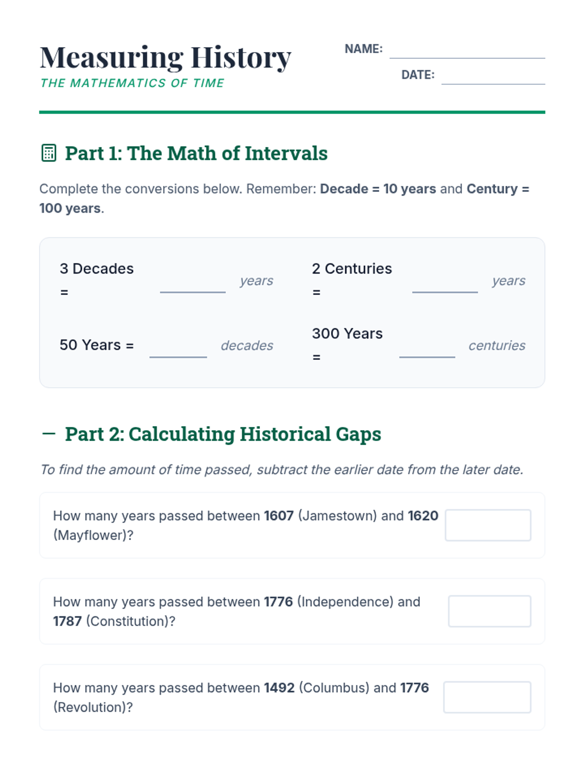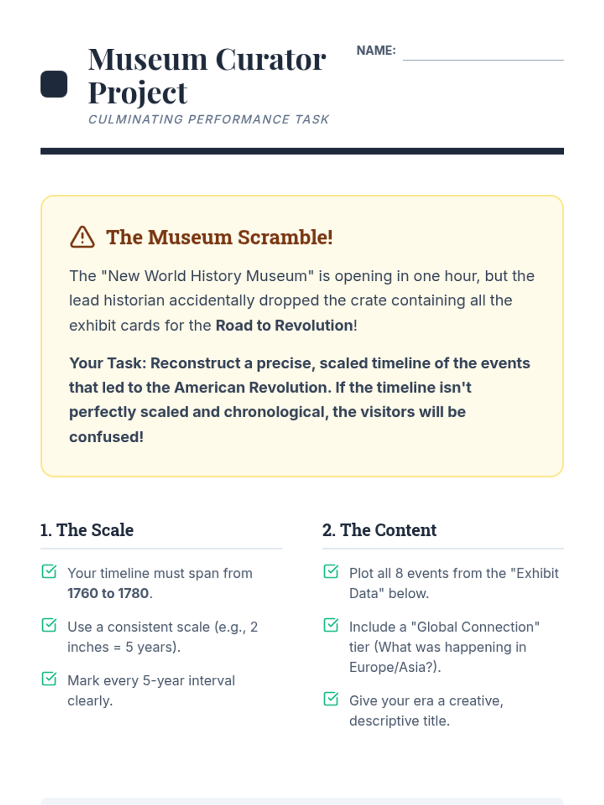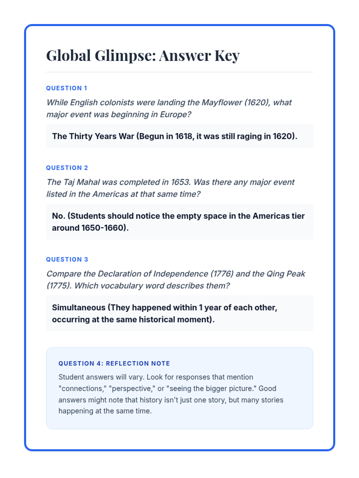 This sequence establishes the foundational mechanics of chronological thinking, moving beyond simple ordering to understanding scale and intervals. Students progress from personal timelines to complex historical representations, emphasizing scale, periodization, and concurrent global events.