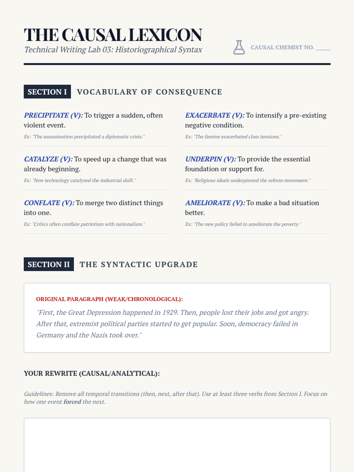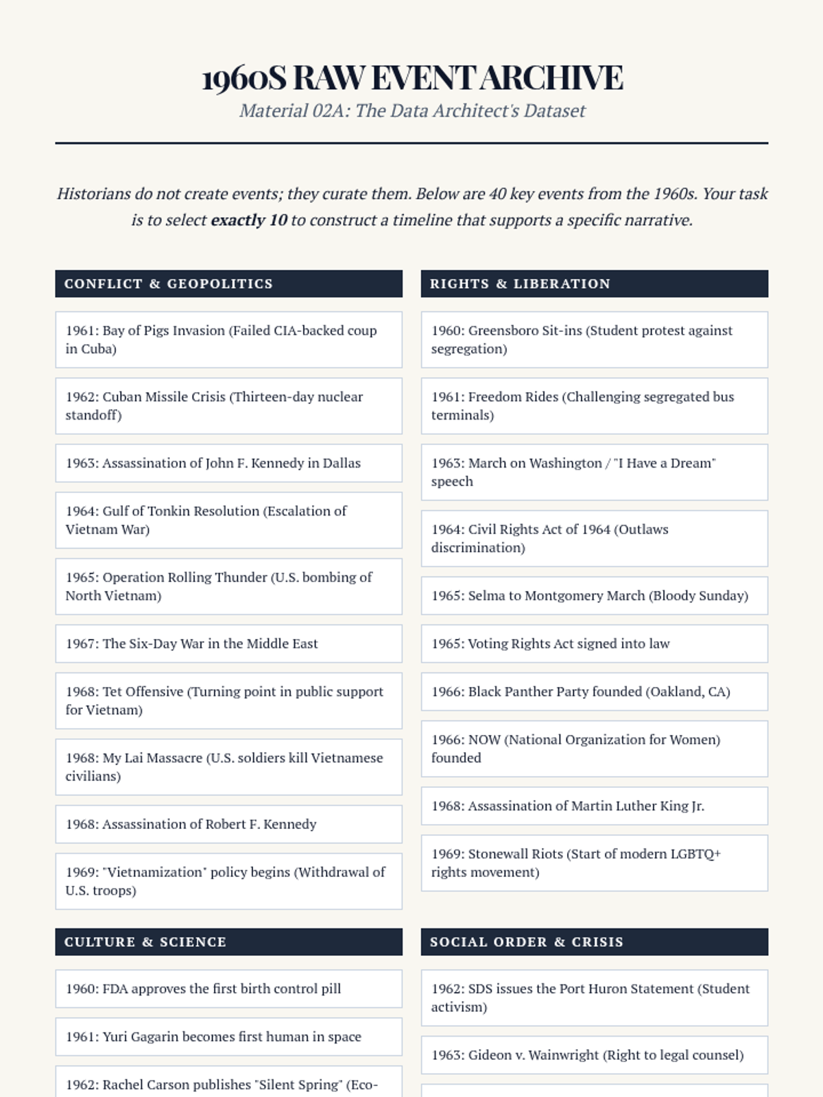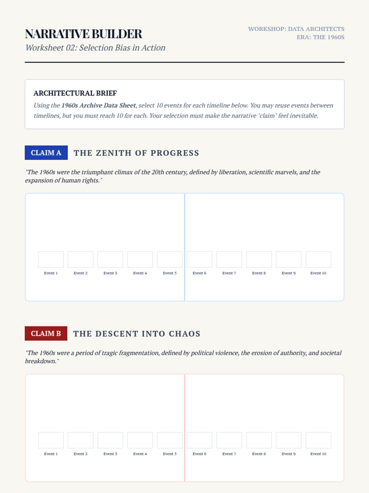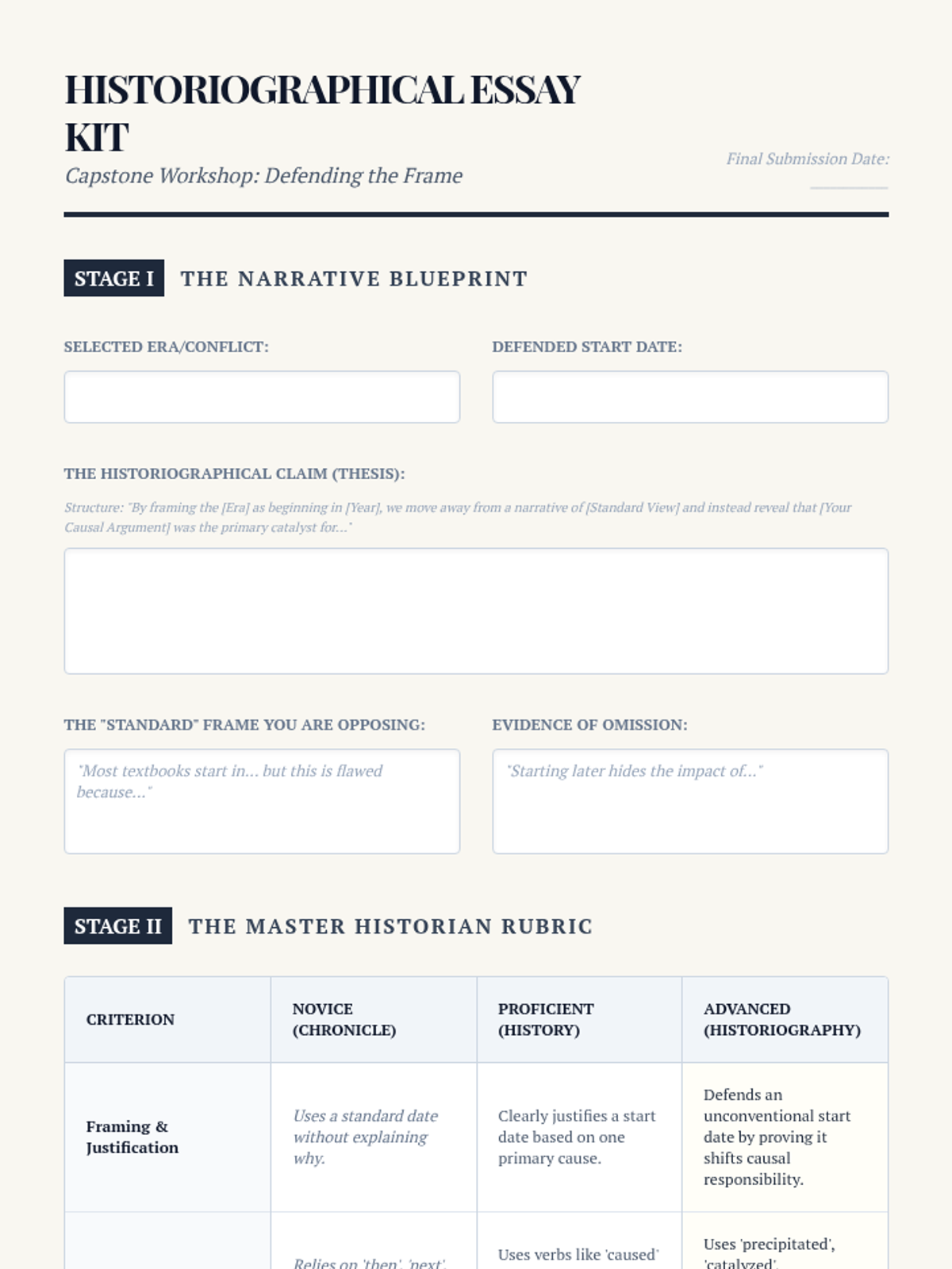 A high-level workshop sequence for 12th-grade historians exploring how periodization and chronological framing shape historical truth. Students move from analyzing textbook biases to crafting a formal historiographical essay that justifies a specific temporal frame.