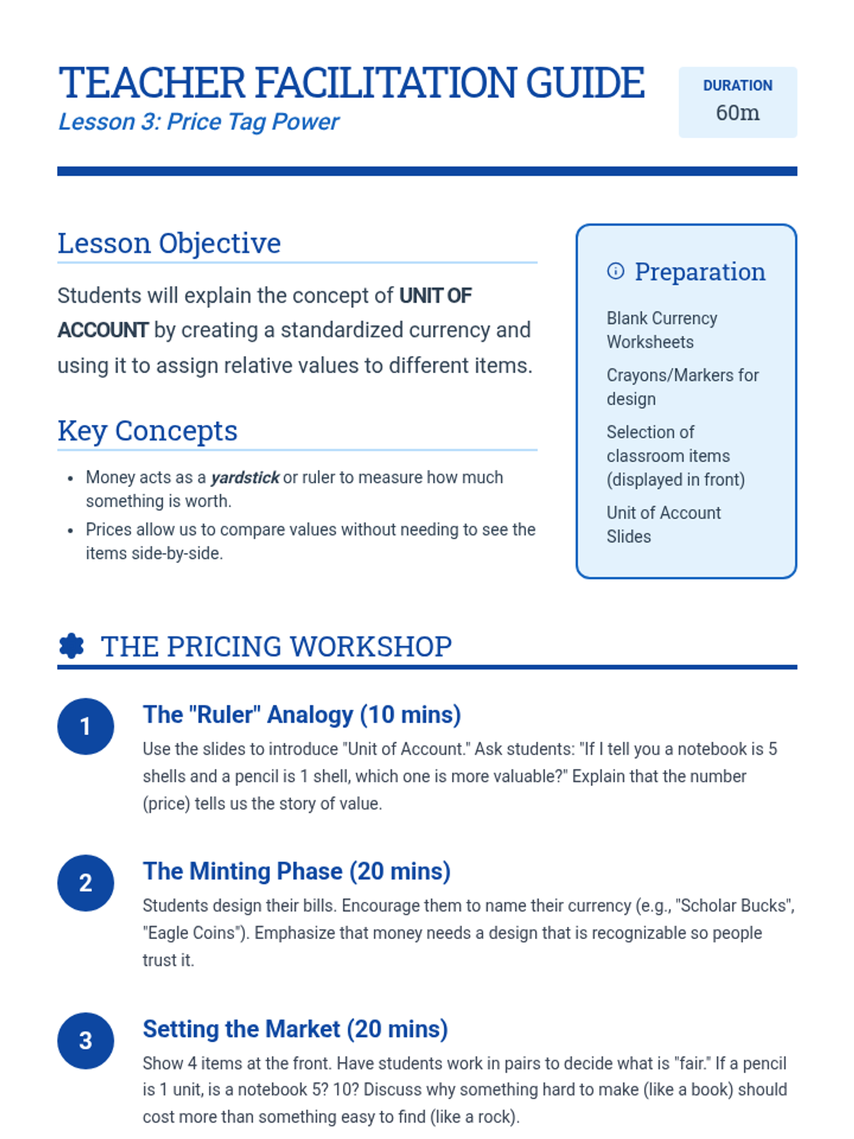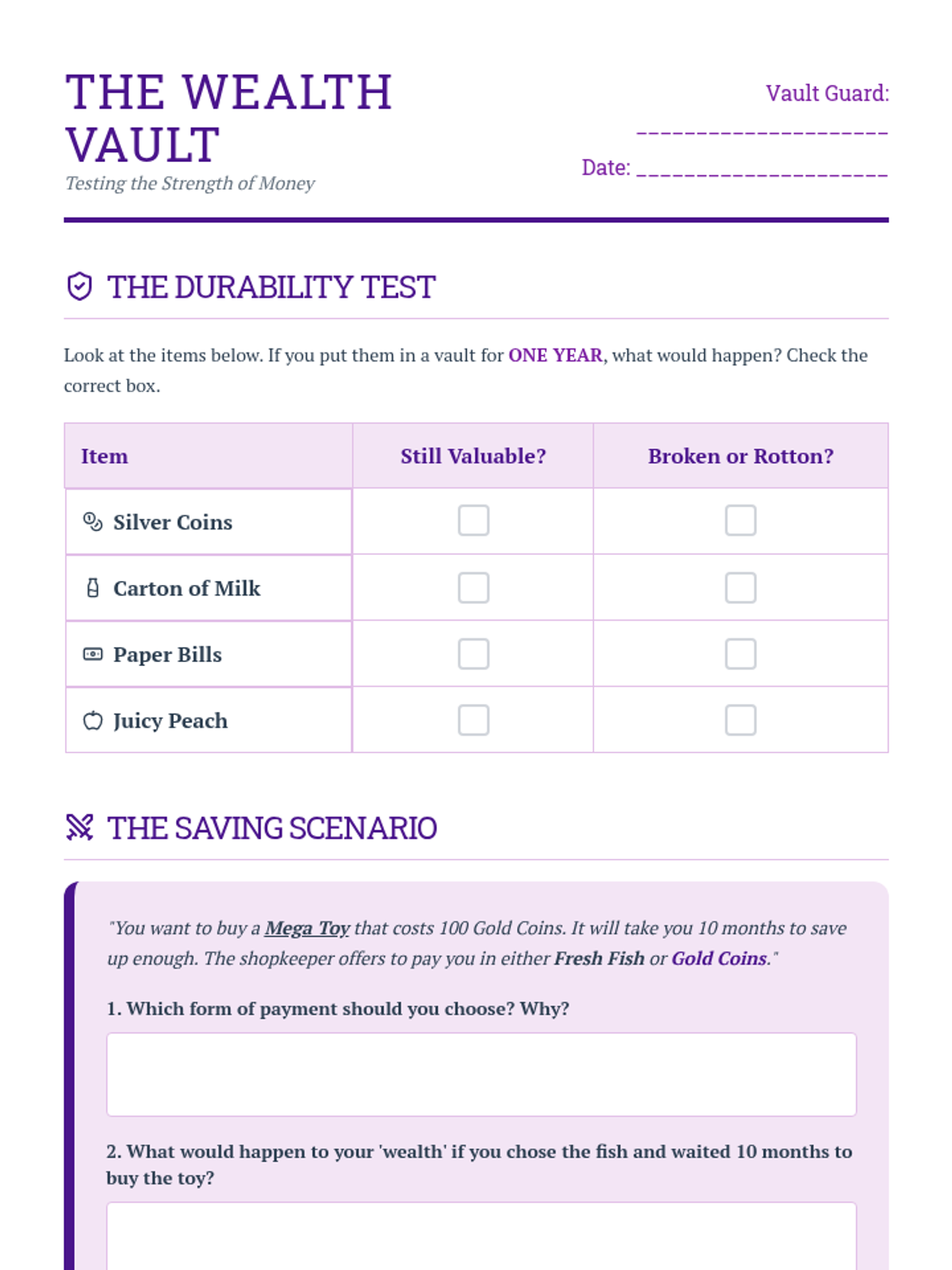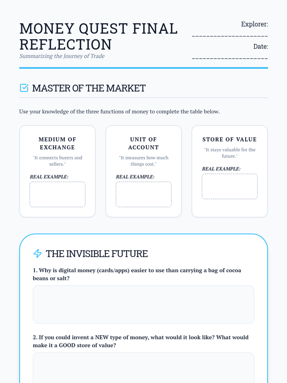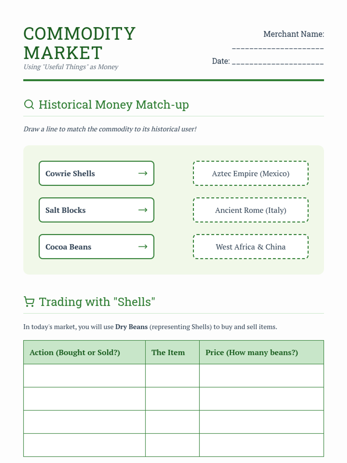 Students explore the evolution of money from the barter system to digital currency, identifying the three primary functions of money: medium of exchange, unit of account, and store of value. through hands-on simulations and creative workshops.