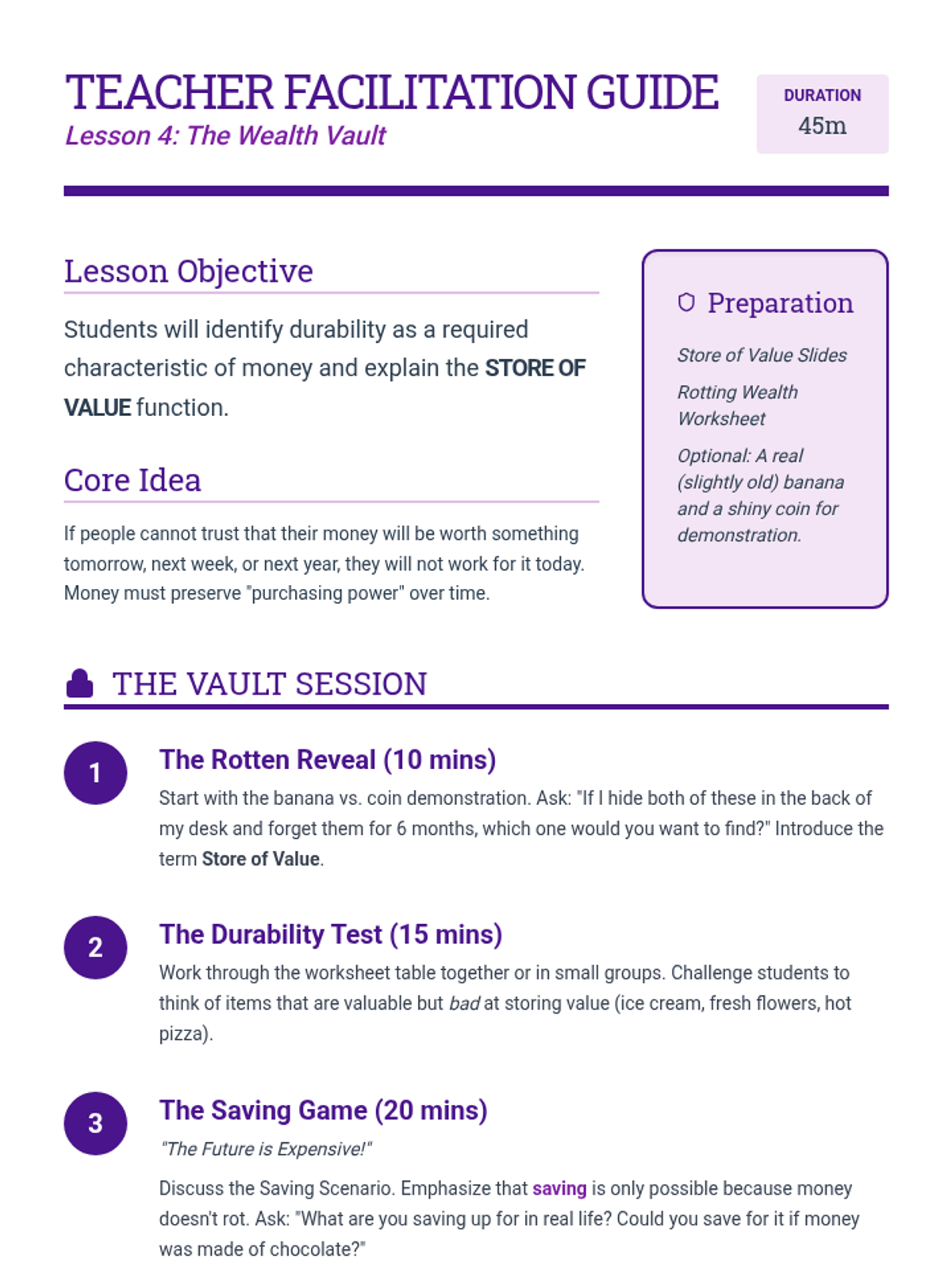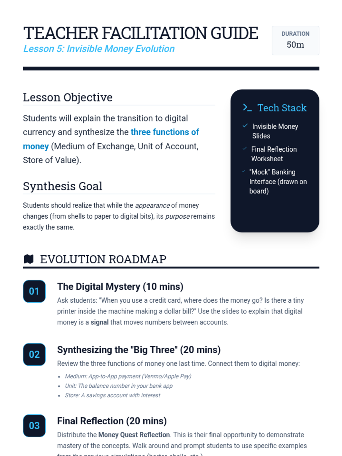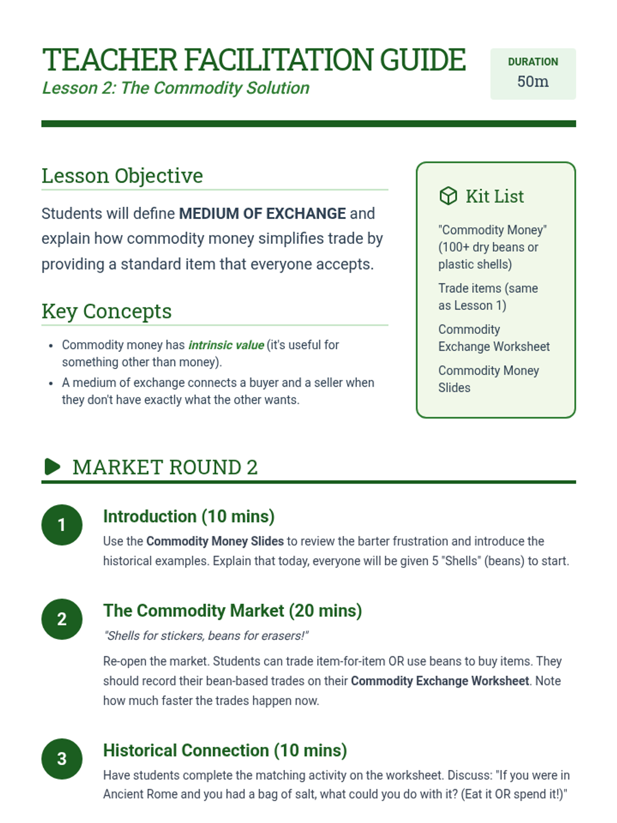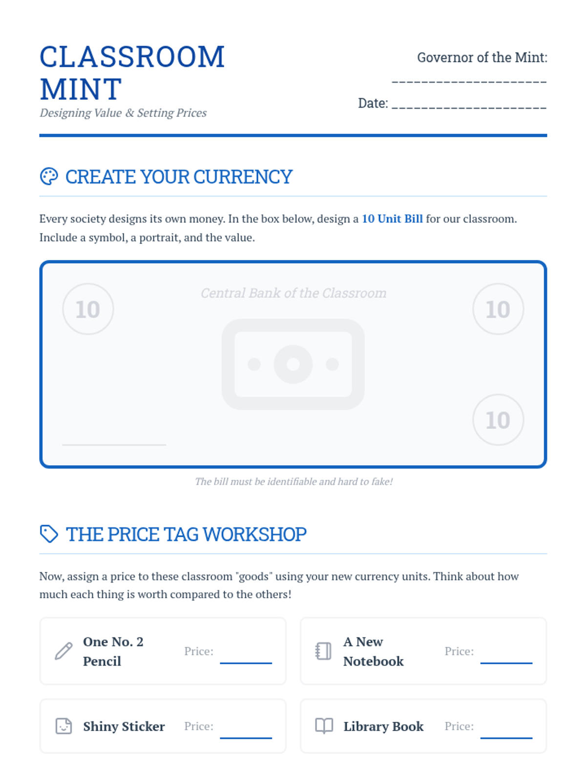 Students explore the evolution of money from the barter system to digital currency, identifying the three primary functions of money: medium of exchange, unit of account, and store of value. through hands-on simulations and creative workshops.