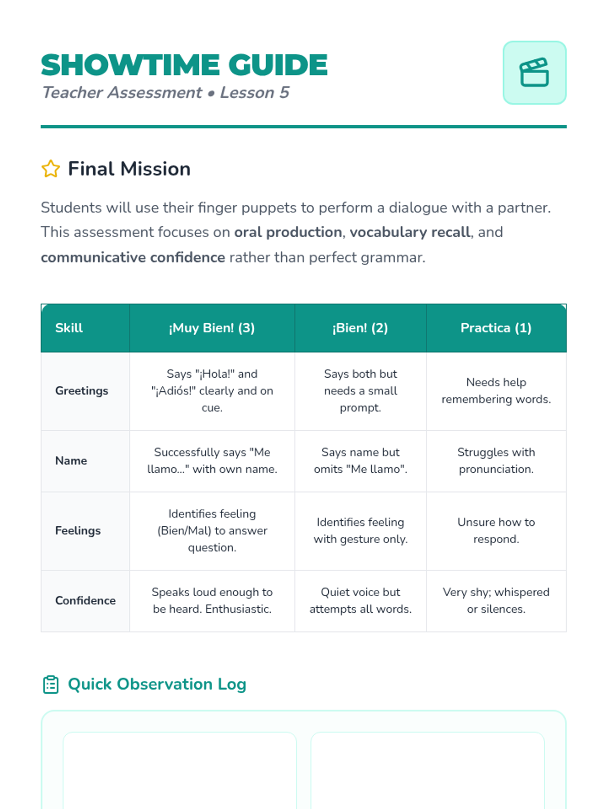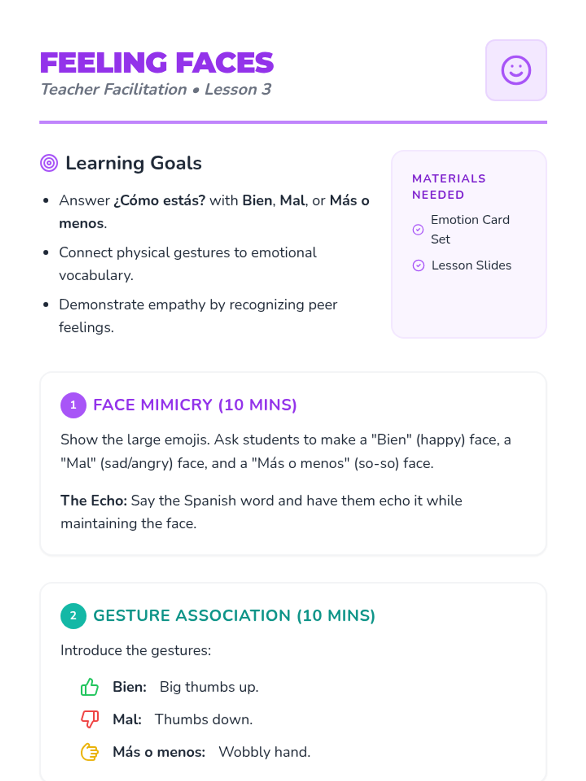 A foundational Spanish sequence for Kindergarteners focusing on greetings, introductions, feelings, and basic politeness through immersive play, songs, and movement.